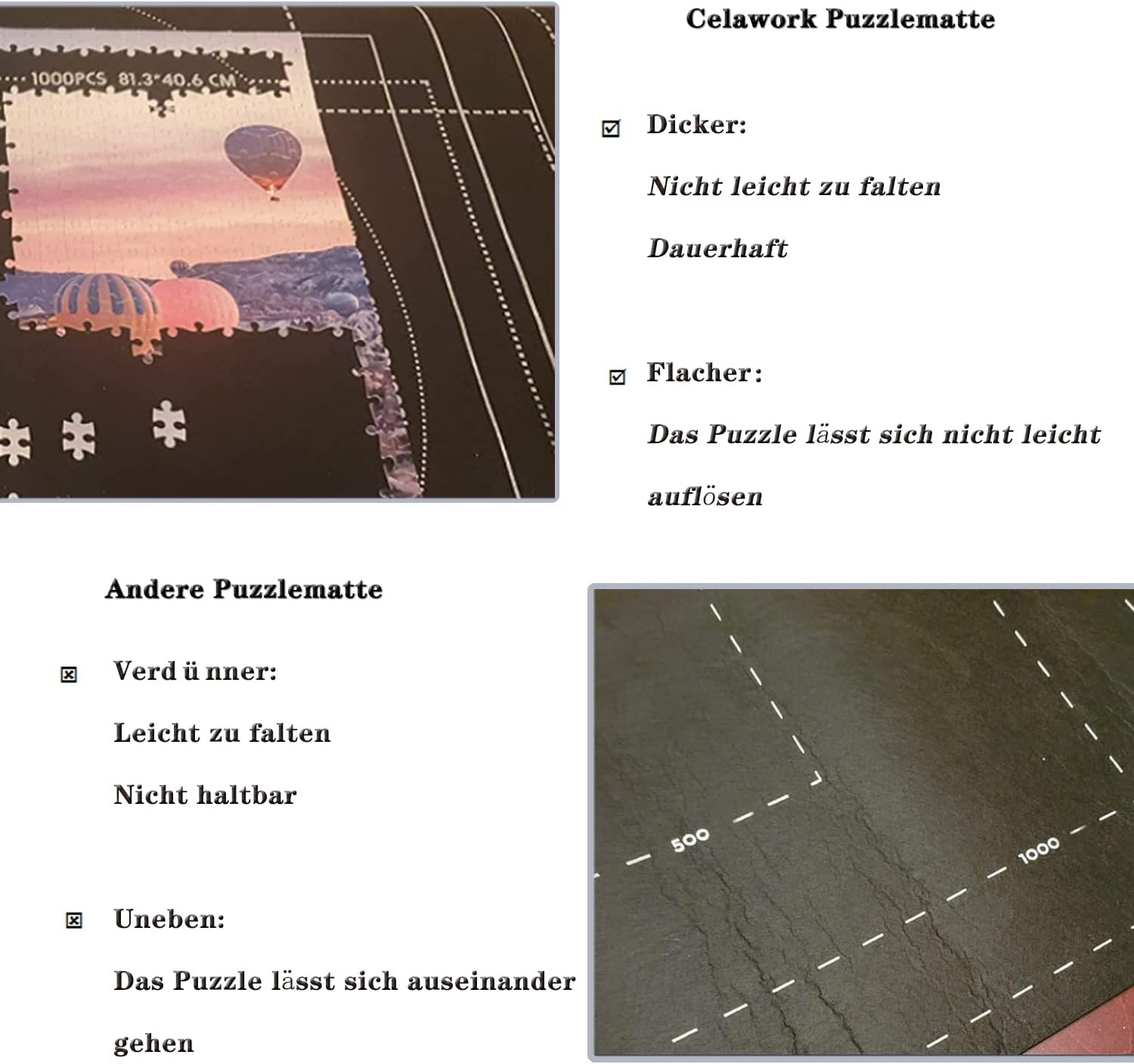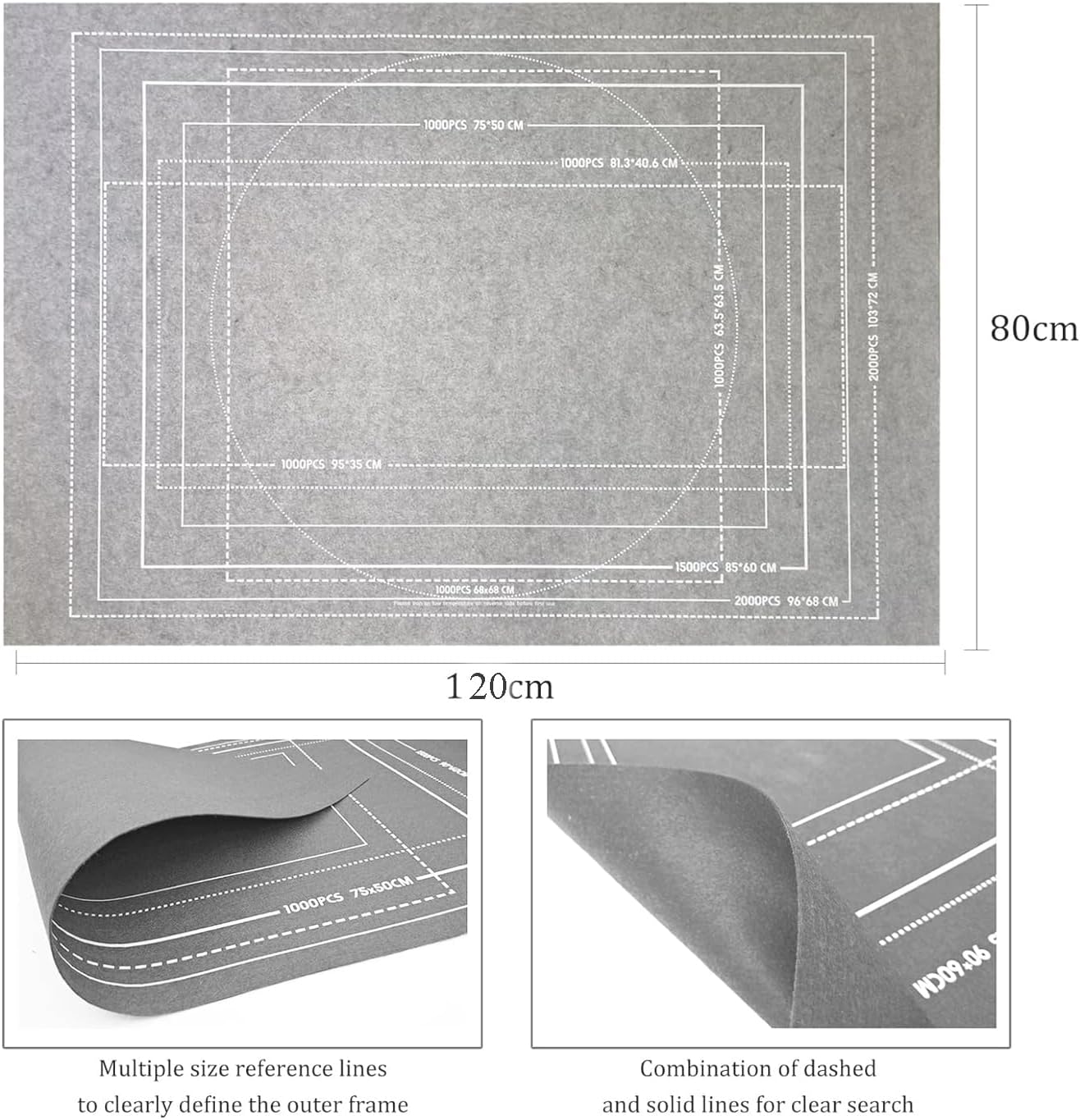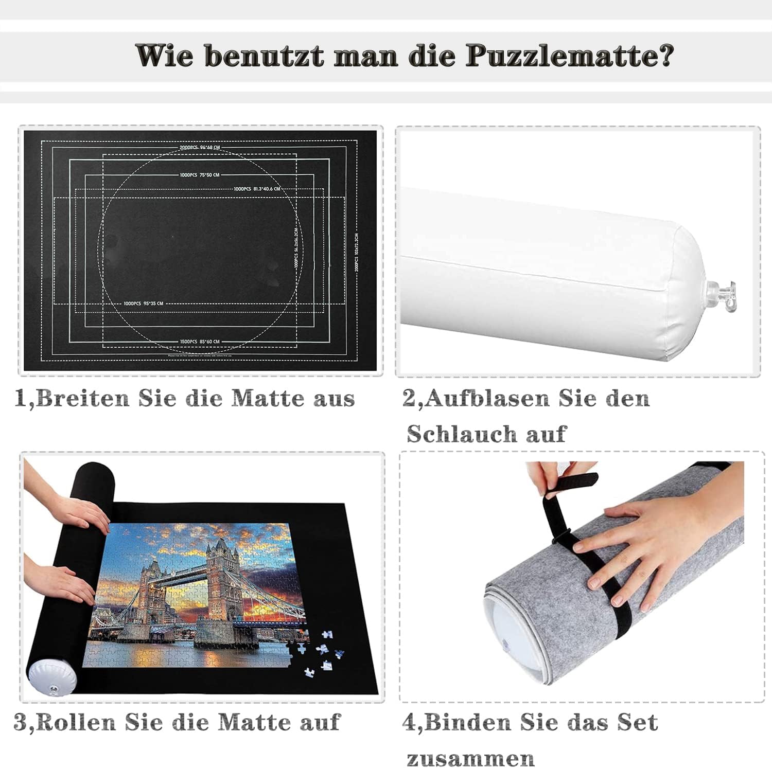Contenuto della confezione: 1 tappetino in feltro antiscivolo per 500/1000/1500 pezzi, 1 tubo gonfiabile, 3 cinghie regolabili, dimensioni: 80 x 120 cm.,Facile da riporre e trasportare: conserva o completa i tuoi puzzle con questo gommone e tappetino scorrevole facili da usare. Non solo mantiene tutte le parti al loro posto, ma il tubo compatto può anche essere impacchettato e portato ovunque.,Design unico anti-perdite: con una fessura anti-perdite, dura più a lungo quando gonfiato rispetto ad altri tubi sul mercato. Si prega di premere la valvola con le dita per aprire la fessura e soffiare aria per gonfiare il tubo. I pezzi del puzzle aderiscono al feltro e non scivolano avanti e indietro.