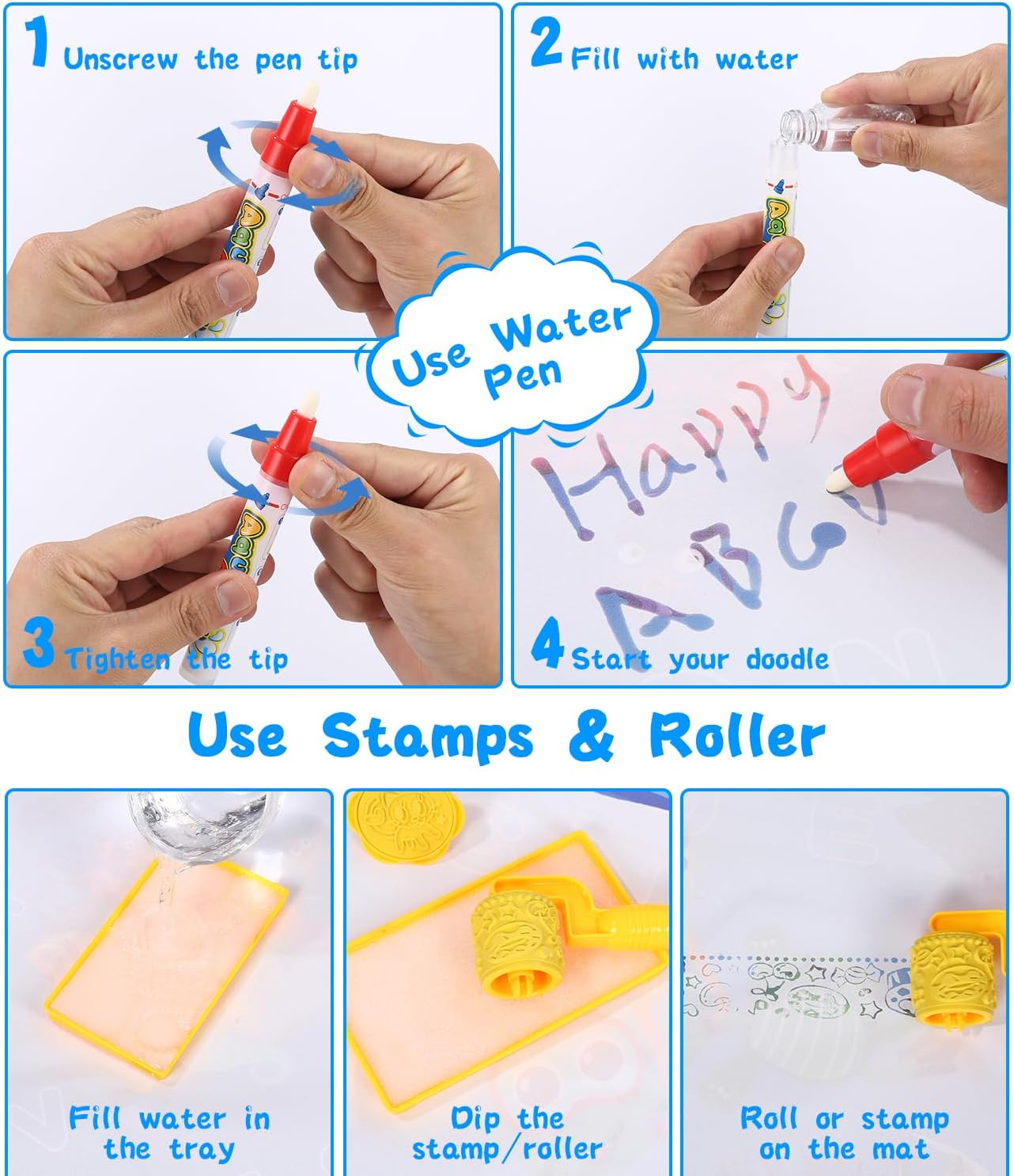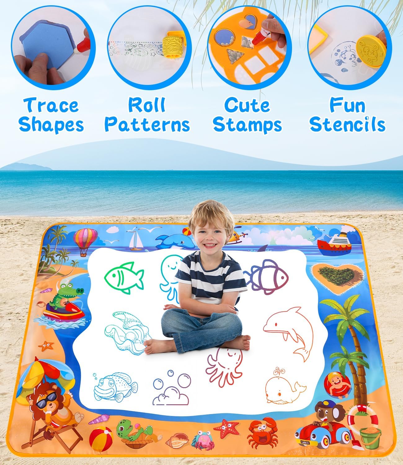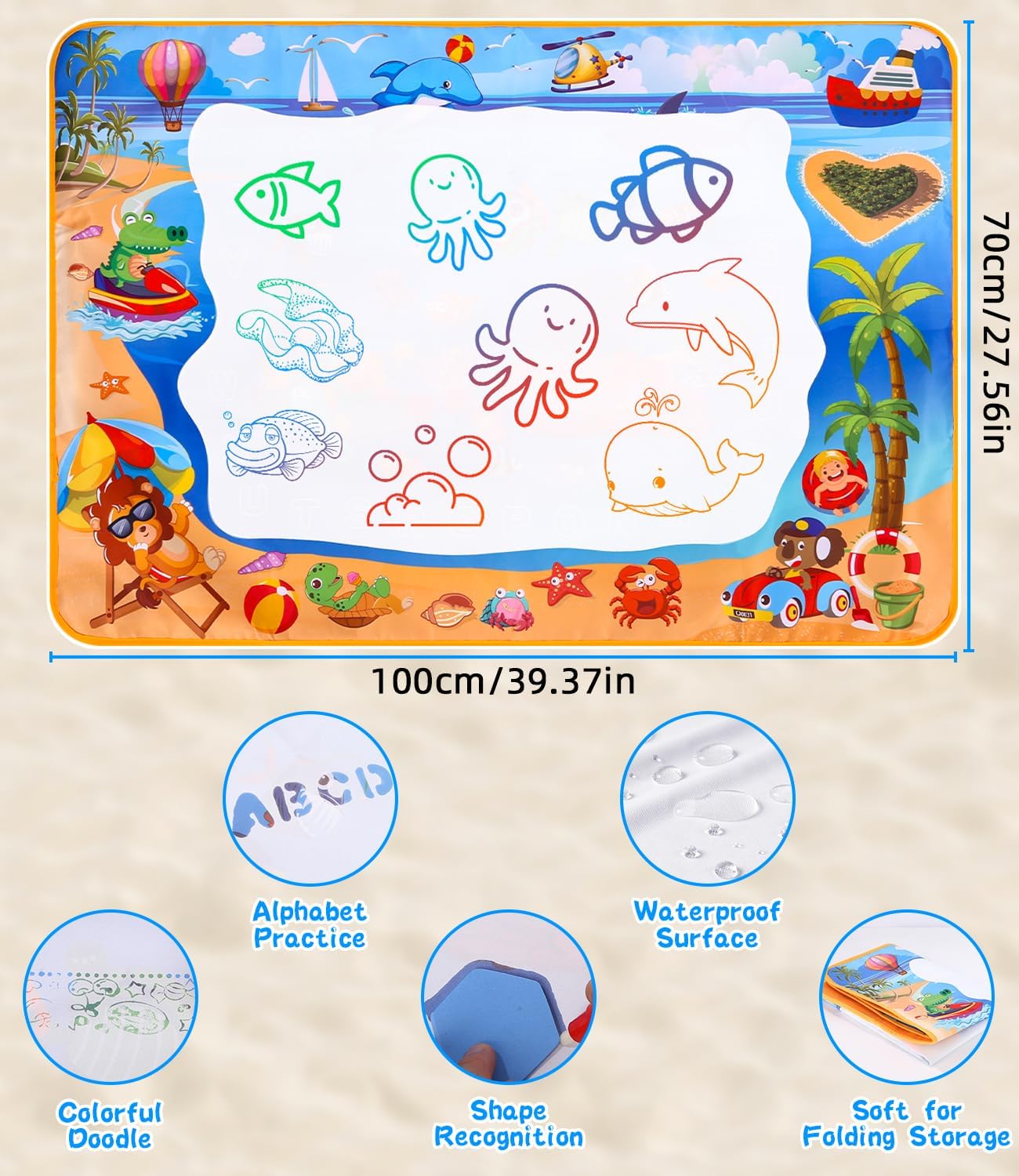 Tappeto d'acqua bambini per uno spazio creativo illimitato: Il nostro ampio tappeto d'acqua misura 100 x 70 cm, offrendo spazio sufficiente per il gioco con più bambini o con i genitori. Leggero e pieghevole, è facile da trasportare e perfetto per giochi sia all'interno che all'esterno. Ideale per viaggi o picnic, perfetto come giochi bimba 1-4 anni. Sicuro ed ecologico: Il tappeto d'acqua è realizzato in tessuto non tessuto in poliestere di alta qualità sulla parte anteriore e PVC impermeabile sul retro. Questo materiale resistente e riutilizzabile è sicuro, atossico ed ecologico, ideale per i più piccoli. Perfetto come giochi educativi 2 anni, è facile da pulire e sicuro per i bambini. Accessori vari per un divertimento creativo: Il set include 5 penne ad acqua, 4 stampi da disegno, 8 formine da disegno, 3 timbri e 1 rullo magico. I numerosi accessori offrono innumerevoli possibilità di gioco e rendono ogni disegno sul tappeto d'acqua colorato e unico. Ottimo per stimolare l'immaginazione e la creatività, perfetto come regalo bimba 2 anni. Facile da usare e riutilizzabile: Basta riempire la penna con acqua e disegnare sul tappeto magico bambini. I disegni svaniscono dopo circa 10 minuti senza lasciare tracce. Grazie al retro impermeabile, il disegno è pulito e adatto ai bambini, perfetto per divertirsi senza macchie. Apprendimento attraverso il gioco: Disegnare sul tappeto d'acqua aiuta a sviluppare la motricità fine, la coordinazione occhio-mano e la capacità di riconoscere colori e forme. Questo giochi educativi 4 anni è un regalo ideale per stimolare la curiosità e incoraggiare l'interazione sociale.