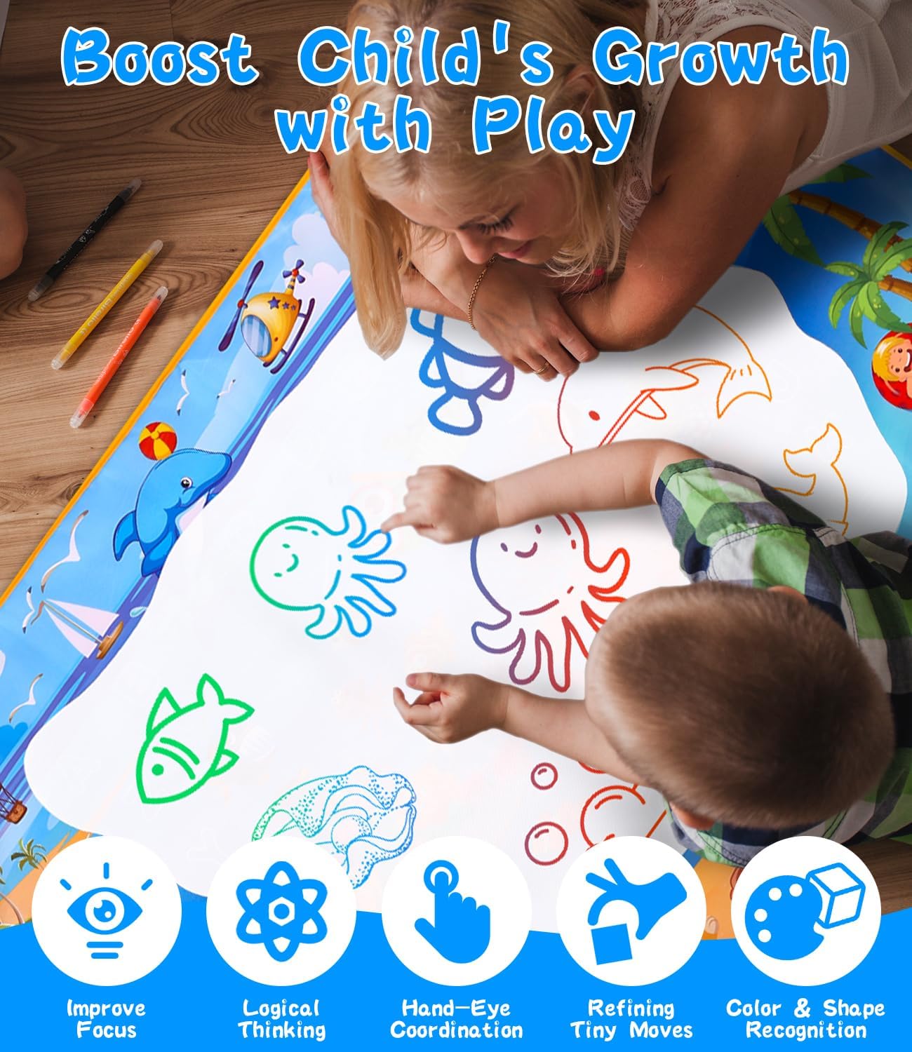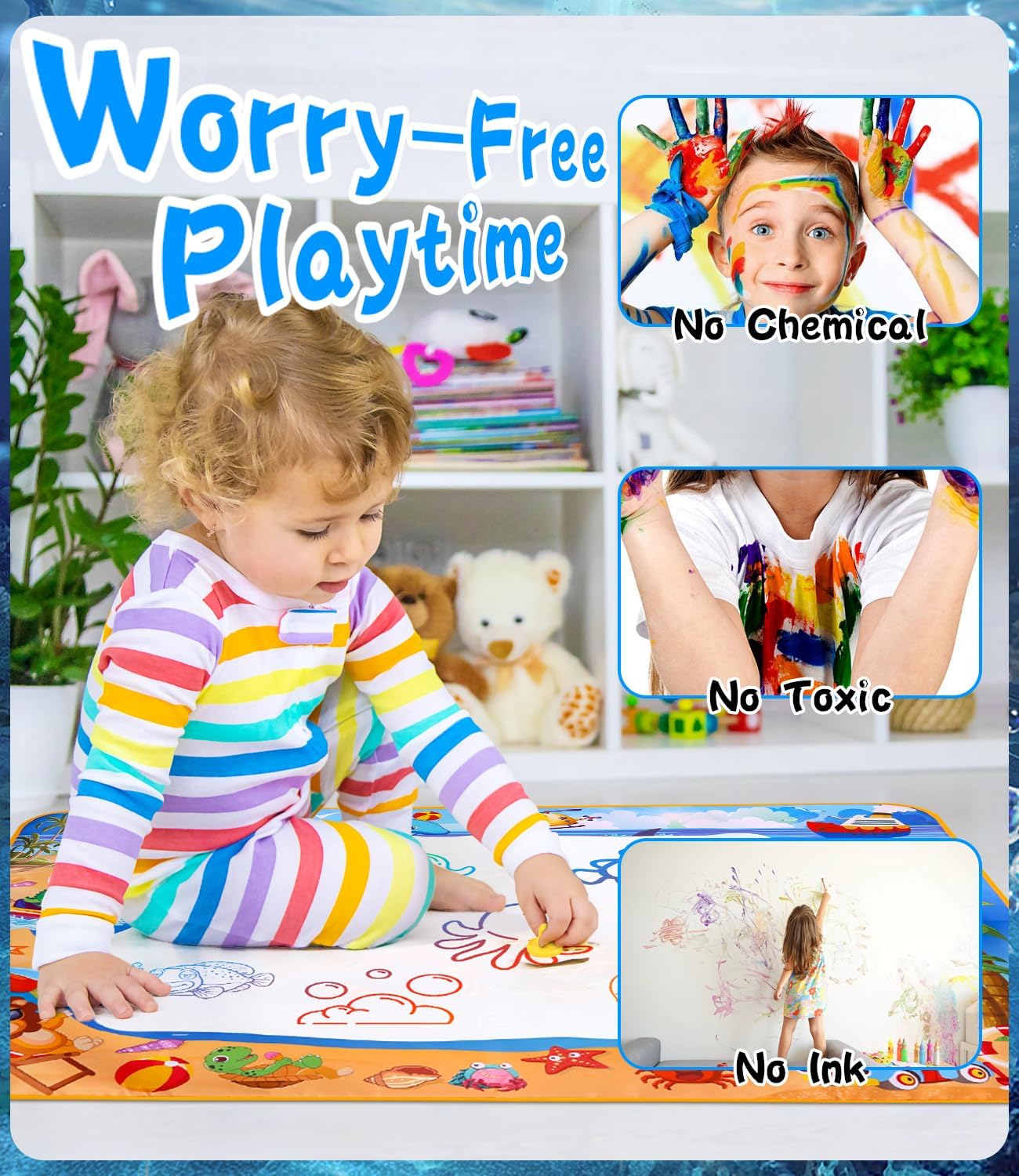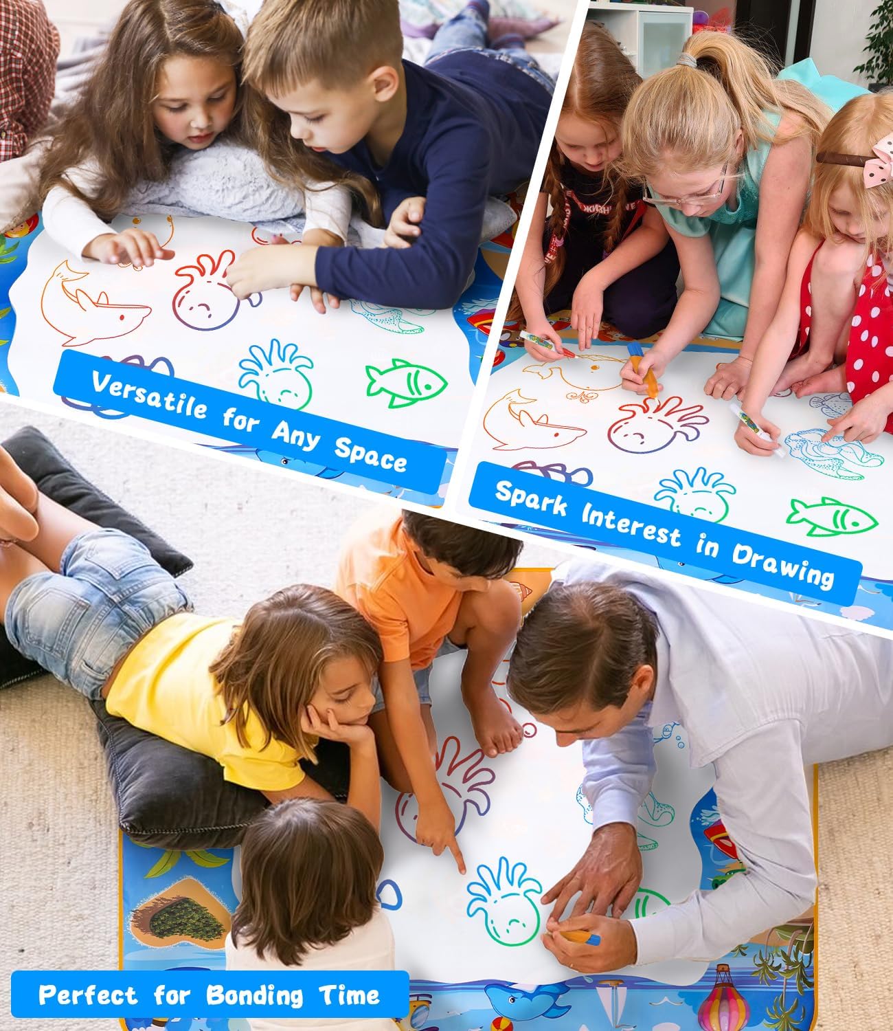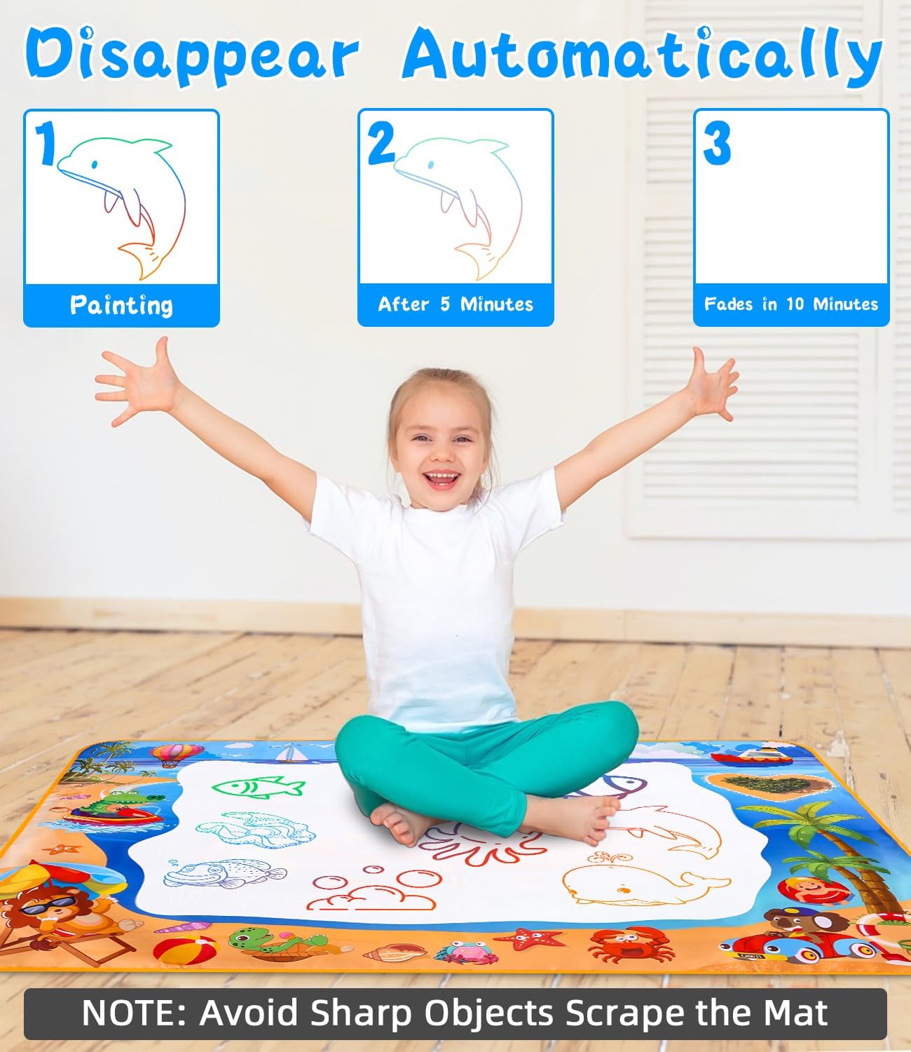 Tappeto d'acqua bambini per uno spazio creativo illimitato: Il nostro ampio tappeto d'acqua misura 100 x 70 cm, offrendo spazio sufficiente per il gioco con più bambini o con i genitori. Leggero e pieghevole, è facile da trasportare e perfetto per giochi sia all'interno che all'esterno. Ideale per viaggi o picnic, perfetto come giochi bimba 1-4 anni. Sicuro ed ecologico: Il tappeto d'acqua è realizzato in tessuto non tessuto in poliestere di alta qualità sulla parte anteriore e PVC impermeabile sul retro. Questo materiale resistente e riutilizzabile è sicuro, atossico ed ecologico, ideale per i più piccoli. Perfetto come giochi educativi 2 anni, è facile da pulire e sicuro per i bambini. Accessori vari per un divertimento creativo: Il set include 5 penne ad acqua, 4 stampi da disegno, 8 formine da disegno, 3 timbri e 1 rullo magico. I numerosi accessori offrono innumerevoli possibilità di gioco e rendono ogni disegno sul tappeto d'acqua colorato e unico. Ottimo per stimolare l'immaginazione e la creatività, perfetto come regalo bimba 2 anni. Facile da usare e riutilizzabile: Basta riempire la penna con acqua e disegnare sul tappeto magico bambini. I disegni svaniscono dopo circa 10 minuti senza lasciare tracce. Grazie al retro impermeabile, il disegno è pulito e adatto ai bambini, perfetto per divertirsi senza macchie. Apprendimento attraverso il gioco: Disegnare sul tappeto d'acqua aiuta a sviluppare la motricità fine, la coordinazione occhio-mano e la capacità di riconoscere colori e forme. Questo giochi educativi 4 anni è un regalo ideale per stimolare la curiosità e incoraggiare l'interazione sociale.