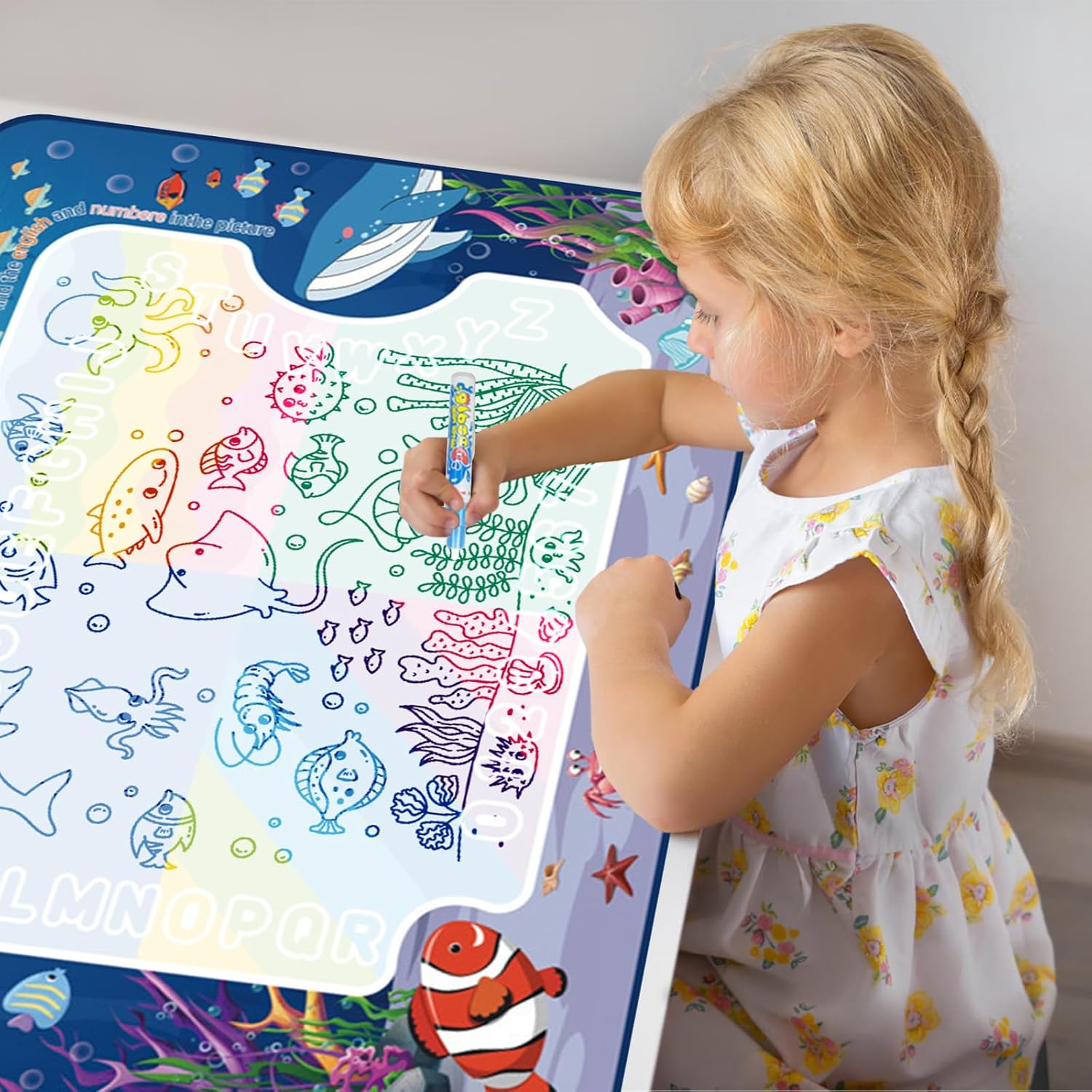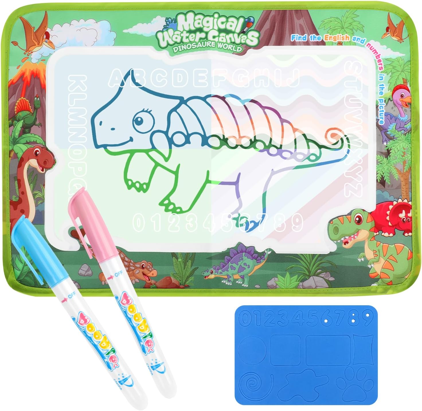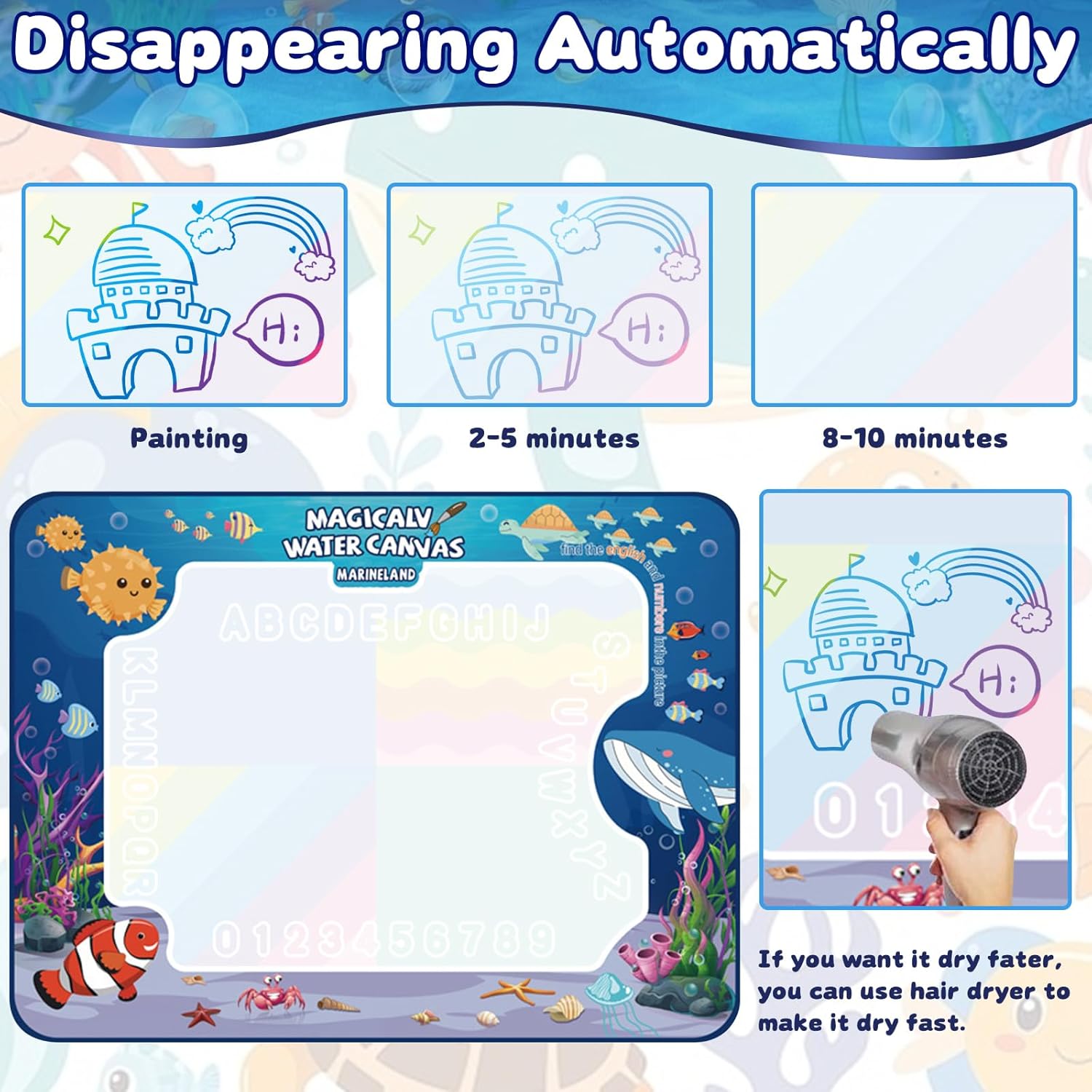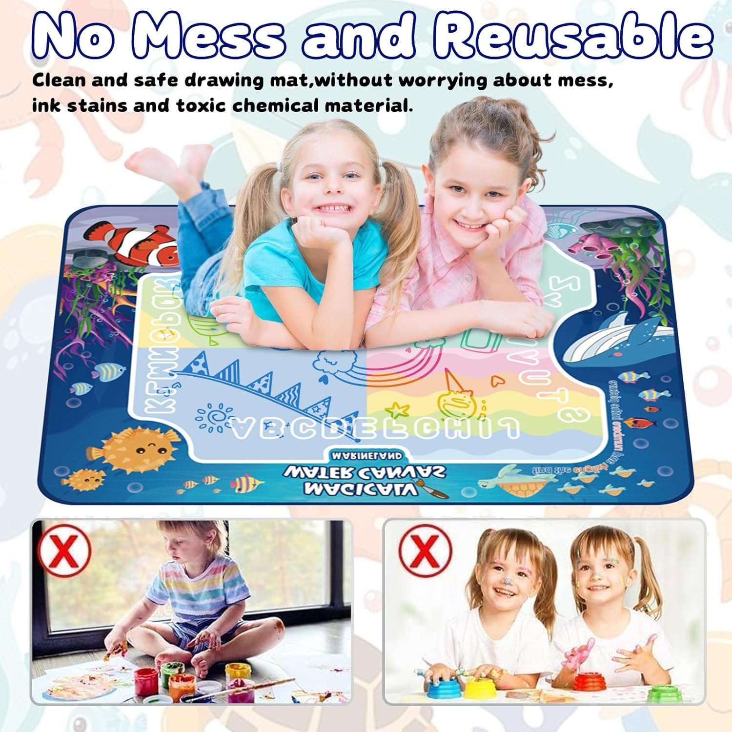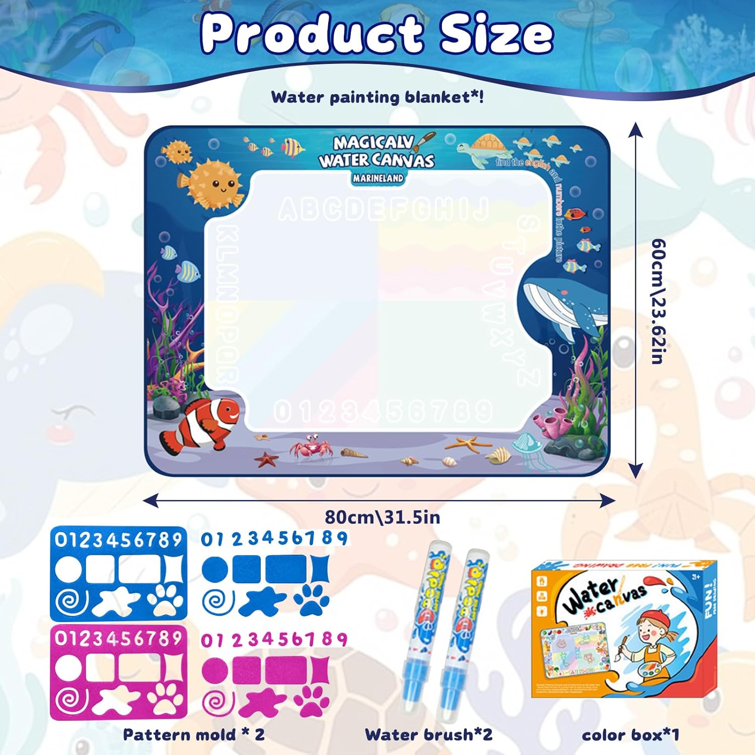 Materiali di alta qualità: Questo tappetino da disegno per bambini è realizzato in tessuto di poliestere di alta qualità, sicuro, atossico, ecologico e riutilizzabile. Nessun inchiostro,nessuna vernice,non tossico,non inquinante.Il retro del tappetino è in materiale resistente all'acqua,pulito e sicuro per i bambini Doodle tappeto magico: Nostro tappeto magico per bambini, che misura 80 x 60 cm, include 2 penne ad acqua magiche, 2 stampi da disegno in EVA e 1 tavoletta da disegno ad acquerello. Un ricco set per dipingere da far dipingere a 2-4 bambini, che favorisce l'apprendimento precoce e lo sviluppo della creatività, divertendo i più piccoli Facile da usare: Riempi la penna con acqua e poi disegna come preferisci! Il motivo scomparirà in 3-10 minuti. Questo Doodle in EVA da Disegno ad acqua per bambini è riutilizzabile. Una volta asciutta, la tela può essere piegata e riposta facilmente, trasportabile e riponibile, ideale per interni ed esterni, parchi e altri luoghi Interazione genitore-figlio: Il nostro tappetino da disegno magico non è solo un giocattolo da disegno per bambini, ma può anche migliorare la comunicazione tra genitori e figli. Così tu e i tuoi bambini potrete trascorrere ore infinite di divertimento e relax utilizzando il nostro tappetino da disegno per bambini Regalo giochi bambini: Il nostro tappeto magico per bambini con l'acqua è un regalo ideale per bambini dai 3 ai 7 anni e un'ottima scelta per compleanni, il Ringraziamento, Natale o qualsiasi altra occasione speciale. Può esercitare la coordinazione occhio-mano dei bambini, la percezione del colore e l'alfabetizzazione artistica