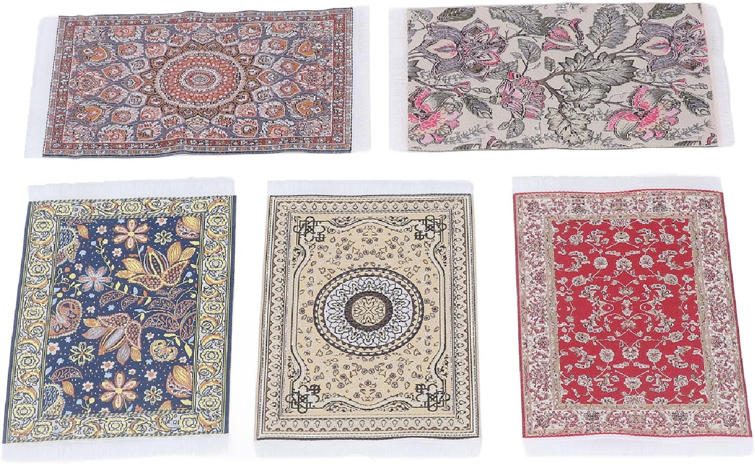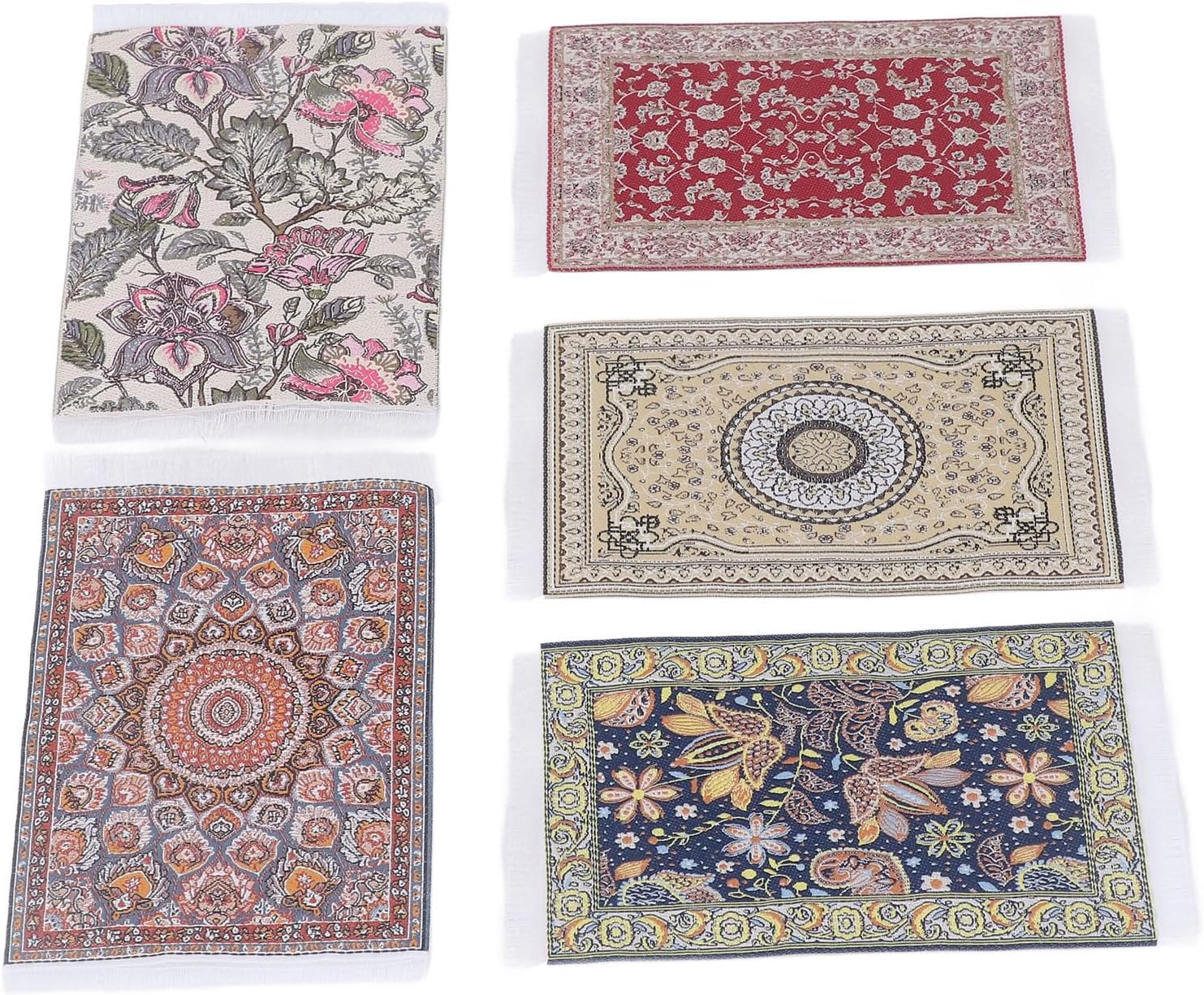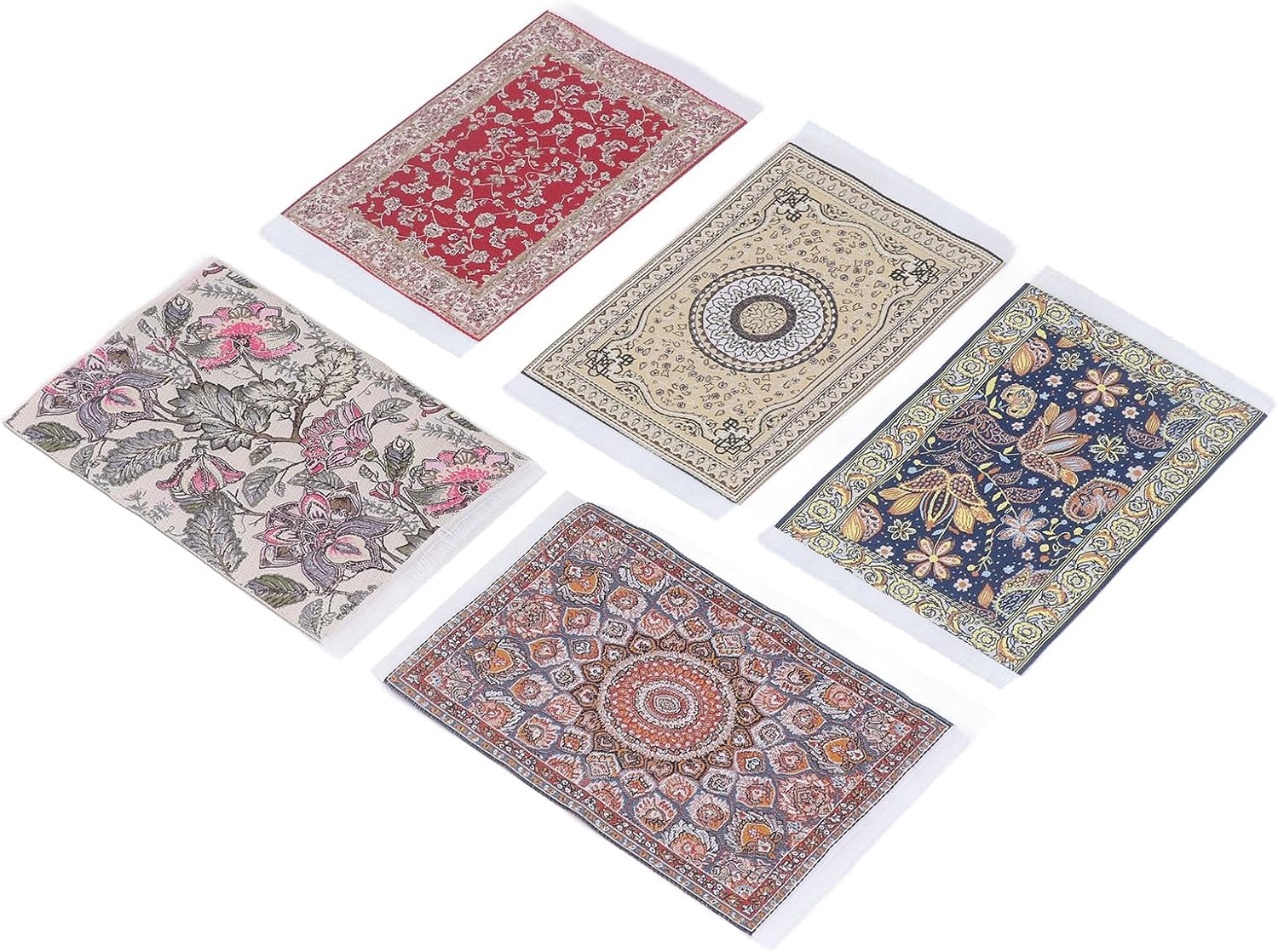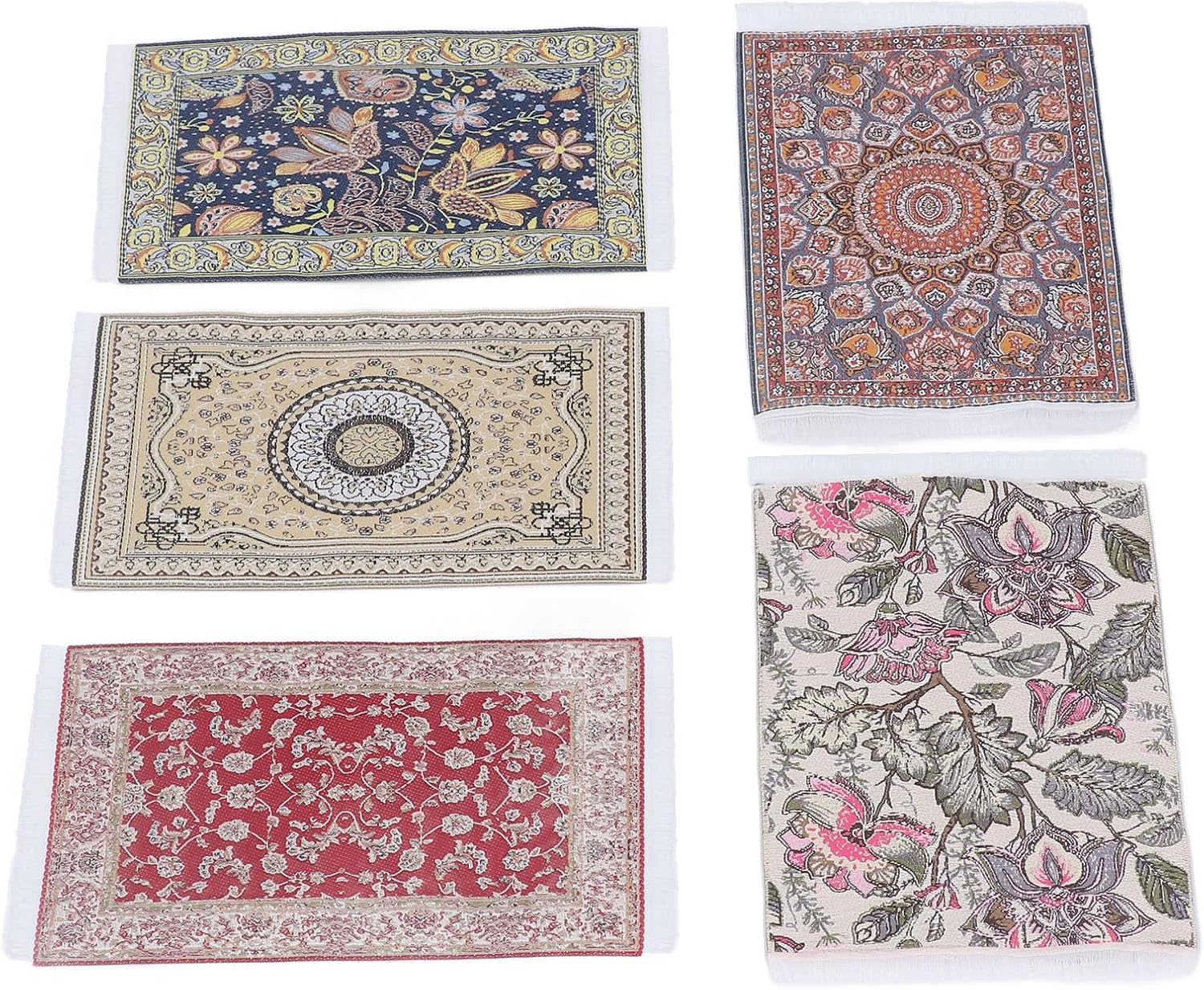 Tappeto per casa delle bambole 1/12, 5 pezzi Ogni tappeto per casa delle bambole è realizzato con cura con materiali in tessuto intrecciato con disegni di tappeti orientali e turchi Squisita fattura, stampa floreale squisita Morbida coperta da pavimento in miniatura, aspetto realistico. Facile da pulire