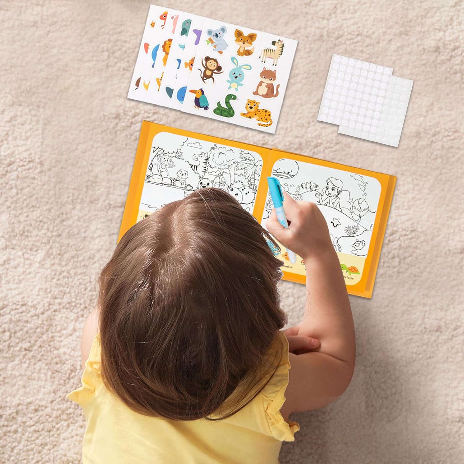 Tappetino Crescita Cognitiva: Incorporando come animali e veicoli, il tappetino magico ad acqua migliora la creatività e lo sviluppo sensoriale, aiutando i bambini piccoli a sviluppare le capacità cognitive mentre si divertono con esperienze di gioco interattive ed educative in qualsiasi momento e luogo, promuovendo un apprendimento giocoso e lo sviluppo mentale. Pagine Richiudibili e Sicure: Il tappetino per disegnare con acqua presenta pagine spesse e resistenti con un rivestimento laminato impermeabile, garantendo un uso duraturo per i bambini e massima sicurezza per le manine, permettendo di esplorare attività creative come la decorazione con adesivi e il disegno a base d'acqua in modo sicuro e senza preoccupazioni, ideale per stimolare la creatività e il gioco quotidiano in ambienti domestici. Uso Pratico e Conveniente: Questo tappeto magico acqua unisce una texture in morbido velluto a chiusure a strappo sicure, rivelando il fascino del disegno con acqua e offrendo ore di divertimento riutilizzabile per i bambini piccoli e in età prescolare durante il gioco in casa o in vacanza, stimolando il gioco creativo e l'intrattenimento educativo con un design facile da usare e materiali sicuri per l'uso domestico o in viaggio. Apprendimento Interattivo con : Il tappetino da disegno ad acqua costruisce la coordinazione occhio-mano e migliora il riconoscimento dei colori, presentando concetti come animali e veicoli attraverso interattivi che ispirano un impegno focalizzato in un ambiente di gioco divertente e calmante, per stimolare la curiosità e l'apprendimento pratico dei piccoli. Esperienza di Gioco Interattiva: Il tappeto da disegno ad acqua include una penna ad acqua studiata per piccole mani, che supporta facili processi di riempimento e richiusura, consentendo ai bambini di immergersi in giochi creativi senza preoccupazioni, ideale per gite familiari, momenti tranquilli in casa o attività di gruppo, promuovendo la fantasia e la coordinazione in modo coinvolgente e sicuro.