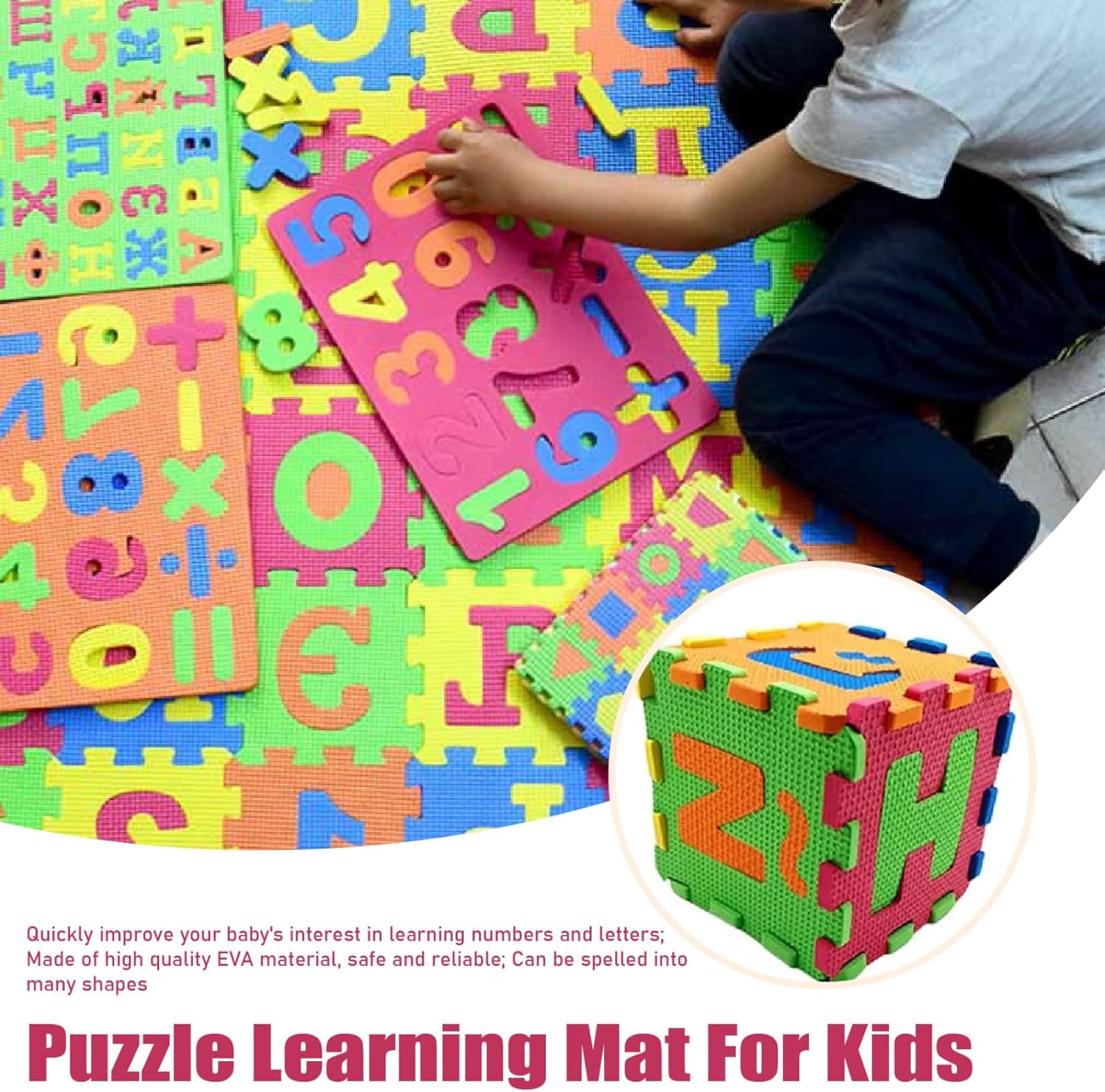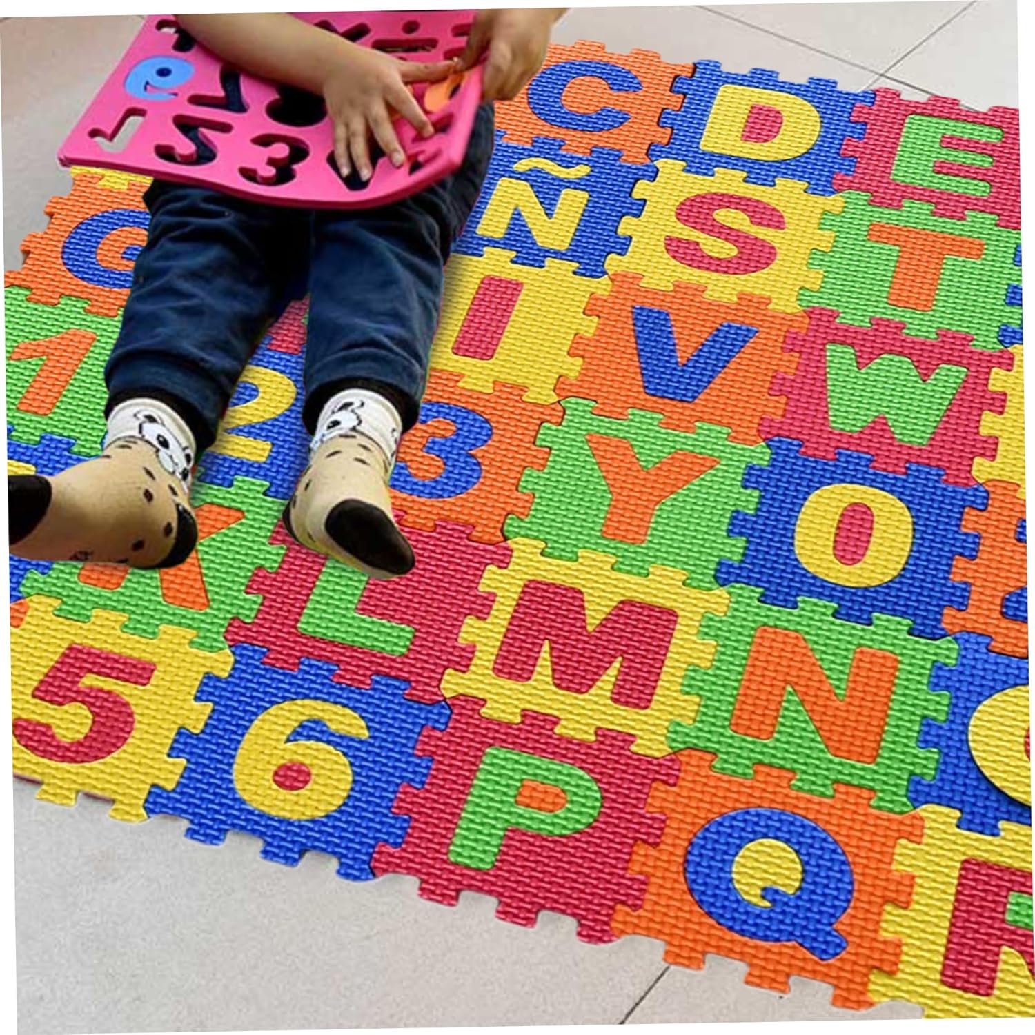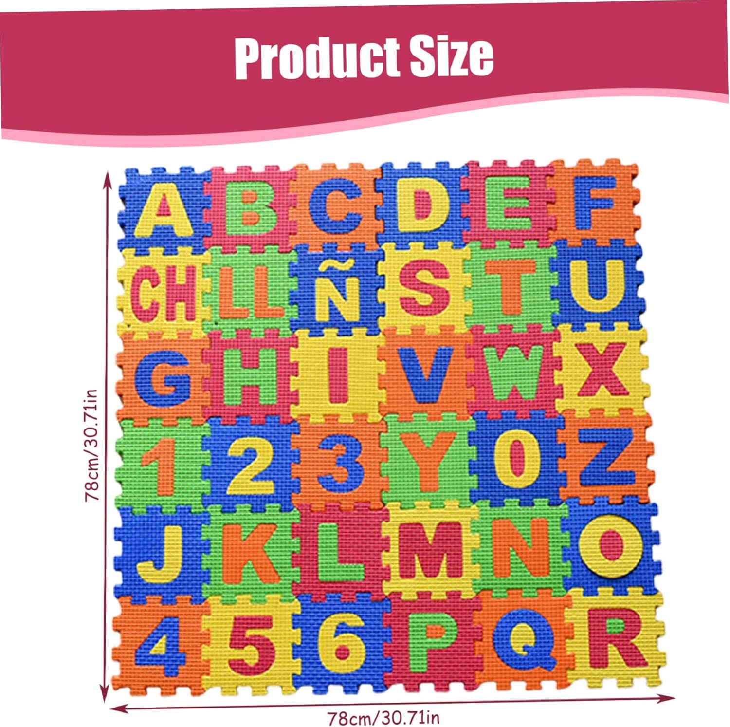 Superficie di gioco morbida e sicura: realizzato in schiuma EVA di qualità, questo tappeto puzzle offre un'area morbida e imbottita da esplorare per i bambini..Il suo materiale atossico garantisce un ambiente di gioco sicuro in cui i più piccoli possono gattonare, giocare ed esercitarsi. Facile da pulire e mantenere: la superficie di qualità del tappetino in schiuma EVA è facile da pulire, rendendolo una scelta pratica per i genitori..È progettato per resistere a schizzi e disordini mantenendo l'area giochi del tuo bambino igienica e fresca. Design puzzle versatile: ogni tessera misura 14x14 cm (5,51x5,51 pollici), combinandosi per formare un'ampia area di gioco di 78x78 cm (30,71x30,71 pollici)..Il design ad incastro consente un facile montaggio o riconfigurazione, adattandosi al tuo spazio e alle tue esigenze. Apprendimento interattivo attraverso il gioco: il tappeto puzzle da 36 tessere è dotato di vivaci tessere ad incastro in schiuma EVA che mostrano entrambi gli alfabeti spagnoli, creando un ambiente di apprendimento coinvolgente per neonati e bambini piccoli mentre giocano. Migliora le capacità motorie: la pratica dei tappetini puzzle incoraggia i bambini a sviluppare la coordinazione occhio-mano, le capacità motorie e le capacità di risoluzione dei problemi mentre sistemano le tessere e riconoscono lettere e forme.
