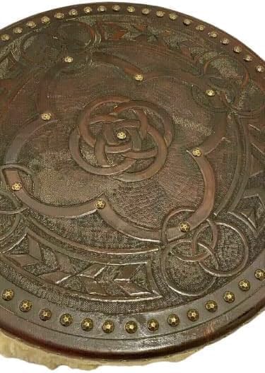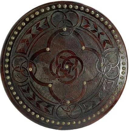 Design autentico: scudo rotondo realizzato a mano con intricati motivi a nodo celtico e borchie decorative tradizionali di ispirazione norrena intorno al bordo Costruzione: base in legno resistente con finitura marrone dettagliata, perfetta per rievocazioni storiche e attività LARP (Live Action Role Play) Pronto per la battaglia: la robusta faccia dello scudo misura circa 61 cm di diametro, ideale per simulazioni di combattimento medievali ed eventi in costume Elementi decorativi: presenta rivetti metallici rialzati e un elaborato motivo a rosa centrale circondato da cerchi celtici interconnessi Uso versatile: adatto per esposizione a parete, produzioni teatrali, fiere rinascimentali e dimostrazioni storiche