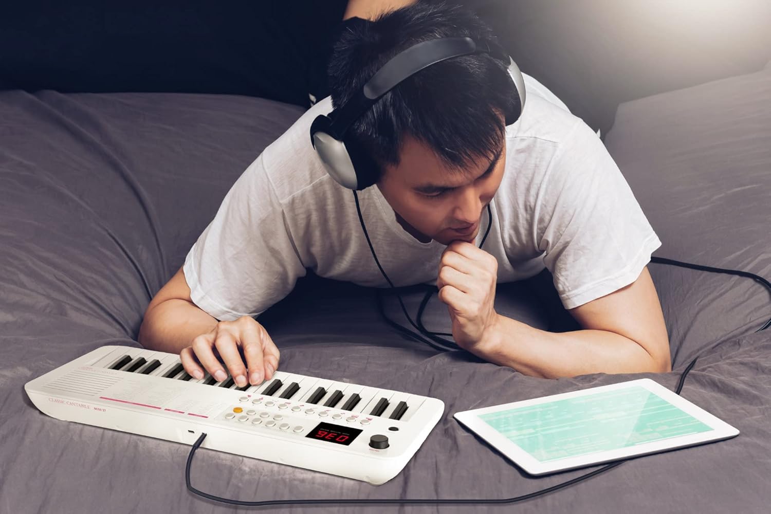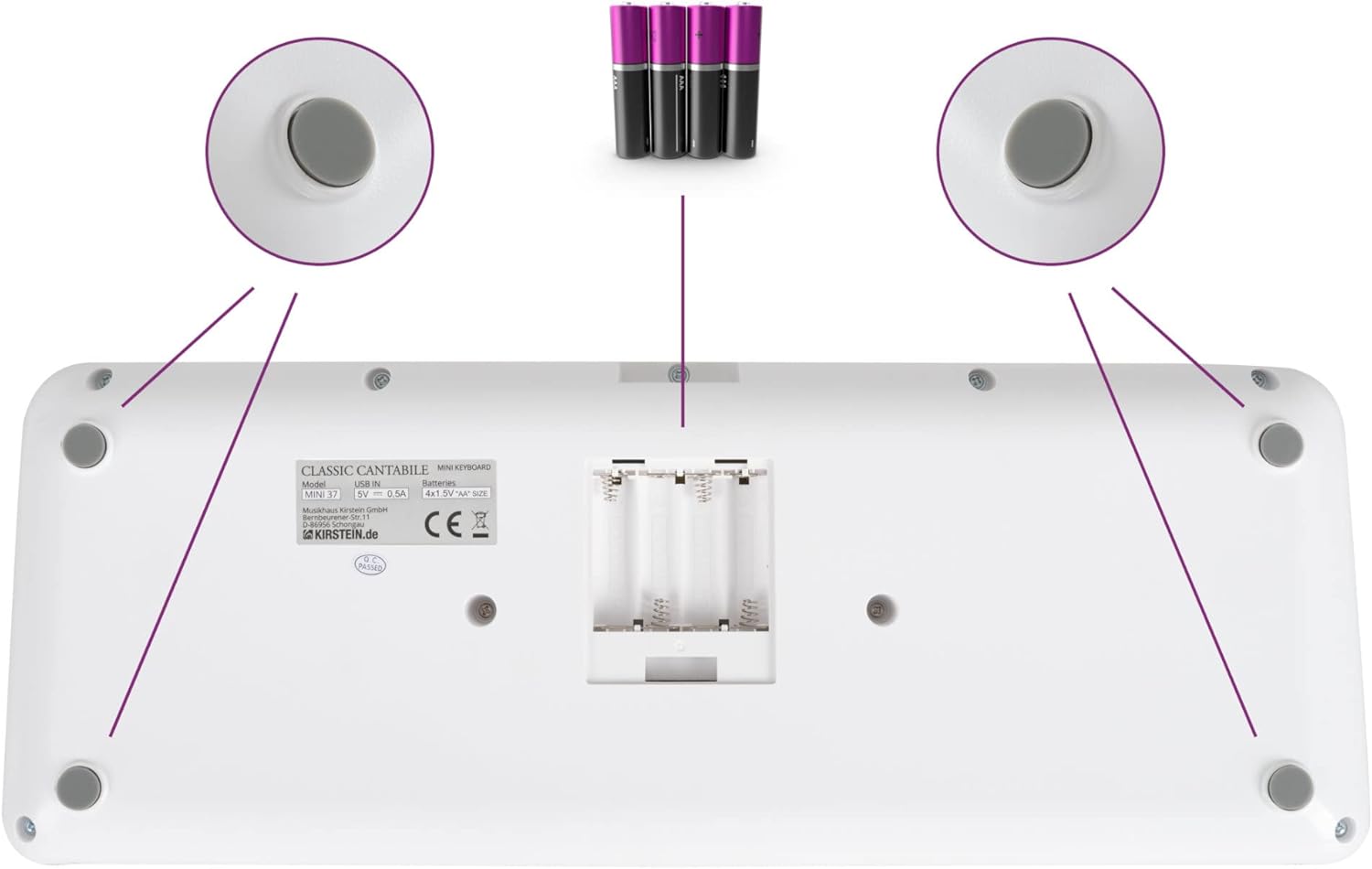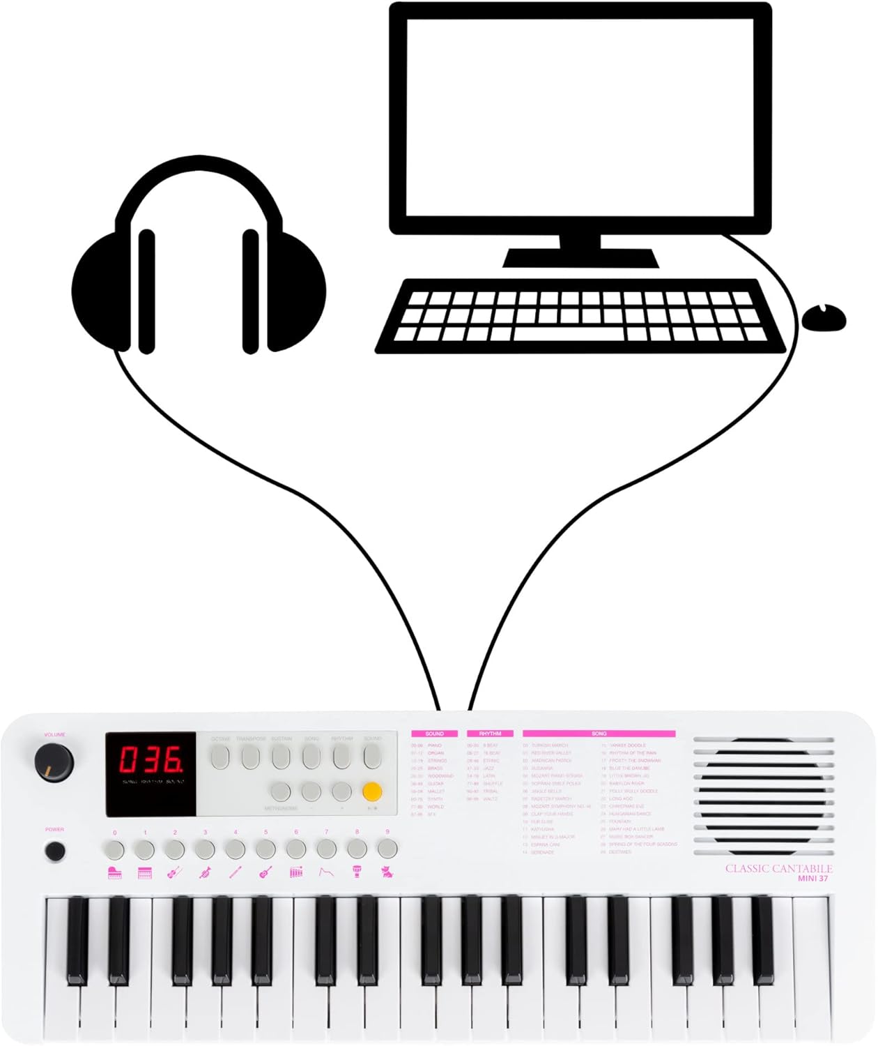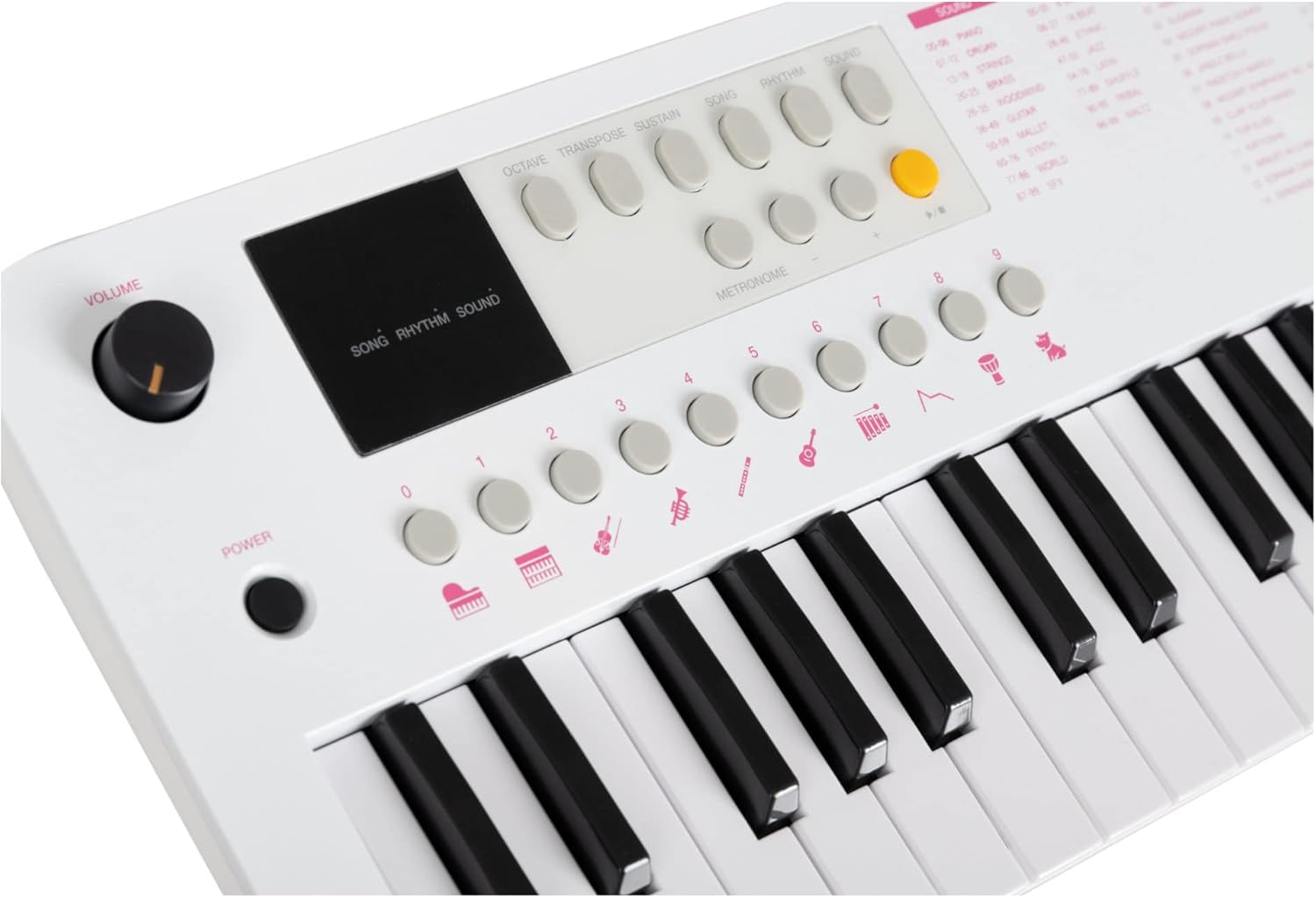 37 mini pulsanti, 100 suoni (divisi in 10 gruppi), 100 ritmi, 30 brani (la voce della melodia può essere disattivata), polifonia 32x, manopola di controllo del volume, alimentazione tramite USB-C (5 V/500 mA) o batterie (4x AA, non incluse), funzione ottava (±1 ottava), funzione trasposizione (±1 semitono), funzione accordatura (±50 centesimi), funzione di sostegno (on/off), metronomo: 30 - 280 bpm, volume regolabile separatamente, 0 - 16 battute, avvio sincronizzato per accompagnamento ritmico, spegnimento automatico (5, 10, 15, 30, 60, 120 min, off), altoparlante interno, collegamenti: USB-C (per alimentazione e USB-MIDI), jack stereo da 3,5 mm (uscita cuffie) Potenza amplificatore: 2 Watt, colore: bianco, incluso cavo da USB-A a USB-C, 1 m di lunghezza, dimensioni (LxPxA): 490 x 185 x 61 mm, peso: 990 g
