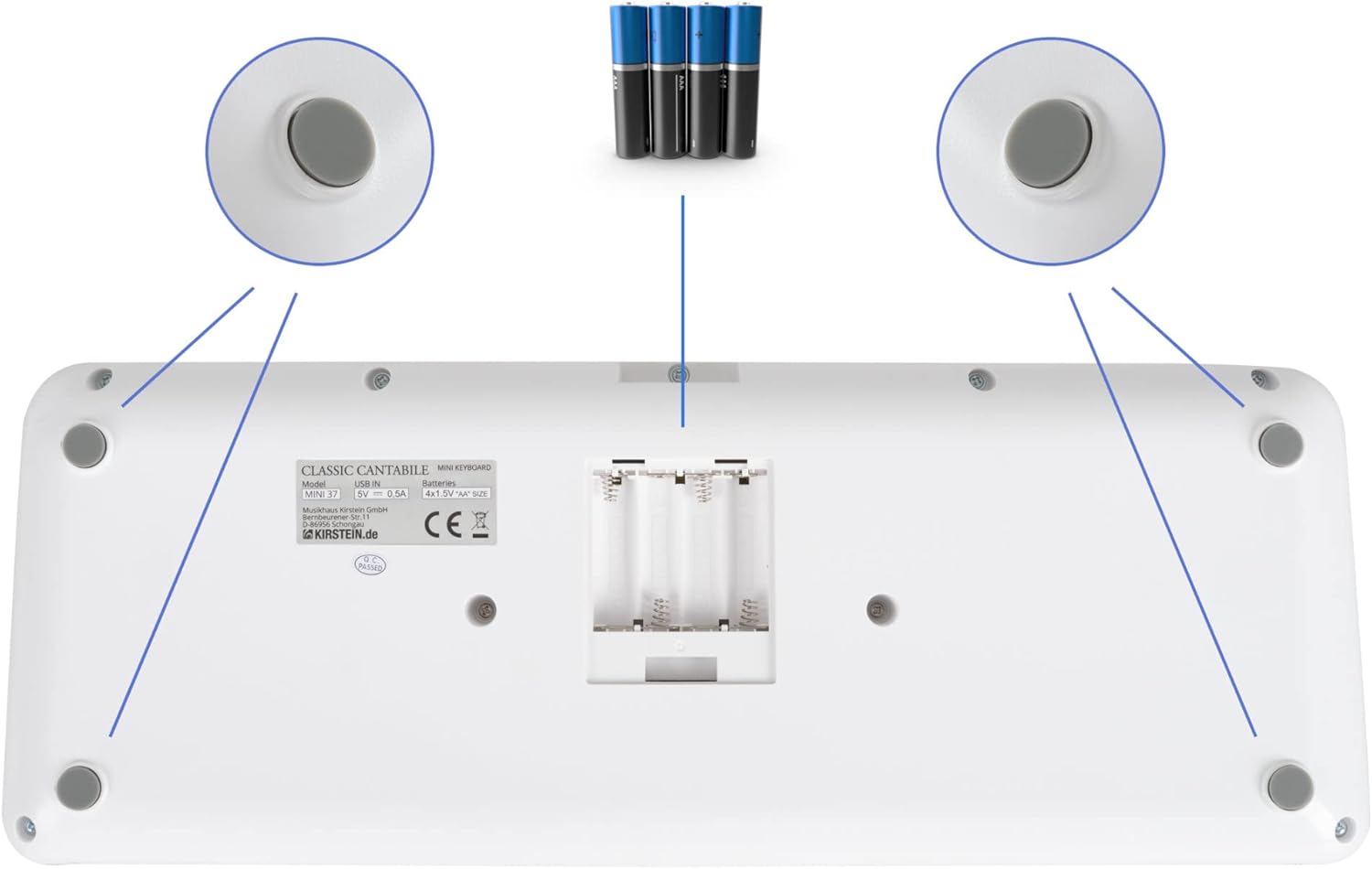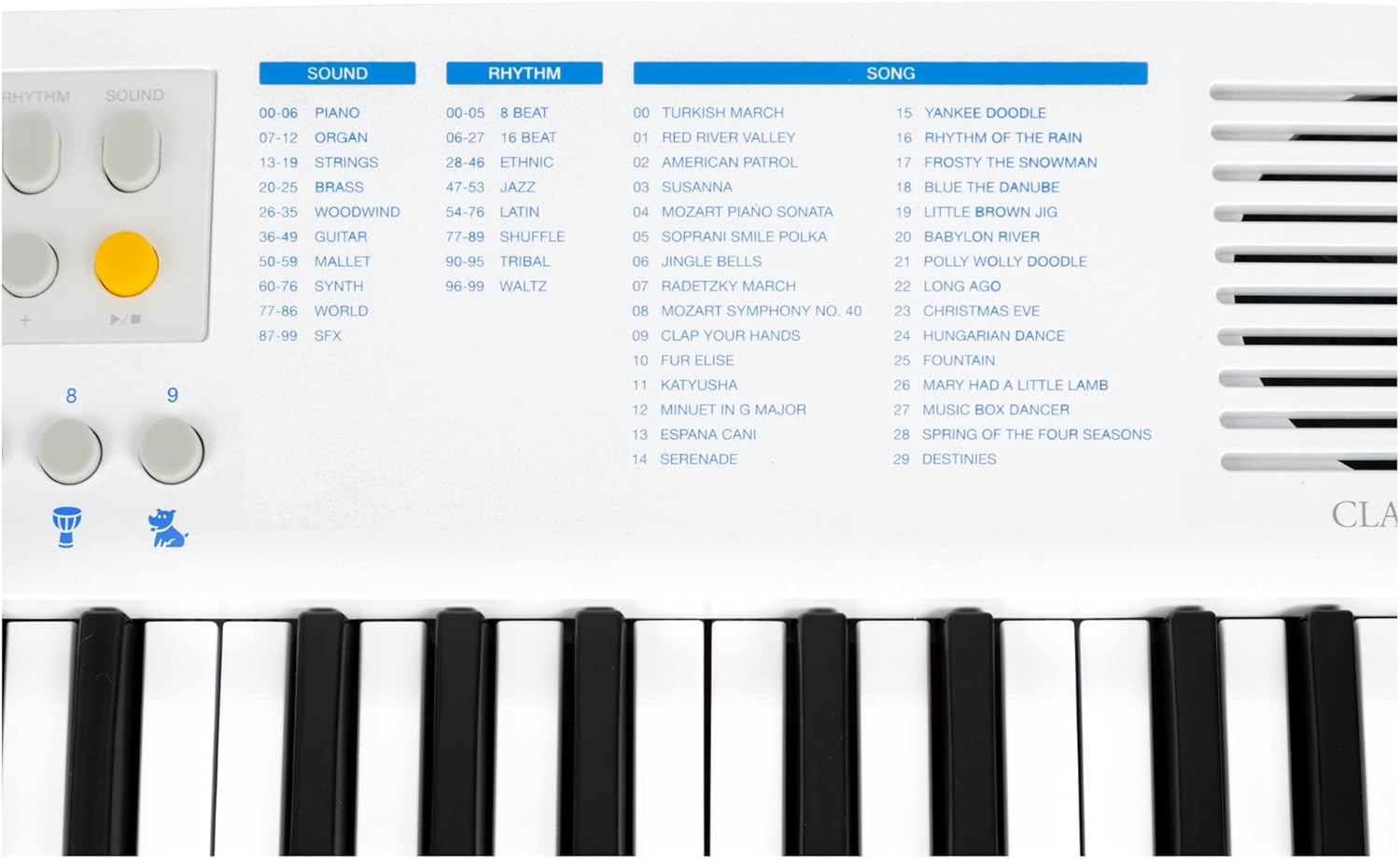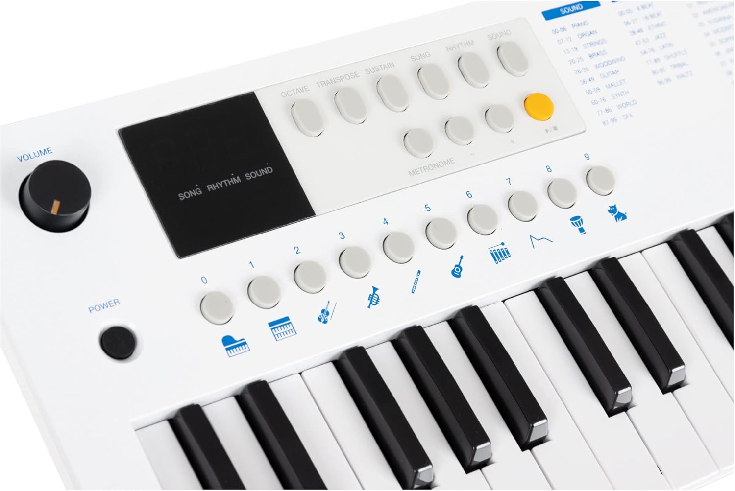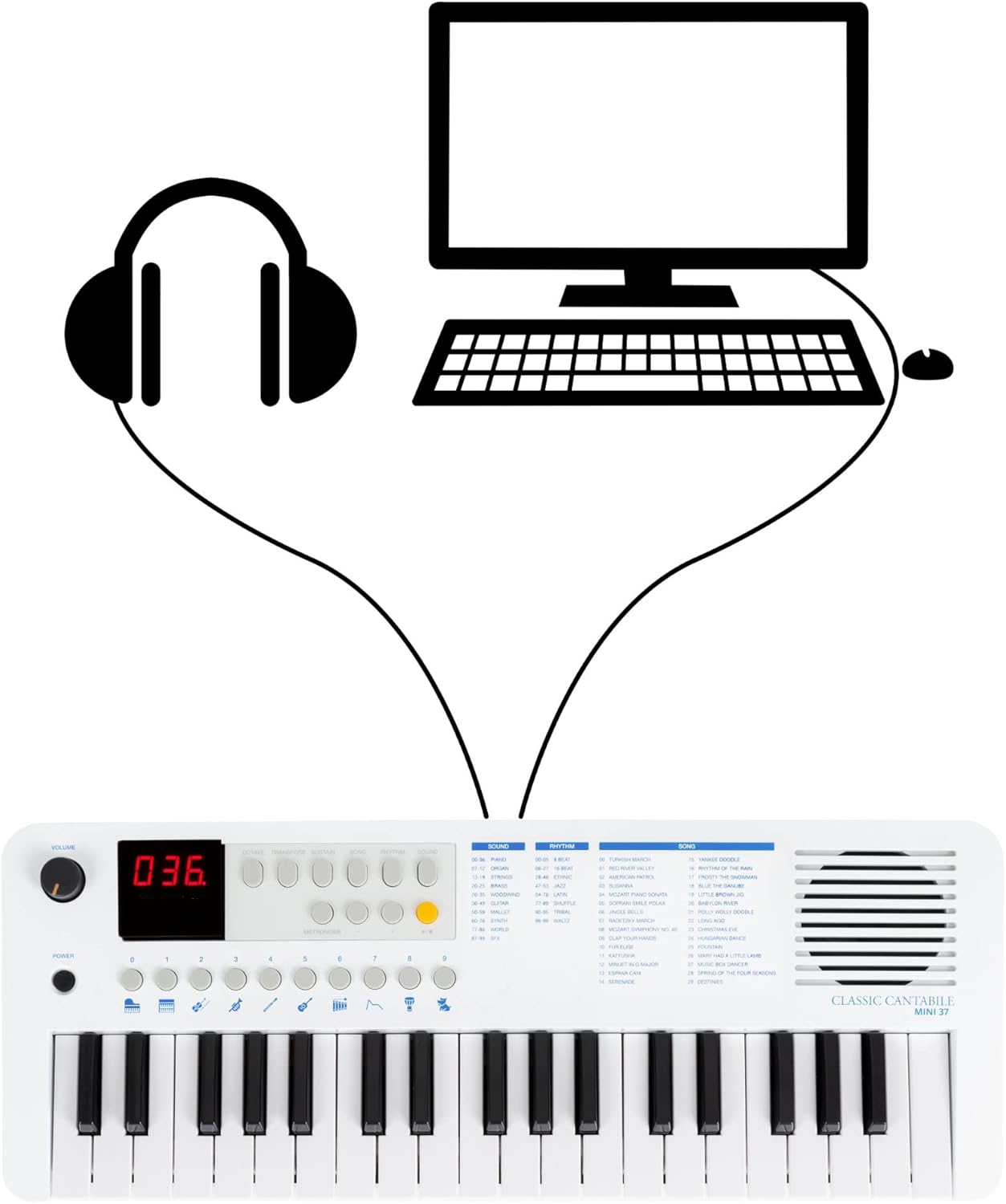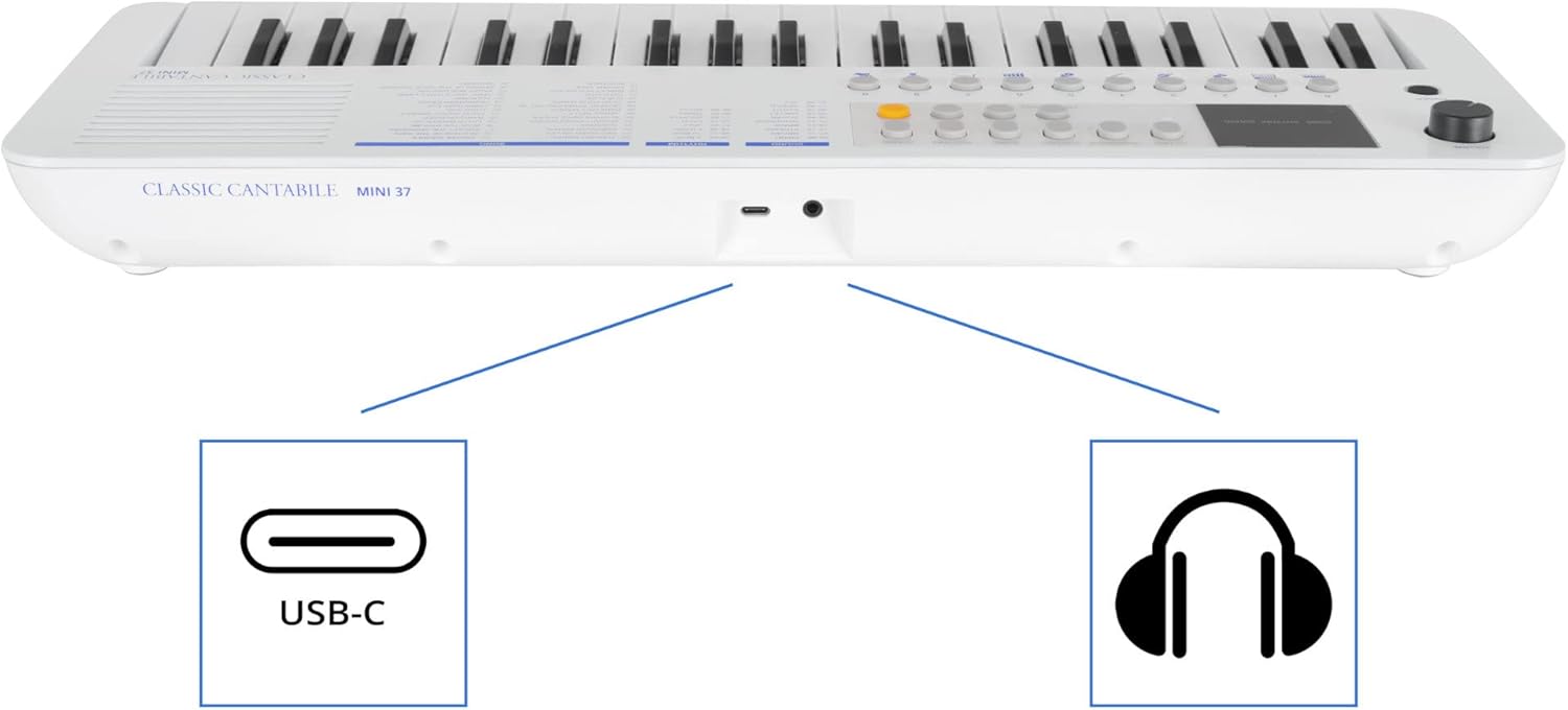 37 mini pulsanti, 100 suoni (divisi in 10 gruppi), 100 ritmi, 30 brani (la voce della melodia può essere disattivata), polifonia 32x, manopola di controllo del volume, alimentazione tramite USB-C (5 V/500 mA) o batterie (4x AA, non incluse), funzione ottava (±1 ottava), funzione trasposizione (±1 semitono), funzione accordatura (±50 centesimi), funzione di sostegno (on/off), metronomo: 30 - 280 bpm, volume regolabile separatamente, 0 - 16 battute, avvio sincronizzato per accompagnamento ritmico, spegnimento automatico (5, 10, 15, 30, 60, 120 min, off), altoparlante interno, collegamenti: USB-C (per alimentazione e USB-MIDI), jack stereo da 3,5 mm (uscita cuffie) Potenza amplificatore: 2 Watt, colore: bianco, incluso cavo da USB-A a USB-C, 1 m di lunghezza, dimensioni (LxPxA): 490 x 185 x 61 mm, peso: 990 g
