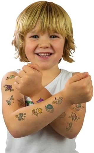 Design divertente con illustrazioni di astronavi. Contiene oltre 24 tatuaggi temporanei non tossici con temi spaziali. Molto divertente per le feste. Durevole e di lunga durata Facile da applicare in 10 secondi con solo acqua.