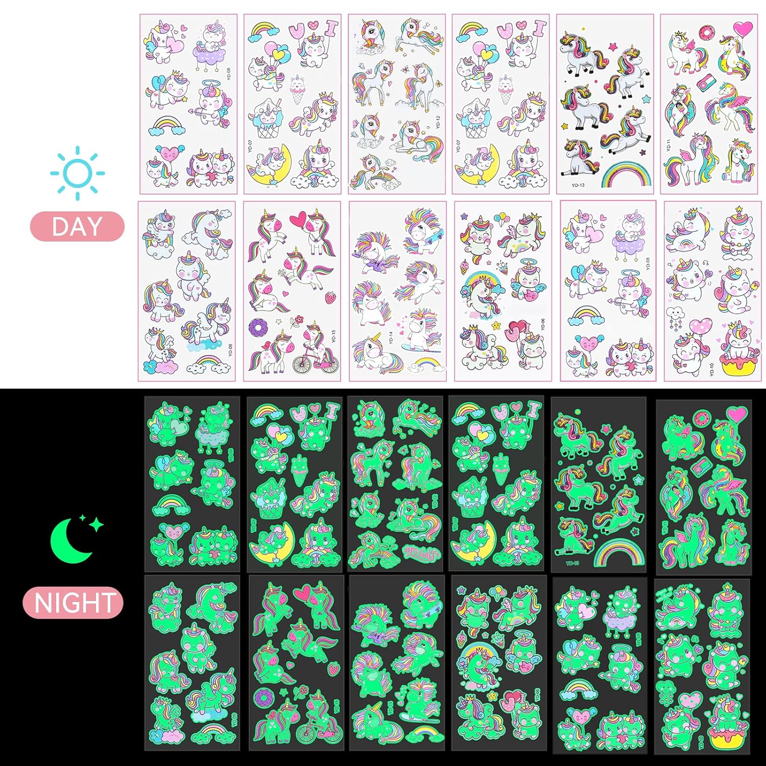 【Semplice e facile da usare】 I tatuaggi temporanei di unicorno sono facili da applicare e rimuovere. Immergi il tatuaggio in alcool, olio d'oliva o sapone per 15-20 secondi. Quindi strofina delicatamente ripetutamente finché il tatuaggio non scompare senza lasciare residui o causare irritazione alla pelle. 【Alta qualità】 I tatuaggi Unicorn Glow per bambini sono di alta qualità, indicando che sembrano realistici e possono durare a lungo senza sbiadire o sbucciarsi. Il fantastico design che si illumina al buio ti farà sicuramente risaltare alla festa., Delicati sulla pelle e impermeabili: i tatuaggi unicorno per bambini sono realizzati con materiali atossici, delicati sulla pelle e sicuri. Gli adesivi per tatuaggi sono impermeabili e resistenti al sudore e durano 3-5 giorni, così puoi divertirti in piscina., Bomboniere perfette per feste di compleanno per bambini: i tatuaggi temporanei per bambini hanno una vasta gamma di usi, possono essere utilizzati non solo come riempitivi per sacchetti per feste per bambini, sorprese, regali di compleanno per feste per bambini, ma anche come regali per l'iscrizione scolastica per ragazze, coni di zucchero per riempire coni scolastici per ragazze, giocattoli per giochi in classe e giochi a premi, premi scolastici, perfetti per accessori per il compleanno dei bambini, articoli per feste.