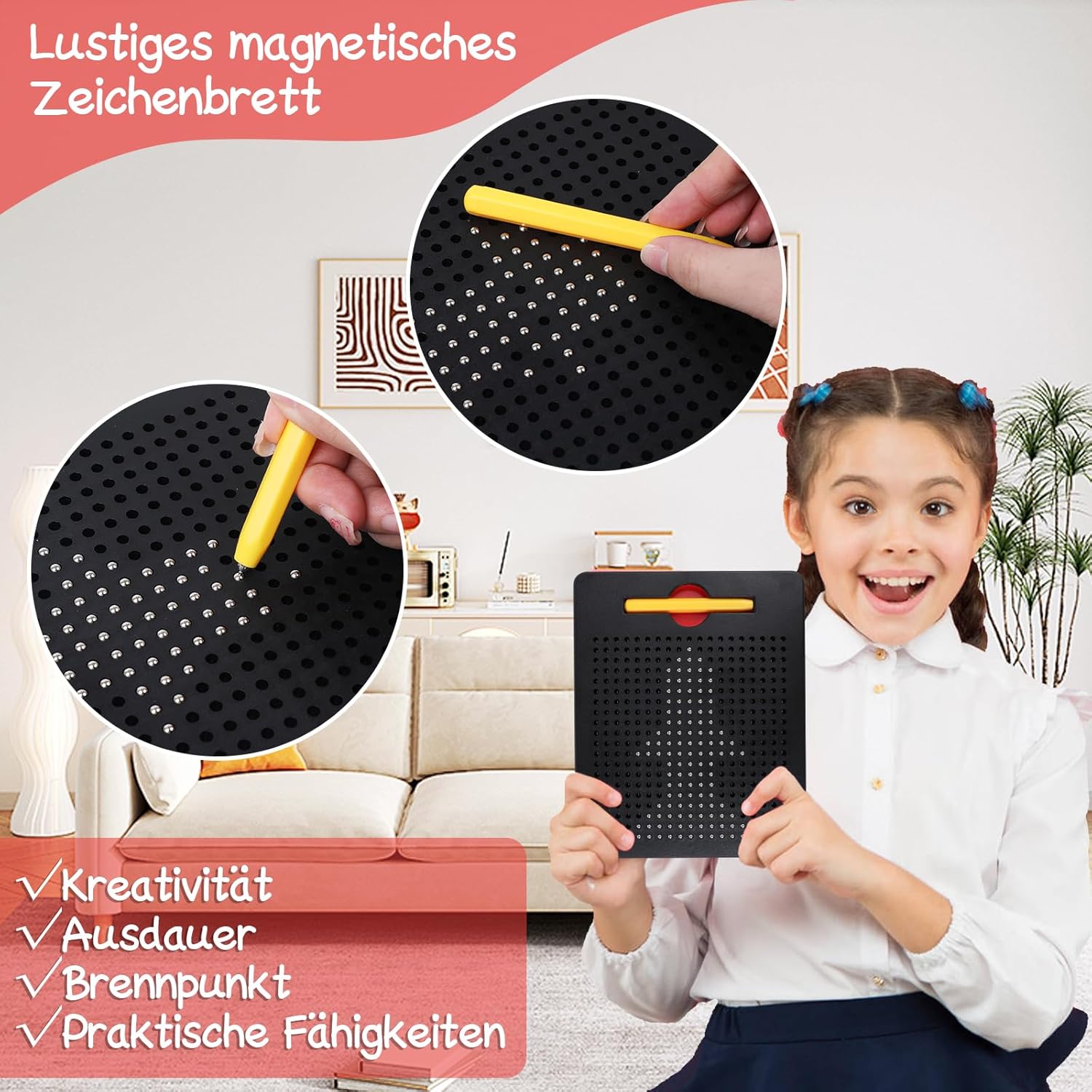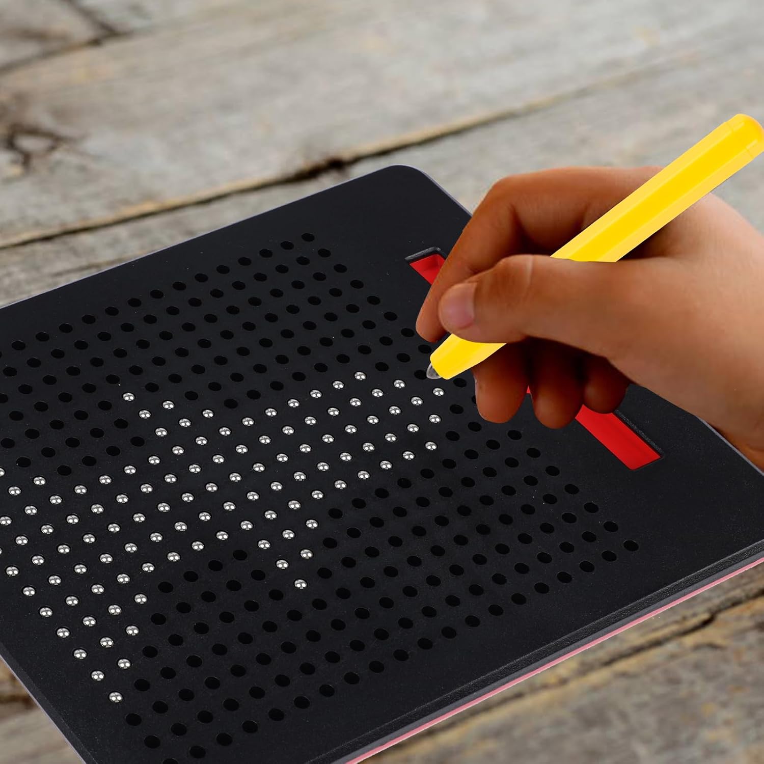 Dimensioni: il vassoio magnetico misura 21,5 x 17,5 cm e viene fornito con una penna magnetica per un facile trasporto in viaggio. È possibile portare facilmente questi ausili da disegno per bambini piccoli durante lunghi viaggi, voli o treni senza ingrandire la borsa. Design unico: il suo design unico utilizza il concetto di magnetismo, stimola una varietà di recettori sensoriali e mimetizza l'apprendimento come un gioco per un'esperienza rinfrescante ogni volta. Aiuta i bambini a sviluppare la coordinazione occhio-mano, le capacità motorie, la regolazione della forma, il riconoscimento del colore, il pensiero logico precoce e migliora la loro concentrazione e pazienza. Facile da usare: basta puntare la punta magnetica della penna su ogni foro per spostare le perline magnetiche in superficie, in modo che il bambino possa dare libero sfogo alla sua creatività. Per rilasciarlo, basta premere verso il basso con il lato della penna. Un giocattolo senza misura per bambini: rendi sopportabili i lunghi viaggi e intrattenete i vostri bambini senza fare il caos! La nostra lavagna magnetica è tutto ciò di cui hai bisogno per tenere le mani, i pensieri e gli occhi occupati per ore Regalo perfetto: questo giocattolo magnetico è il regalo perfetto per i bambini, perfetto come giocattolo educativo per la festa dei bambini, Natale, compleanni, Ringraziamento, ecc. O come giocattolo da viaggio. Il divertente vassoio da disegno magnetico può anche prolungare il tempo di interazione genitore-figlio.