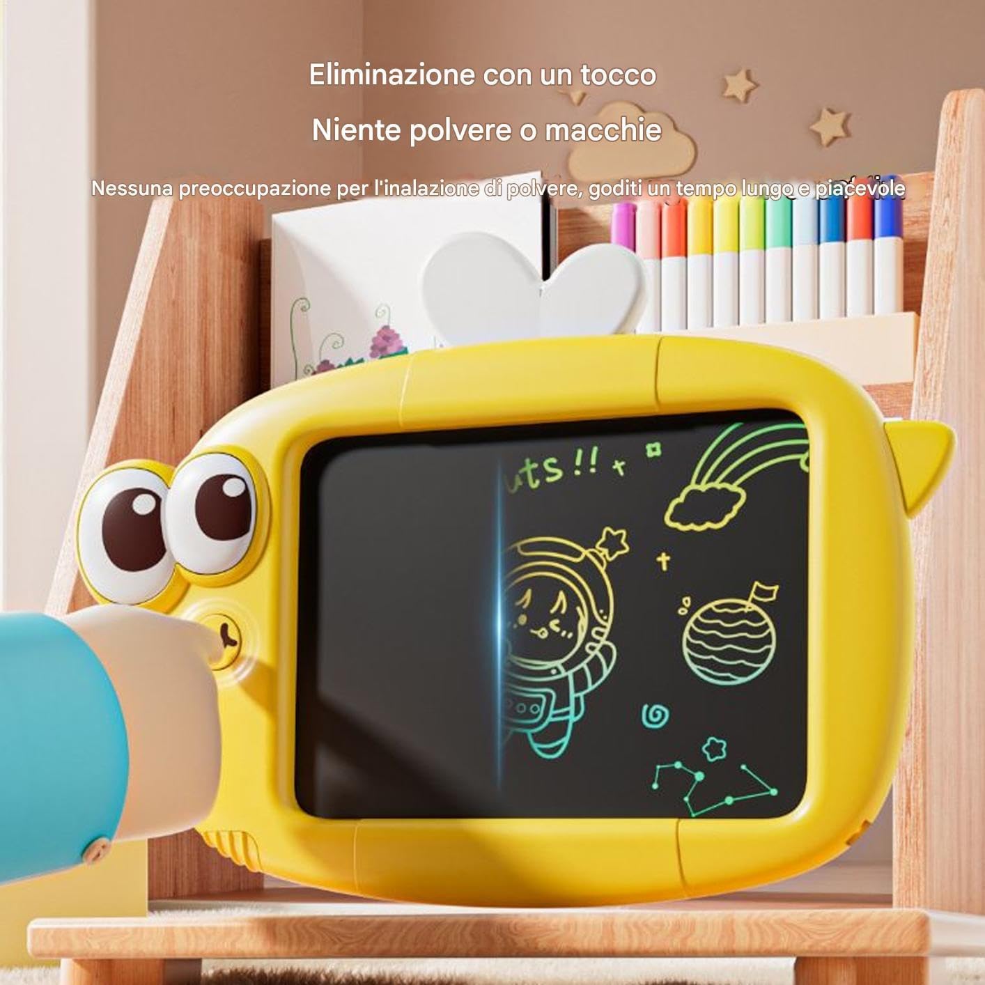 Schermo Anti-Affaticamento: La luce delicata elimina l'esposizione alla luce blu, permettendo ai bambini di disegnare a lungo senza stress oculare durante attività creative e formative Apprendimento Creativo: Incentiva la coordinazione occhio-mano, stimola l'immaginazione con un'esperienza di scrittura LCD coinvolgente, costruisce una base di apprendimento precoce e migliora il riconoscimento dei colori durante le attività di gioco educativo per bambini di diverse età e interessi Design Ecologico: La lavagna LCD riutilizzabile riduce gli sprechi di carta con un reset immediato e la funzione touch-clear, promuovendo abitudini sostenibili per i bambini e risparmiando risorse senza sforzo Materiale Resistente: Combina finiture dei bordi lisce e una costruzione robusta anti-caduta, creando un prodotto sicuro per bambini che assicura un utilizzo prolungato e affidabile per tutte le attività creative e di apprendimento quotidiano Fascino grafico: Caratterizzato da un look divertente da cartone animato con grandi occhi, questo tablet LCD per bambini mantiene l'attenzione dei piccoli ispirando l'inizio del gioco creativo attraverso un design e visuali fantasiose che favoriscono la concentrazione