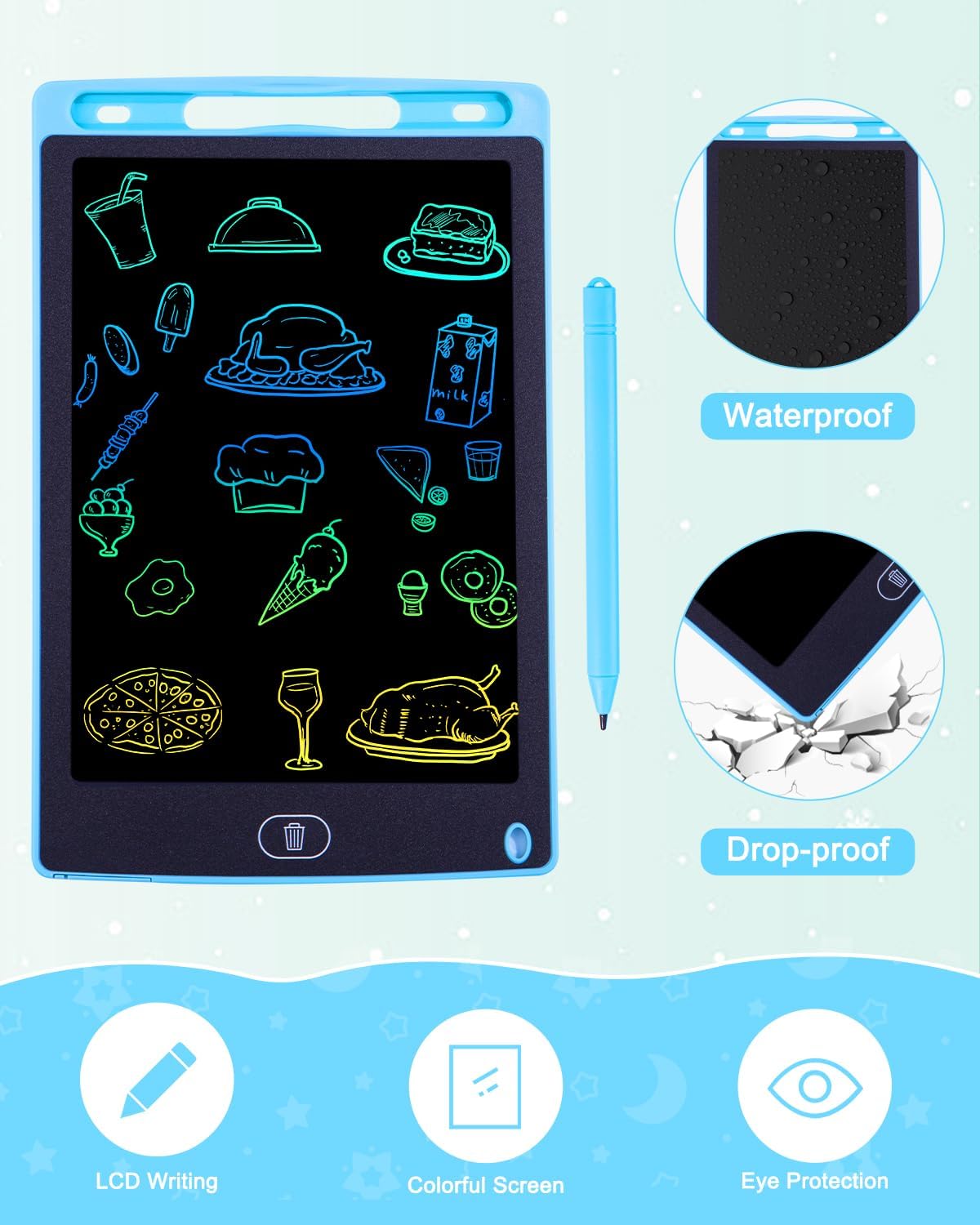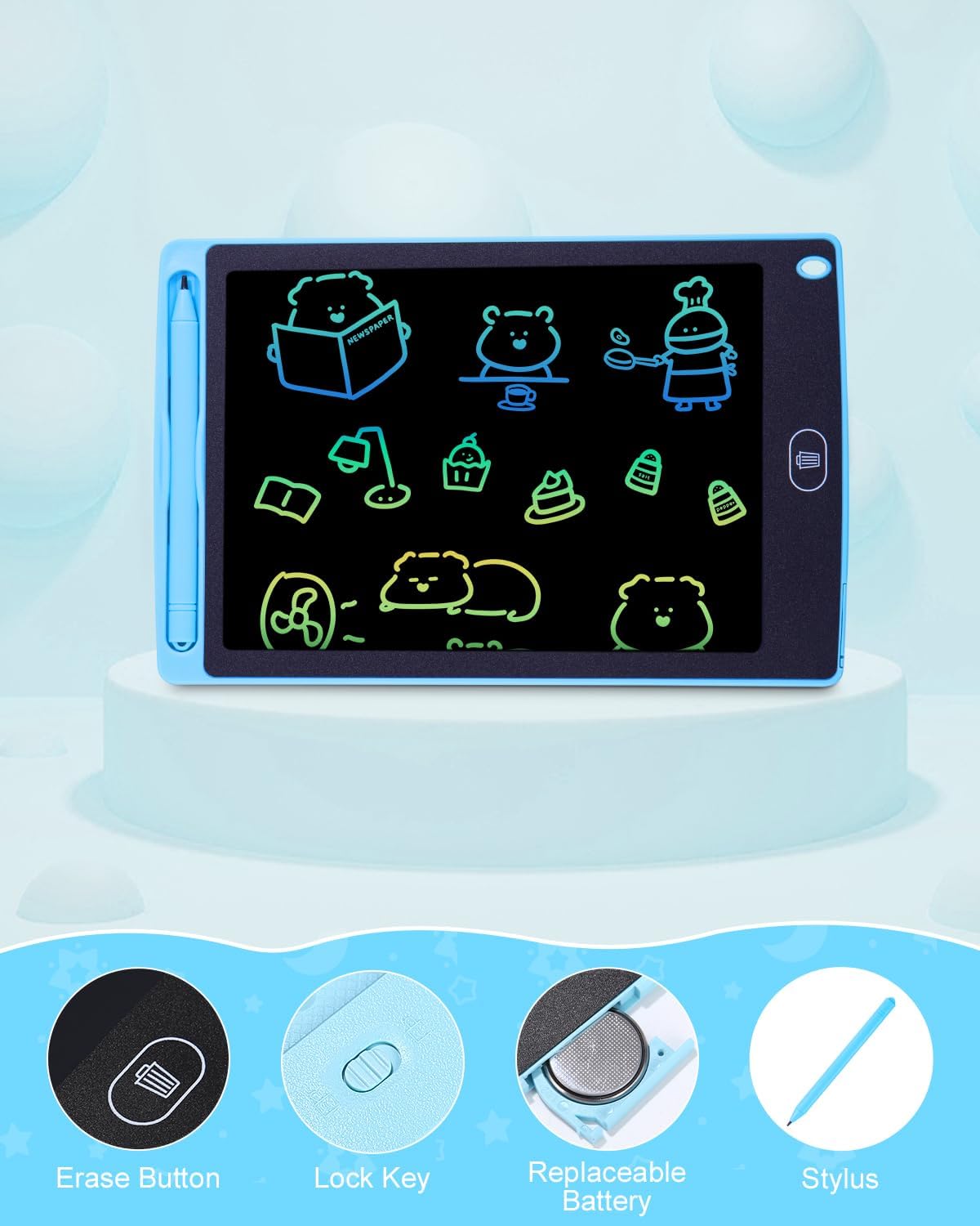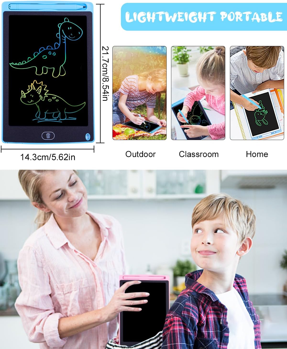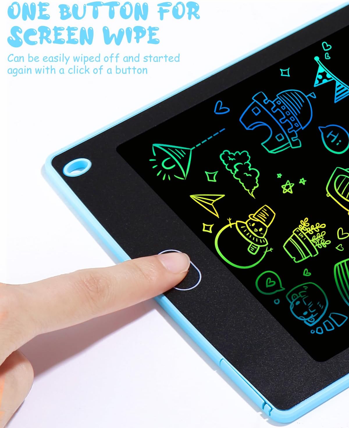 【L'ultimo tappetino da scrittura LCD da 2 pezzi】 Adottando la più recente tecnologia LCD flessibile, è più luminoso e chiaro della maggior parte dei tablet da scrittura. Utilizzando la tecnologia sensibile alla pressione, è possibile tracciare linee di diverso spessore applicando diverse quantità di pressione. La confezione contiene 2 blocchi di scrittura LCD per bambini (blu e blu), lascia correre l'immaginazione e la creatività del tuo bambino! 【Oltre 10.000 riscritture della batteria fluide e durevoli】 Alimentato dalla batteria ricaricabile CR2025, consumo energetico estremamente basso per i tablet che scrivono bambini. La semplice pressione di un pulsante consuma energia, quindi una singola batteria in genere dura a lungo. 【Leggero e portatile per i viaggi】 Con un peso di soli 210 g, è leggero e portatile, adatto ai bambini da portare fuori o viaggiare in auto/aereo, goditi un felice viaggio in movimento. Le dimensioni ridotte consentono ai bambini di adattarsi allo zaino o alla borsa della scuola. 【Tavolo da disegno a colori a spaziatura singola】 Il tavolo da disegno a linea di colore LCD ha un'alta sensibilità alla pressione, la pressione di scrittura determina lo spessore della linea di disegno, la scrittura e il disegno come su carta. Un pulsante di blocco sul retro del tablet aiuta a prevenire gli abusi e a salvare la grafica dei bambini, inoltre il pulsante aiuta anche a cancellare tutto e ricreare nuove creazioni con un semplice tocco. 【Durevole】 Il giocattolo per la prima educazione è il miglior regalo per i tuoi figli. Regalo, regalo di Capodanno per ragazzi e ragazze di età superiore a 3 anni.