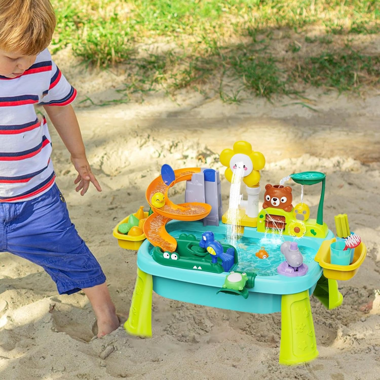 Sviluppo Abilità Sensoriali: Attività multiruolo come cucina e con 20+ per gioco sensoriale. Favorisce crescita delle capacità motorie fini attraverso giochi immaginativi e interazione pratica per bambini. Apprendimento Attivo: Potenzia lo sviluppo cognitivo tramite giochi dinamici con acqua, design regolabile in altezza per supporto ergonomico che favorisce la crescita delle abilità motorie essenziali. Ambiti Applicativi:Tavolo bimbi acqua/sabbia versatile per gioco estivo immersivo. Supporta entrambe le modalità per migliorare costruzioni creative e attività educative durante il bonding genitore-figlio Gioco Sensoriale Acquatico:Ispira i bambini con l'osservazione di traiettorie galleggianti e dinamici giochi sensoriali di flusso d'acqua, sviluppando capacità logiche e creatività immaginativa durante esperienze pratiche di scoperta della fisica per l'infanzia. Gioco Acqua Girasole: Stimola la curiosità con un tavolo acqua per bambini piccoli, offre modalità pioggia simulata e ciclo acqua creativo, alimentato da pompa a batteria, per coinvolgente gioco a tema girasole