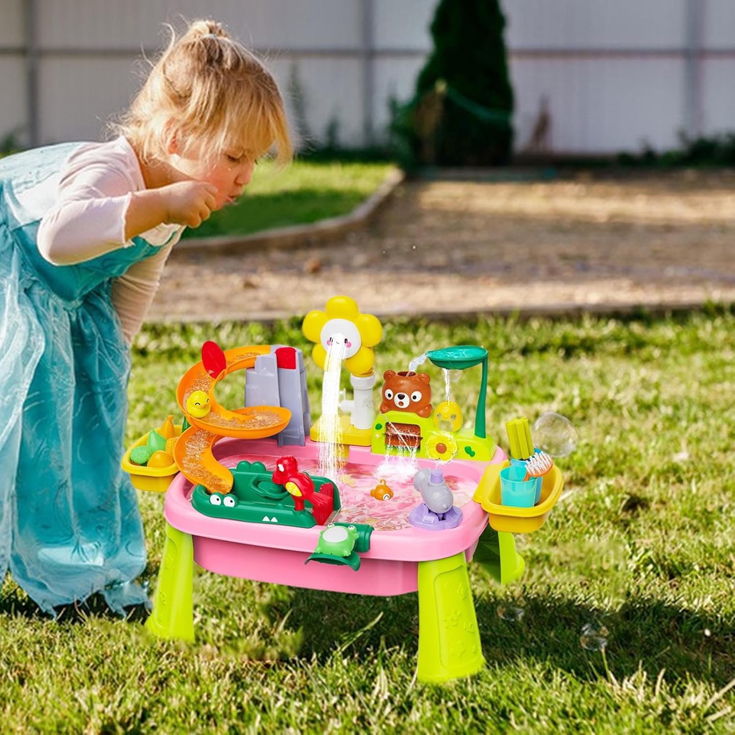 Design Ergonomico: Rubinetto a forma di girasole con simulatore di pioggia stimola l'esplorazione sensoriale, promuovendo naturalmente la curiosità e l'apprendimento del risparmio idrico attraverso attività interattive che rendono divertente la conservazione delle risorse. Esplorazione Sensoriale: Stimola la scoperta sensoriale, potenzia le abilità motorie fini e offre esperienze di gioco simbolico immersivo alla tavola d'acqua per bambini Stazione Scientifica: Coinvolge i bambini in giochi scientifici pratici con apprendimento aperto, potenziando lo sviluppo del pensiero logico grazie ad attività ispirate alla fisica sul tavolo acqua. Gioco Interattivo Esterno: Stimola il genitore-figlio supportando divertimento da giardino e spiaggia, offrendo più opportunità per giochi educativi all'aperto insieme ad attività creative con sabbiera per bambini Altezza Regolabile: Base modificabile in 3 livelli accompagna la crescita, favorendo postura ottimale per sviluppare abilità motorie fini e attenzione prolungata tramite giochi d'acqua coinvolgenti e totalmente analogici