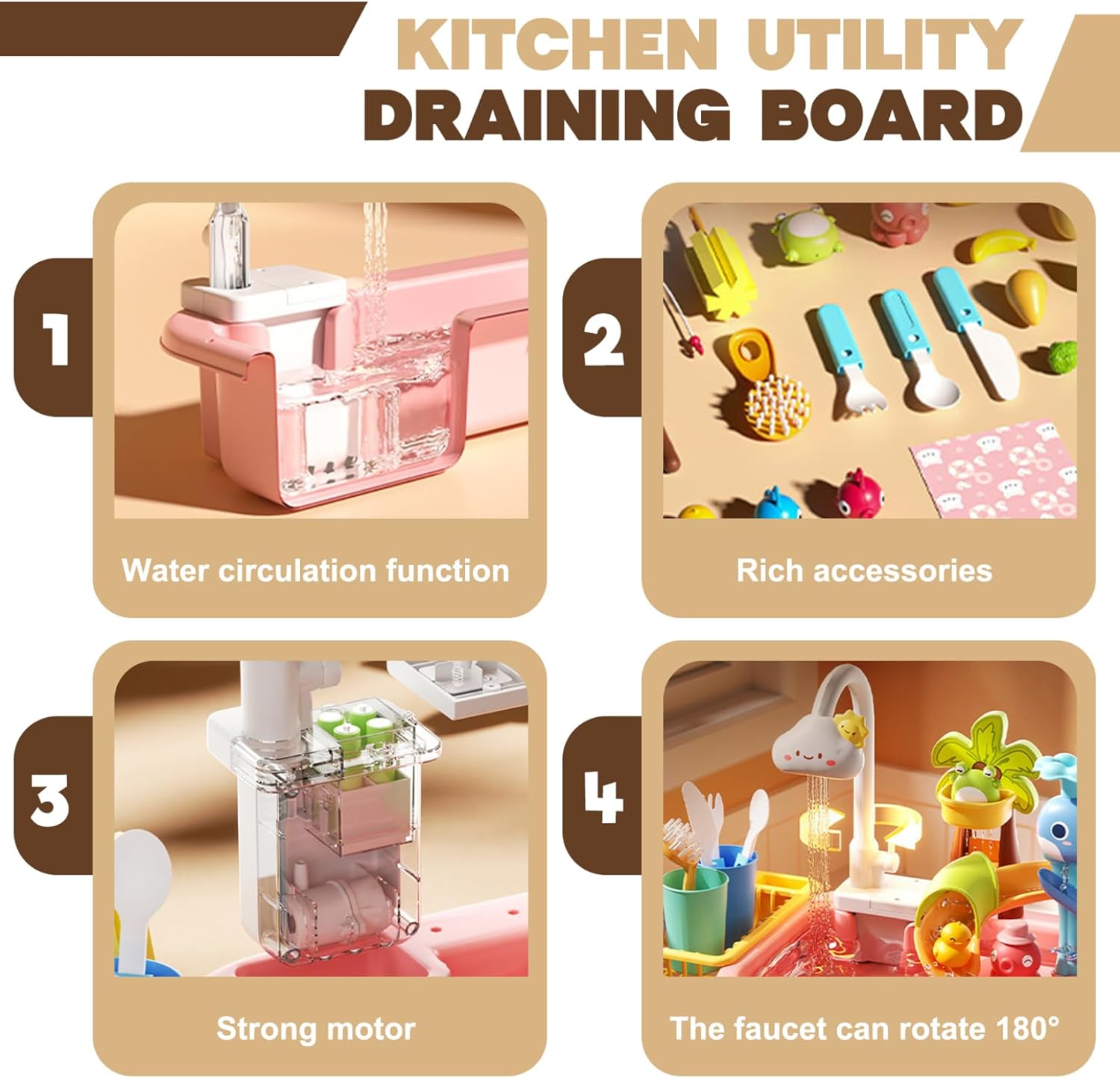 Rubinetto interattivo per l'acqua corrente: il rubinetto elettrico rotante a 180° migliora lo sviluppo delle capacità sensoriali e motorie, fornendo acqua a flusso continuo che coinvolge i bambini in giochi acquatici fantasiosi ed educativi. Portatile e facile da pulire: leggero ma robusto, il design della falda freatica consente un facile montaggio e trasporto e le superfici lisce sono semplici da pulire e mantenere, rendendolo senza problemi per genitori e operatori sanitari. Gambe rimovibili per versatilità: dotato di gambe del tavolo rimovibili, questo lavandino da gioco converte facilmente da un tavolo ad acqua a una versione da tavolo, rendendolo perfetto per vari ambienti di gioco come parchi, asili nido o giardini domestici. Design sicuro: realizzato con materiali atossici e privi di BPA, questo tavolo ad acqua per bambini garantisce un gioco sicuro per i bambini di età compresa tra 1 e 3 anni, costruito per resistere all'uso energetico sia all'interno che all'esterno senza usura o danni. Coinvolgimento educativo e divertente: incoraggia l'apprendimento precoce con attività acquatiche che promuovono la coordinazione occhio-mano, la creatività e i concetti scientifici di base, il tutto divertendosi senza fine con questo realistico lavandino giocattolo.