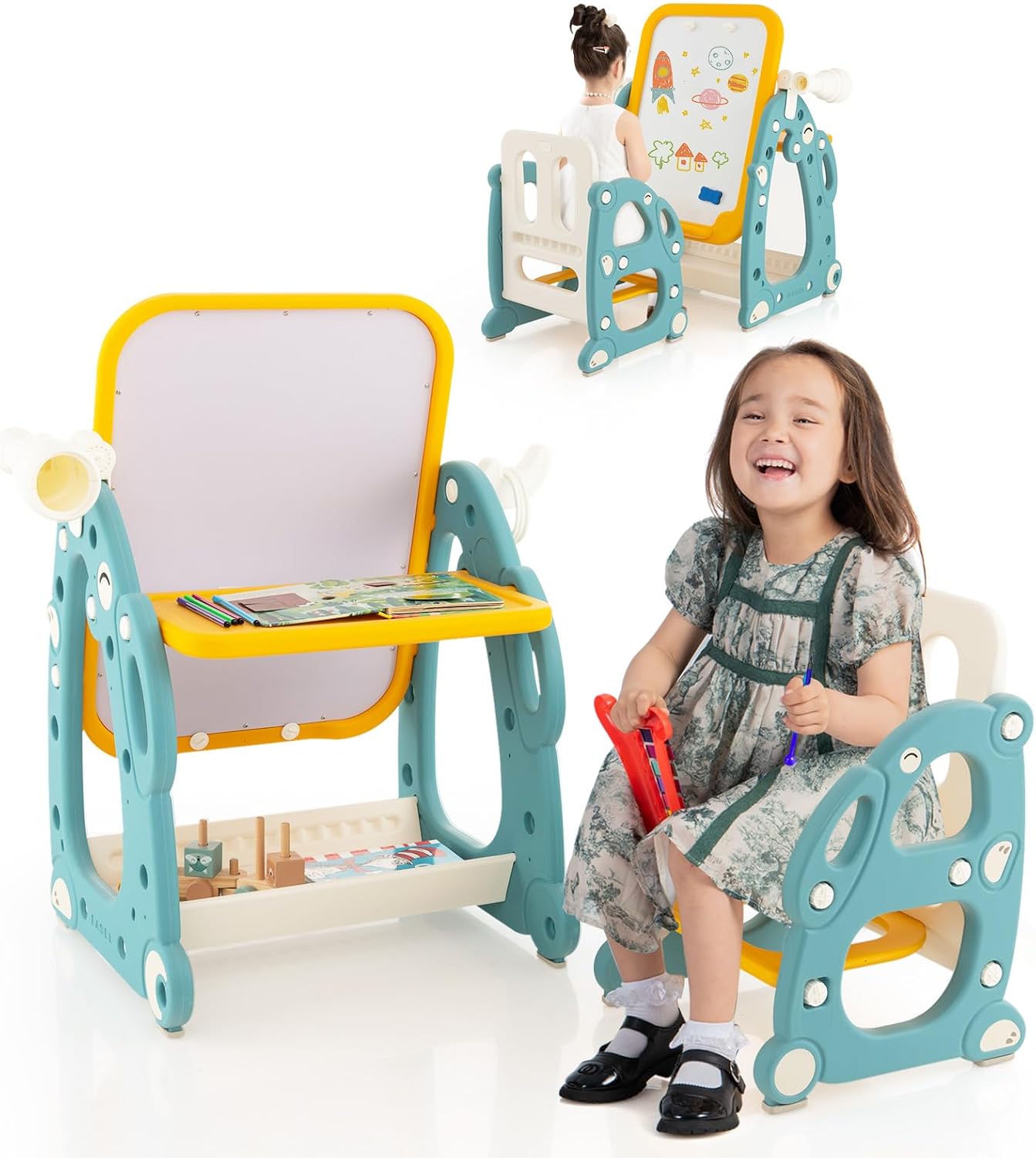 Promuove l'immaginazione: il nostro tavolo da disegno double face di prima qualità vanta una superficie di disegno a lavagna nera su un lato e una superficie di disegno a lavagna sull'altro, rendendo facile per i bambini realizzare graffiti, scrivere o dipingere Massimizza lo spazio di archiviazione: il nostro tavolo da disegno fronte-retro vanta una funzione pieghevole appositamente progettata, perfetta per coloro che desiderano risparmiare spazio! Dopo averlo utilizzato, basta piegarlo e riporlo in modo compatto Design ergonomico per la crescita: man mano che il bambino cresce, l'altezza del tavolo da disegno può essere regolata liberamente per garantire una postura comoda durante il disegno, prevenendo efficacemente la gobba e accompagnandolo in ogni fase della pittura Comfort creativo migliorato: dotato di una comoda sedia antiscivolo progettata per la sicurezza dei bambini, questo tavolo da disegno è realizzato con materiali ecologici e supporta una forte capacità di carico, garantendo un'esperienza di disegno pratica e rilassata Protezione della salute respiratoria: caratterizzato da un design a gesso senza polvere, garantisce che i bambini respirino facilmente evitando il tradizionale inquinamento da polvere di gesso con questo giocattolo da lavagna nero adatto alla casa