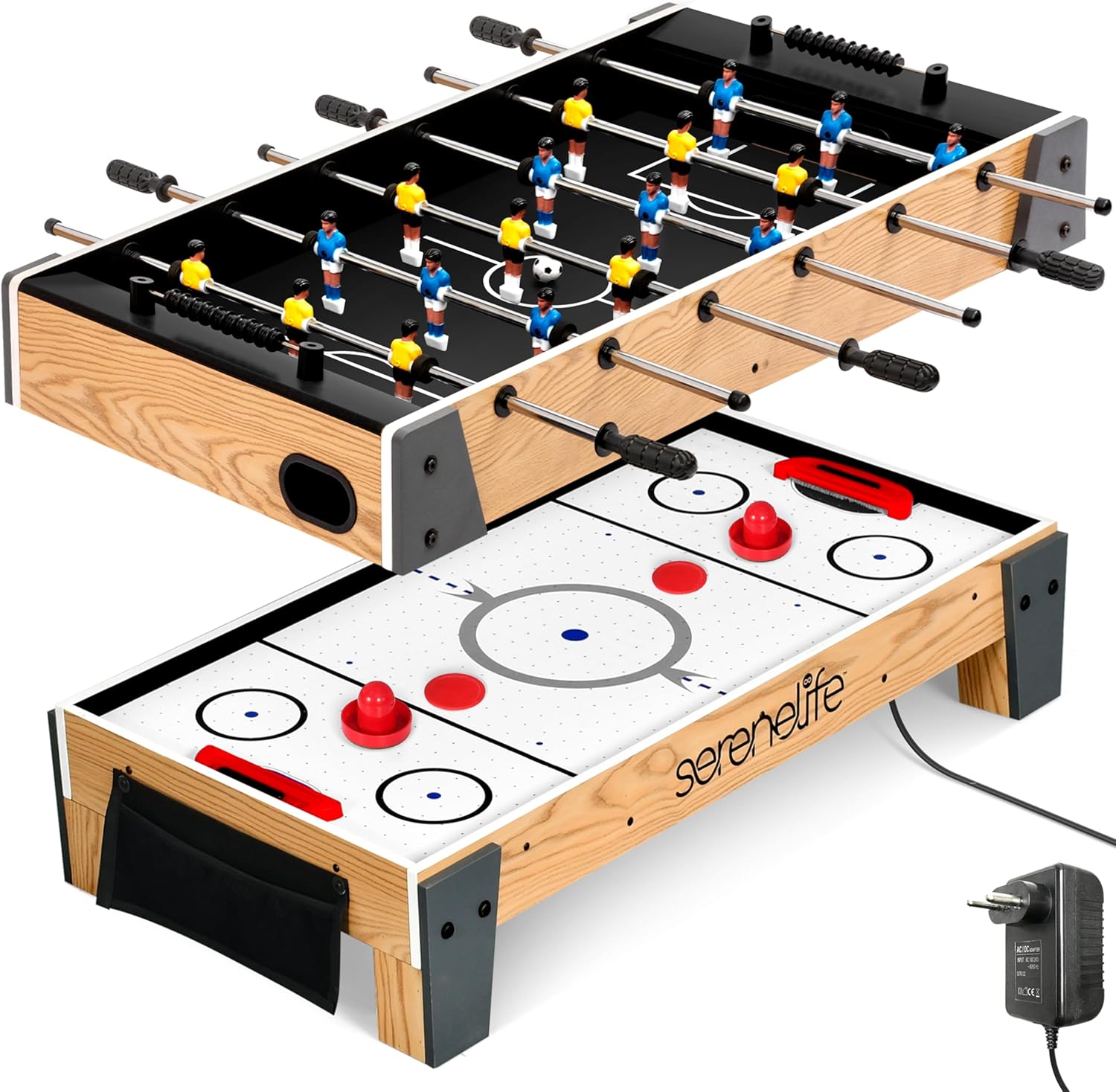 Tavolo da gioco multiplo 2 in 1: biliardino, tavolo da hockey in un unico tavolo da gioco. Il tavolo facilmente girevole è perfetto per tornare indietro e può passare da una partita all'altra in pochi secondi. Facile da montare e da usare: tutti gli accessori necessari per questi giochi sono inclusi. Secondo il manuale grafico dettagliato, puoi assemblare rapidamente il tavolo multi-gioco. Capovolgere la tavola da calcio balilla e diventa tavola da air hockey. Struttura robusta: questo tavolo da gioco è realizzato in MDF di alta qualità per una maggiore durata. La struttura in legno massello e il tavolo offrono un comodo spazio integrato per tutti gli accessori per ogni gioco. Dimensioni: 70 x 36 x 11 cm (lunghezza x larghezza x altezza), peso: 4 kg Perfetta esperienza di gioco: ideale per qualsiasi riunione, questo tavolo 2 in 1 porta l'azione e l'emozione dell'hockey e del calcio ad aria a casa tua: tutti vorranno giocare.