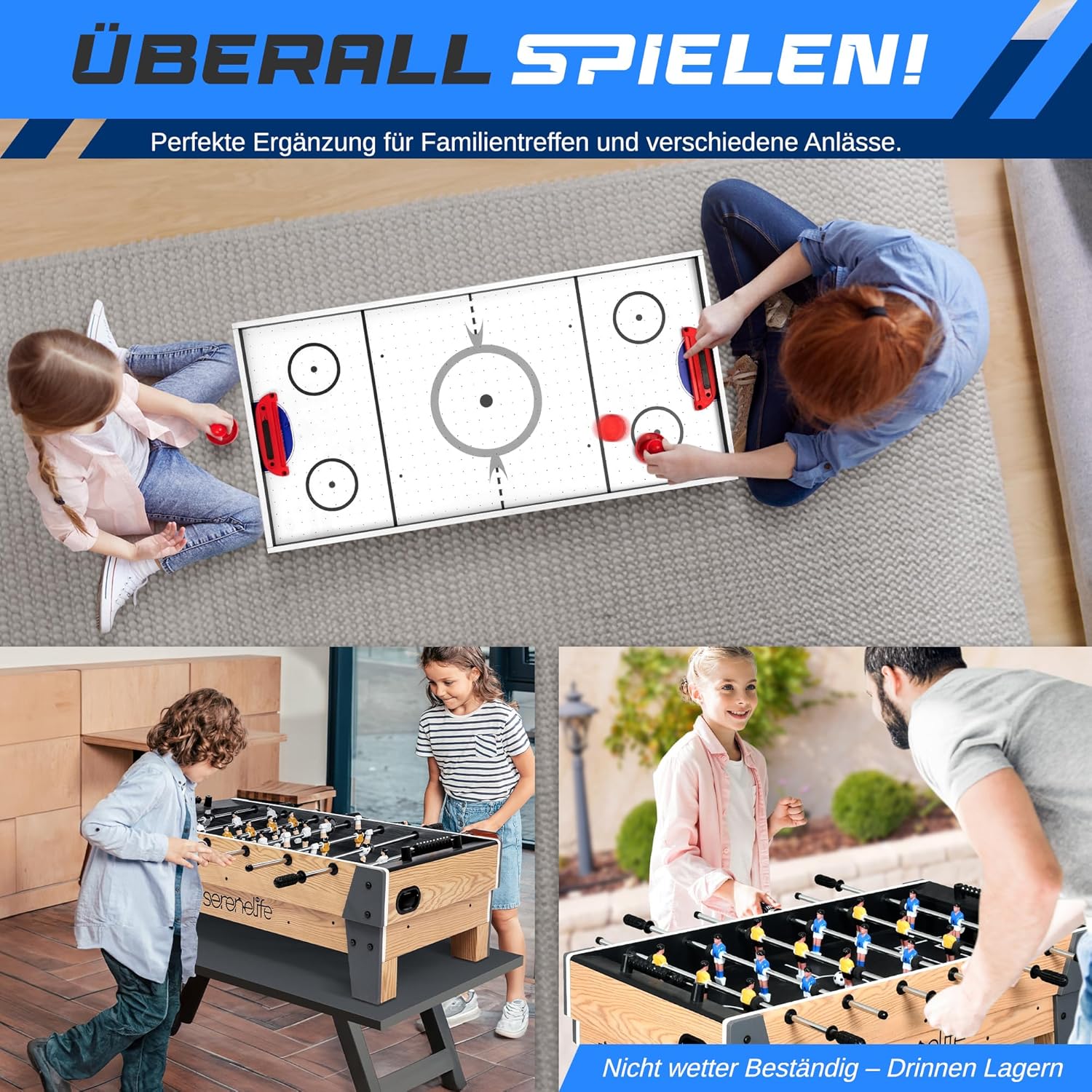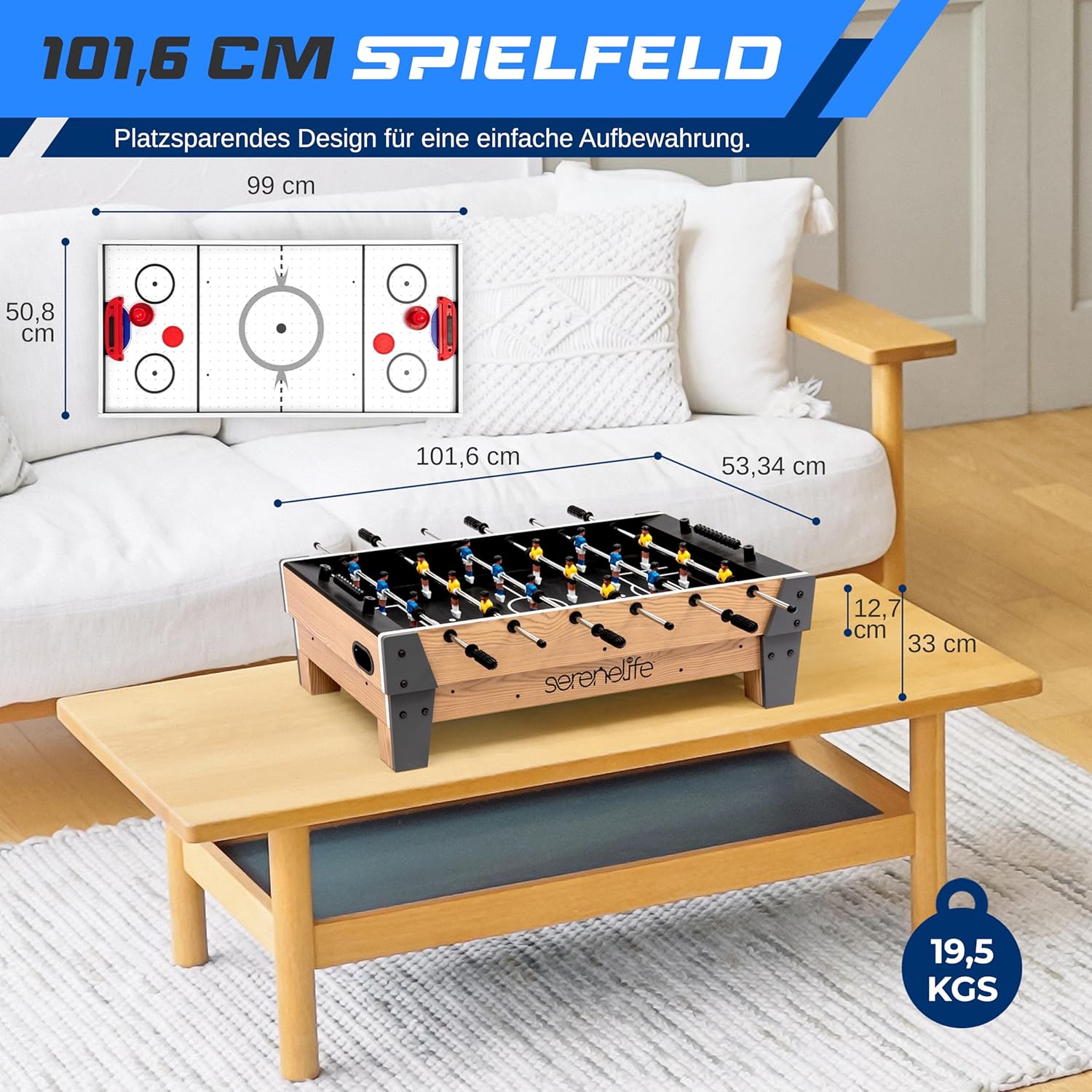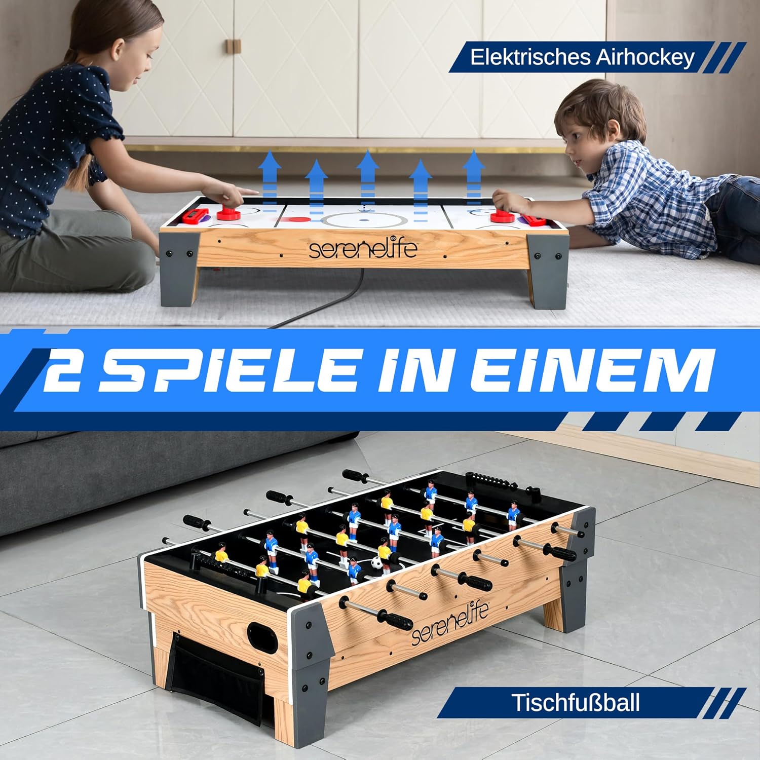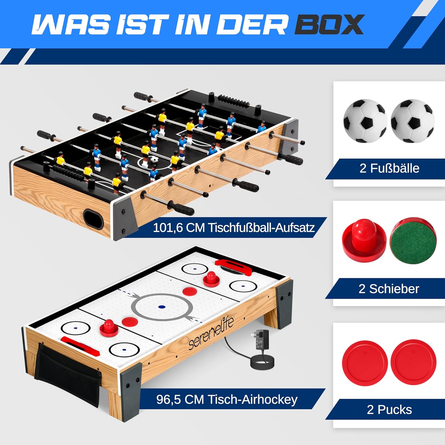 Tavolo da air hockey e calcio balilla pieghevole - Tavolo da gioco 2 in 1 con biliardino e air hockey - Tavolo da gioco versatile per air hockey con calcio balilla. Il tavolo da gioco multifunzionale è ideale per bambini e adulti, perfetto per feste, sale giochi e divertimento nel tempo libero. Robusto tavolo da biliardino per bambini e adulti con robuste sbarre e palline da biliardino: il biliardino è realizzato in MDF di alta qualità con laminato in PVC resistente alle intemperie. Le aste cave in acciaio con placcatura cromata e le impugnature ergonomiche in plastica garantiscono un controllo preciso. Mini biliardino e hockey da tavolo con potente flusso d'aria - Il tavolo da air hockey per bambini ha una superficie di gioco liscia rivestita in PVC che garantisce un gioco veloce e dinamico. Include disco da air hockey e disco da hockey per partite ricche di azione. Biliardino pieghevole salvaspazio con gambe e livellatori regolabili in altezza - Il biliardino pieghevole è dotato di una robusta serratura per la massima sicurezza. Gli angoli arrotondati e la base antiscivolo lo rendono particolarmente sicuro per i bambini. Accessori completi per calcio balilla, air hockey e giochi da tavolo - Include campo da air hockey da 38", campo da calcio balilla da 40", 2 pulsanti da air hockey, 2 dischi, 2 palloni da calcio e tasche laterali per accessori. Segnapunti manuali per entrambe le partite.