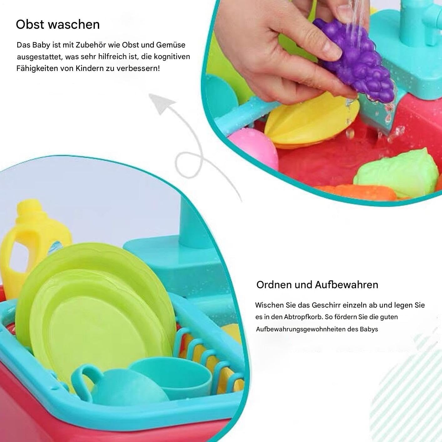 Sviluppo delle capacità organizzative: grande vasca con scomparto per giocattoli integrato allena il pensiero sistematico, lo scolapiatti a più livelli consente una pulizia rapida e un inizio efficiente del gioco Sicurezza: il bordo in gomma impermeabile e gli angoli arrotondati consentono un gioco d'acqua sicuro. La struttura robusta resiste all'uso quotidiano e protegge in modo affidabile i bambini da lesioni. Scenari di sviluppo: la connessione dinamica tra gioco di pulizia e ambiente cucina realistico migliora le capacità cognitive e la coordinazione delle mani: scenari di gioco educativi promuovono efficacemente lo sviluppo mentale durante l'apprendimento esplorativo Momenti giocosi: offre divertimento in cucina con accessori espandibili che rafforzano il legame genitore-figlio. Adatto per uso interno ed esterno. Aumenta la creatività e il piacere attraverso vari giochi di ruolo. Divertimento dinamico: scopri il flusso d'acqua frizzante con controllo realistico, funzionamento a batteria e un rubinetto girevole a 180 gradi. Questo dinamico lavello da gioco favorisce il gioco creativo, il movimento e la scoperta.