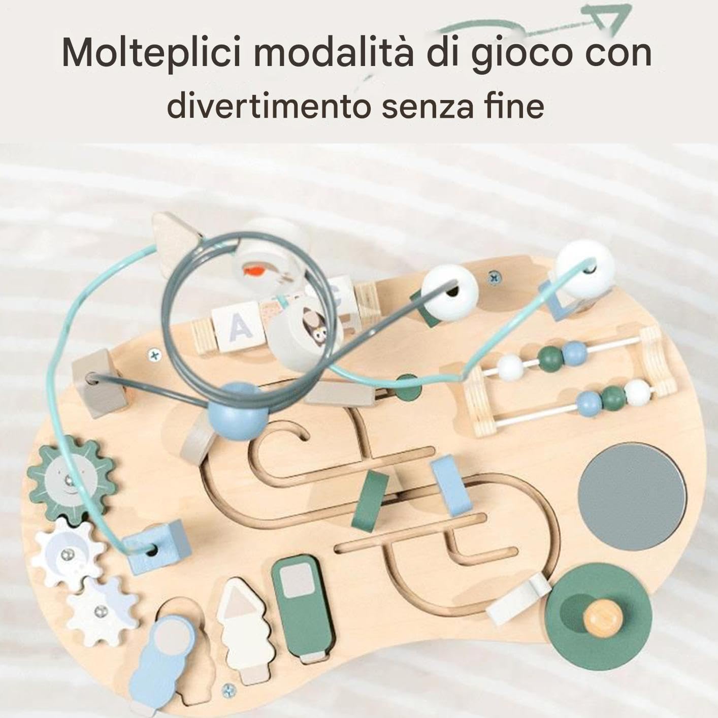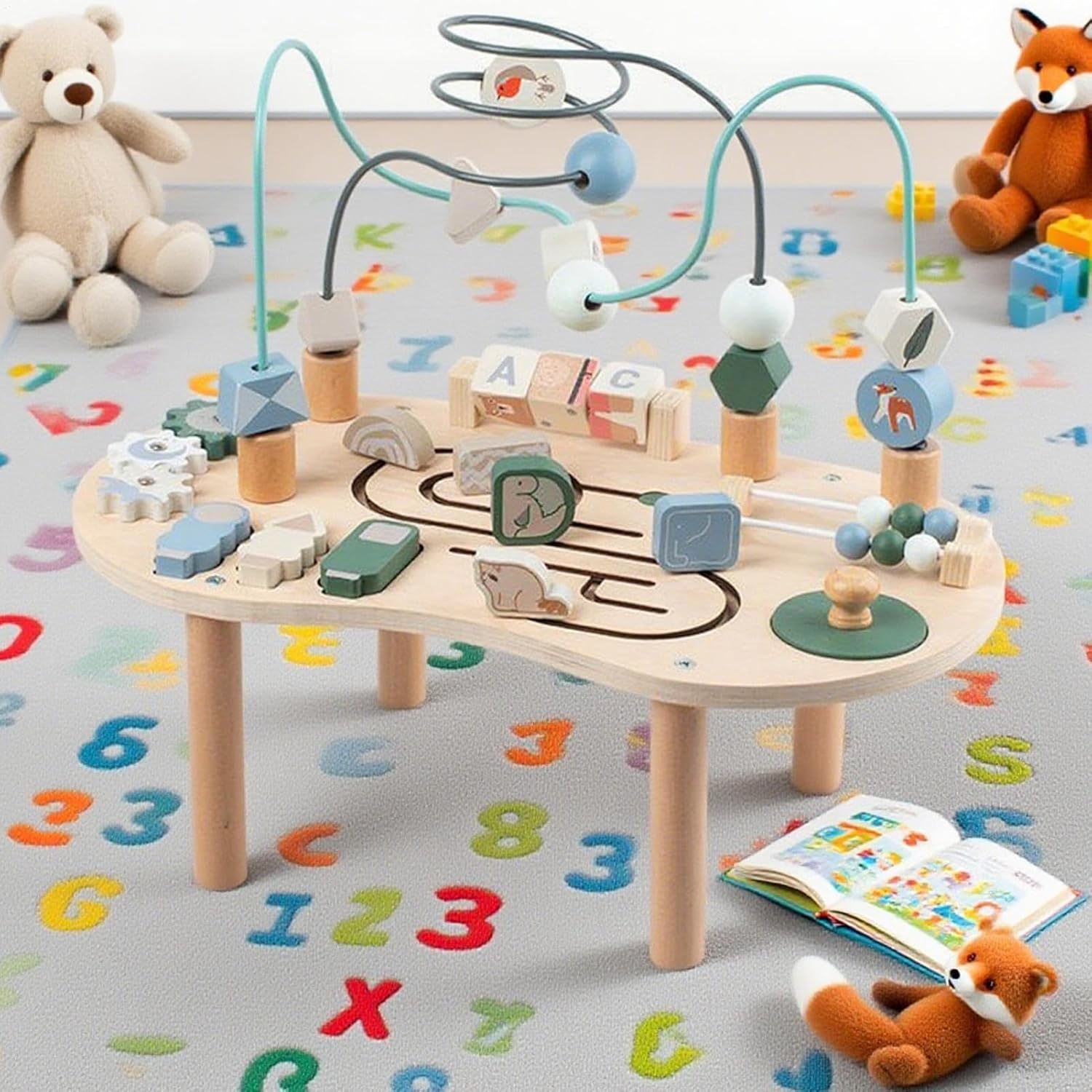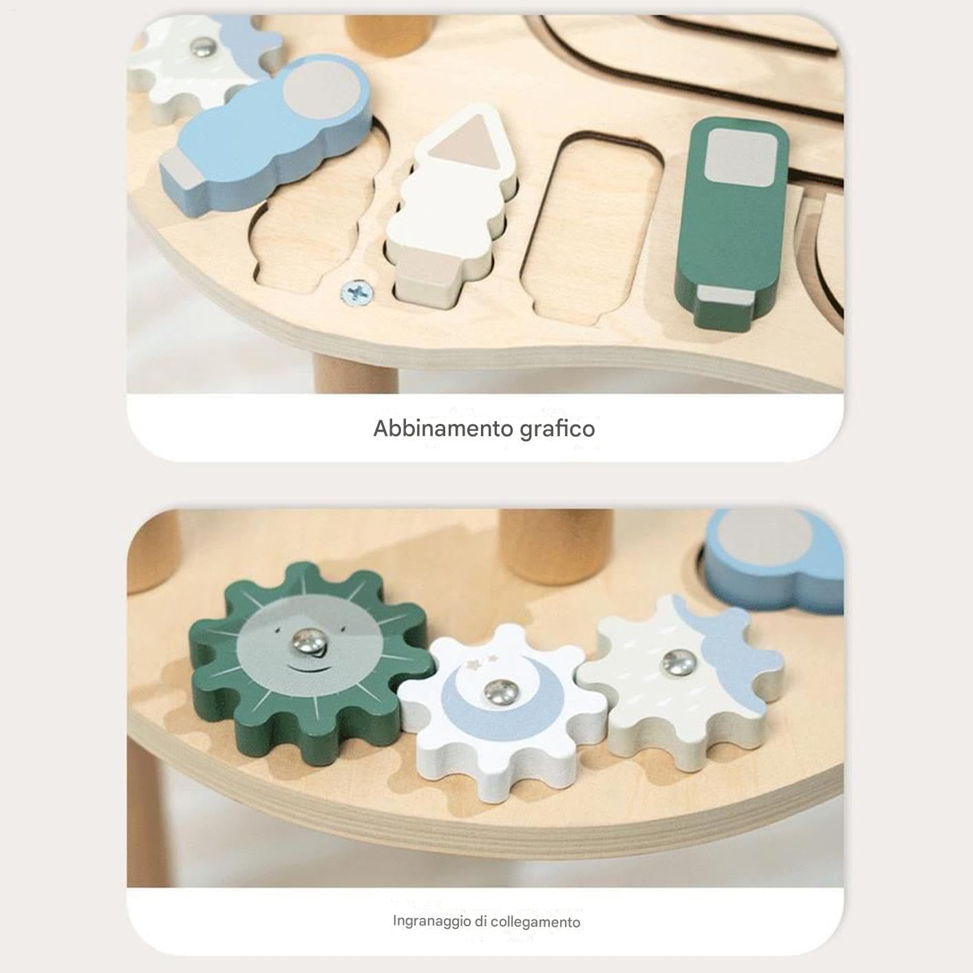 Designo Sicuro Bambini: Tavolo attività con finitura liscia e sicura per bambini, bordi arrotondati in legno naturale e vernice ad acqua per massima durata e utilizzo prolungato garantendo sicurezza durante il gioco Fissaggio Sicuro Componenti: Progettato con assemblaggio a vite che potenzia la struttura, assicura elementi fissati saldamente ed esperienza senza oscillazioni, supportato dalla base stabile a gambe. Esperienza Dinamica: Presenta abbinamento forme, labirinto percorso, palline colorate, labirinto perline, pannello schemi, girevoli e ingranaggi rotanti per un'esperienza di apprendimento multigioco stimolante e varia. Migliora Coordinazione Occhio-Mano: Tavolo attività dinamico costruito per promuovere le abilità motorie fini e supportare le tappe cognitive, offrendo infinite opportunità di gioco creativo favorendo l'apprendimento in un ambiente interattivo e stimolante. Premuroso: Dimostra la tua cura con questo tavolo sensoriale sicuro, regalo per persone care che aggiunge allegria alla vita quotidiana
