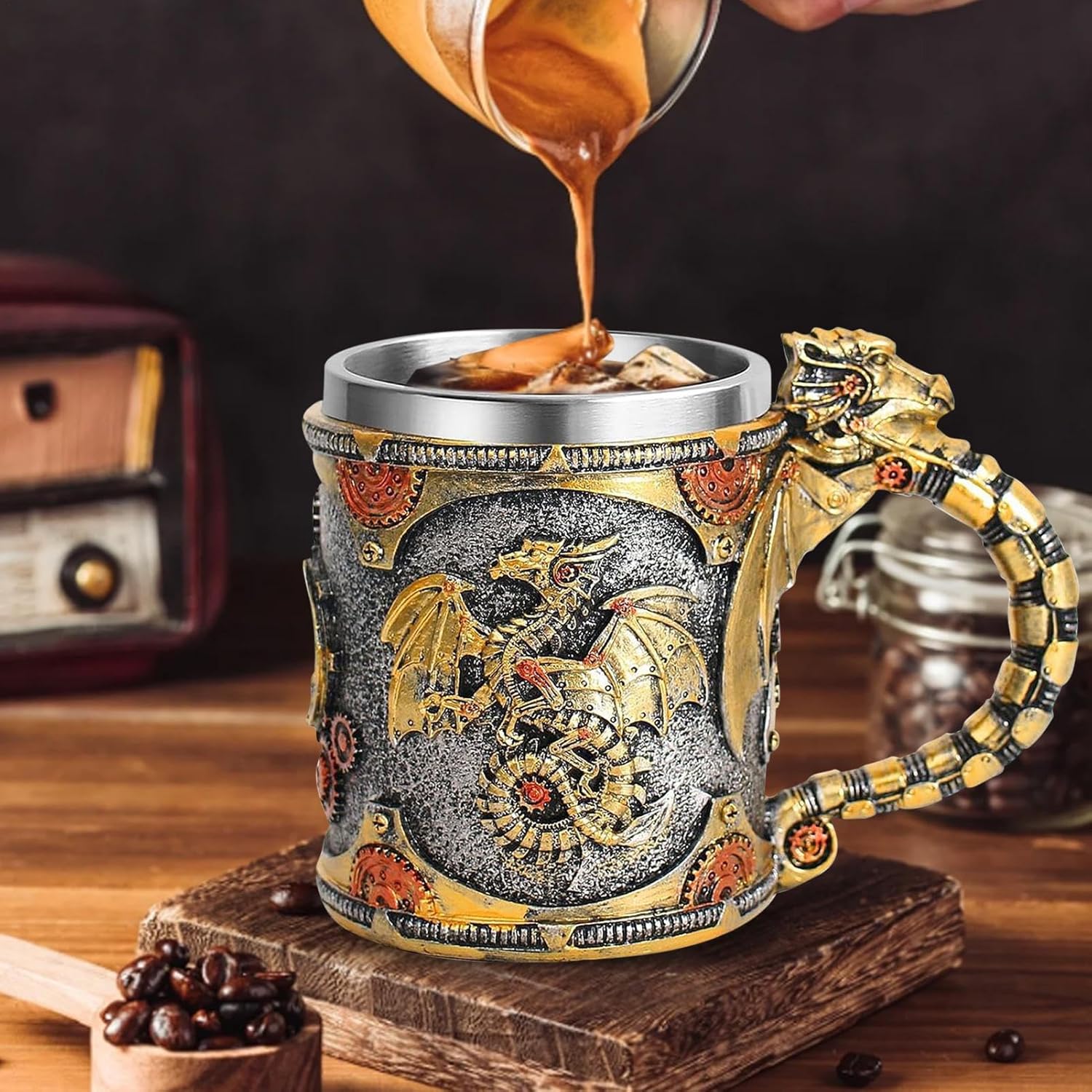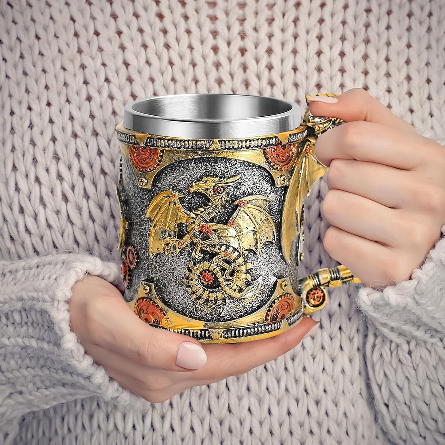 Materiali robusti: struttura resistente al calore in resina strutturata con inserto in acciaio inossidabile per un'esperienza di consumo affidabile e qualità duratura a tutte le temperature Design multifunzionale: ottimizzato per le celebrazioni e la vita lavorativa quotidiana. Il bicchiere da 400 ml gestisce diverse bevande senza sforzo. Soluzione efficiente per diverse esigenze di liquidi grazie all'ampia compatibilità con tutte le bevande. Fantastica decorazione artistica: ispirata allo steampunk e con magistrale rilievo meccanico. La tazza color oro è un pezzo eccezionale e fantastico per gli amanti delle stoviglie artistiche e delle decorazioni uniche. Design confortevole: le superfici antigraffio e l'elegante aspetto opaco rendono la tazza particolarmente resistente. L'impugnatura ergonomica e il bordo premuroso per le labbra garantiscono un'esperienza di consumo confortevole senza alcuna interruzione. Fantastica passione: mostra il tuo amore per la fantasia con questa tazza, che funge da recipiente festivo e decorazione per feste a tema e delizia gli appassionati di design mitici.