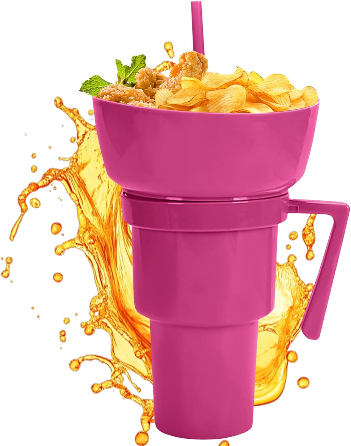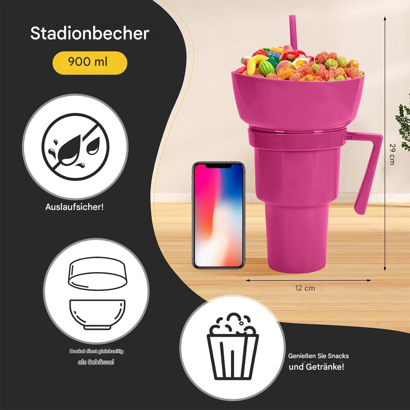 Grande capacità: ideale per viaggi, campeggio, cinema o concerti: la spaziosa tazza per snack e bevande riduce le ricariche e offre un pratico utilizzo quotidiano grazie alla disposizione intelligente dello spazio. Versatile: contiene popcorn, noci, frutta e altri snack in modo sicuro. Indispensabile per feste, incontri sociali ed eventi in cui la funzionalità incontra un design accattivante. Concetto di consumo innovativo: speciale tazza snack con scomparto per bevande integrato per il consumo simultaneo, impedisce il trasferimento di sapori per un'esperienza di spuntino unica. Soluzione regalo ideale: speciale snack per serate di cinema indisturbate, crea un'atmosfera armoniosa e offre un'idea regalo creativa per occasioni speciali con vantaggi pratici. Pratico compagno di snack: con coperchio a tenuta stagna e guarnizione in silicone, previene in modo affidabile le fuoriuscite durante gli spostamenti. Garantisce la pulizia di snack e bevande durante tutte le attività.