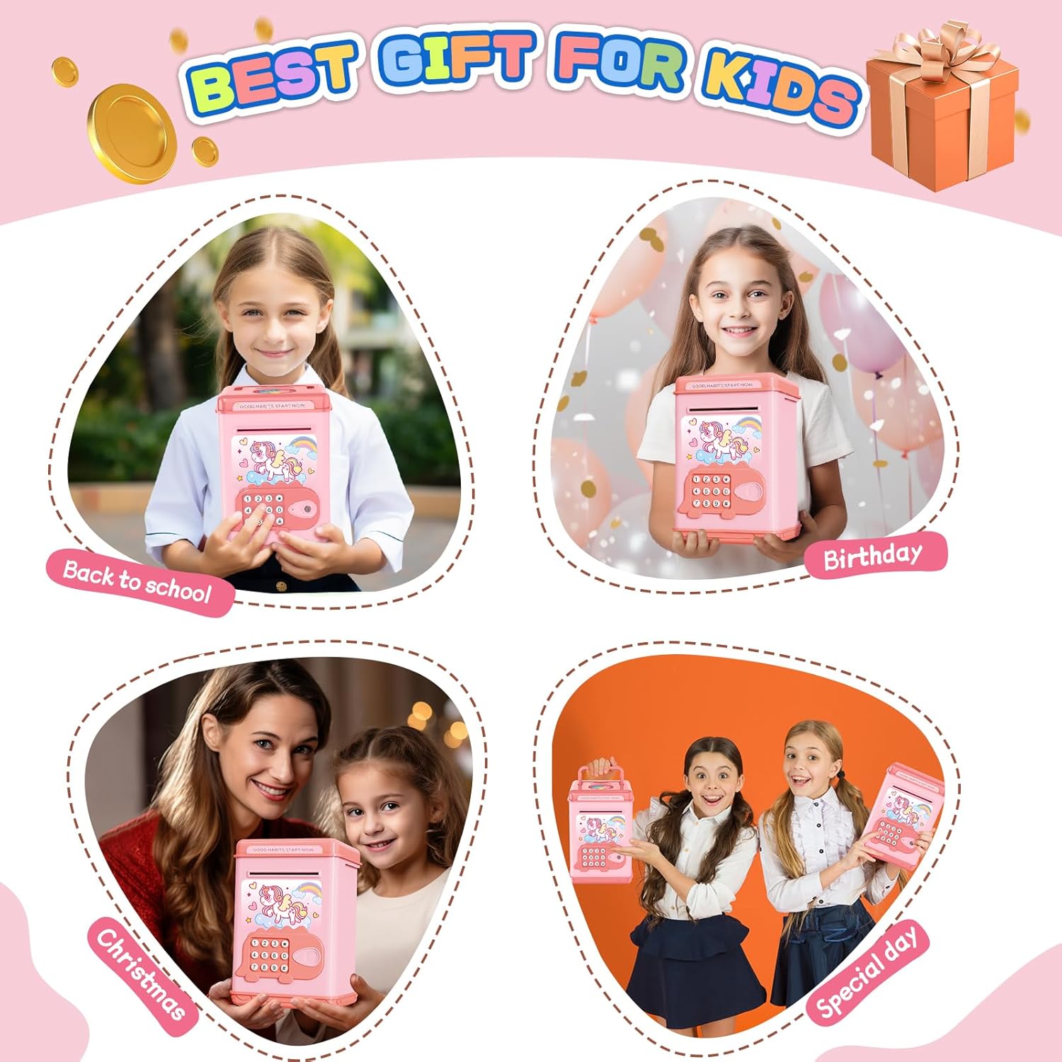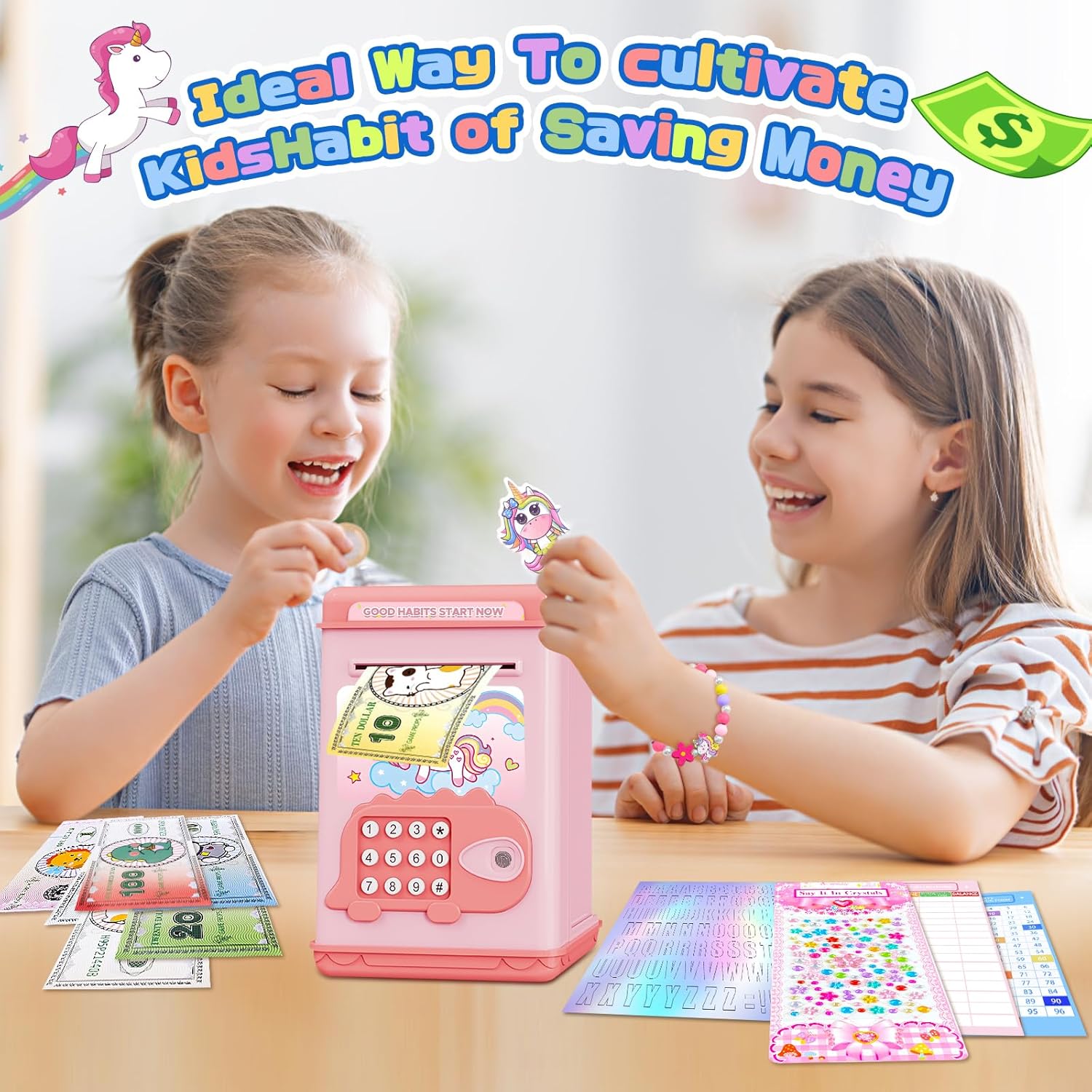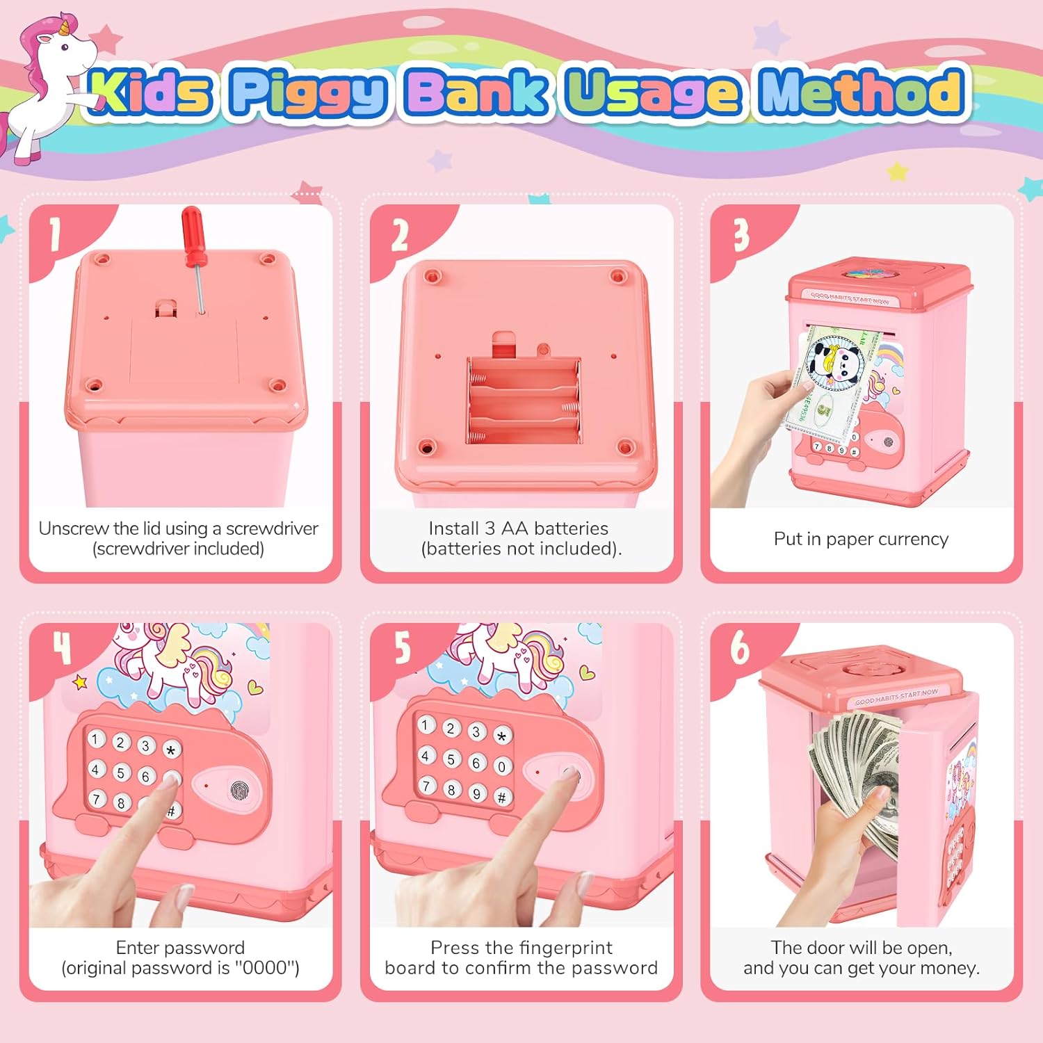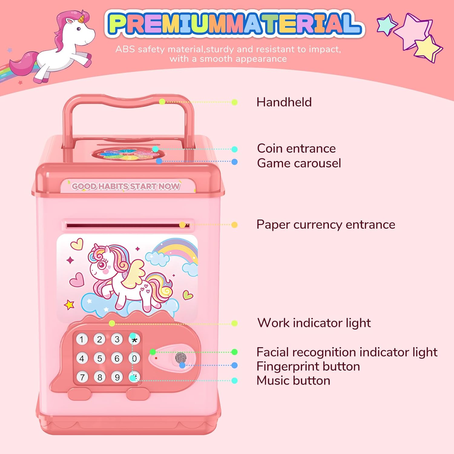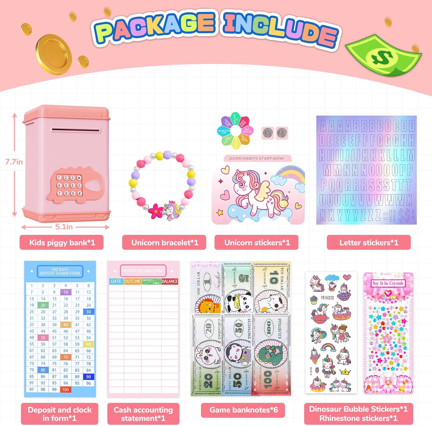 🦄Set salvadanaio per bambini: include un salvadanaio con funzione bancomat, 6 banconote di simulazione, 4 adesivi, 1 libretto di cassa, 1 libretto di risparmio e un braccialetto con unicorno. Il salvadanaio per ragazze ha una fessura per le monete e una fessura per le banconote. Le banconote possono essere prelevate automaticamente, i bambini devono solo inserirle e osservarle mentre vengono prelevate senza intoppi con un segnale acustico, aggiungendo ulteriore divertimento. La fessura per monete superiore può contenere monete e rendere il risparmio ancora più divertente. 🥰Grande capacità Materiale di alta qualità: il salvadanaio sicuro per bambini è realizzato con materiali ABS sicuri di alta qualità, che fornisce un robusto salvadanaio con cui i bambini possono giocare e offre un ampio spazio di archiviazione per un massimo di 600 monete o 100 banconote. La grande cassaforte può essere utilizzata anche per riporre lettere, piccoli giocattoli, orologi, gioielli e altri piccoli oggetti, dando ai bambini un senso di sicurezza. Batteria: richiede 3 batterie AA (non incluse). 👧Scatena la creatività della tua ragazza: personalizza il salvadanaio unicorno per ragazze per renderlo davvero unico. Disegna il nome o le parole preferite di tuo figlio con le lettere adesive e decora il salvadanaio con adesivi in cristallo per rendere il tuo salvadanaio unicorno più creativo, ideale per decorare la stanza dei bambini. Il design divertente e carino può attirare l'interesse dei bambini e incoraggiarli a risparmiare denaro. 💞Doppia protezione tramite password: questo salvadanaio per bambini ha una password di 4 cifre (password predefinita 0000) + riconoscimento dell'impronta digitale/del volto. Dopo aver inserito la password, premere l'impronta digitale per aprire la porta della cassaforte per bambini. (Il riconoscimento del volto e dell'impronta digitale sono solo per l'intrattenimento dei bambini e non hanno funzioni reali di volto e impronta digitale) Il salvadanaio ATM per bambini è perfetto per tenere al sicuro i soldi del tuo ragazzo/a! garantire la sicurezza del risparmio! 😊Funzione musicale: premi "#" sulla cassaforte del salvadanaio per riprodurre musica allegra e creare un'atmosfera rilassata e piacevole, lascia che i bambini si sentano felici ed eccitati durante il processo di risparmio per aumentare la loro motivazione e positività. Il libretto di risparmio e il modulo di prenotazione aiutano i bambini a stabilire abitudini di risparmio. Annotando la data e l'importo di ciascun deposito, i bambini possono vedere chiaramente i progressi dei loro risparmi e sono motivati a continuare a risparmiare. 🎁Scelta del regalo perfetto: il nostro salvadanaio con unicorno è il regalo ideale per ogni ragazza. Questo regalo non è solo un divertente giocattolo fai-da-te, ma aiuta anche i bambini a sviluppare buone abitudini di risparmio e consapevolezza finanziaria. È un regalo premuroso e memorabile per compleanni, Natale, Pasqua o occasioni speciali.