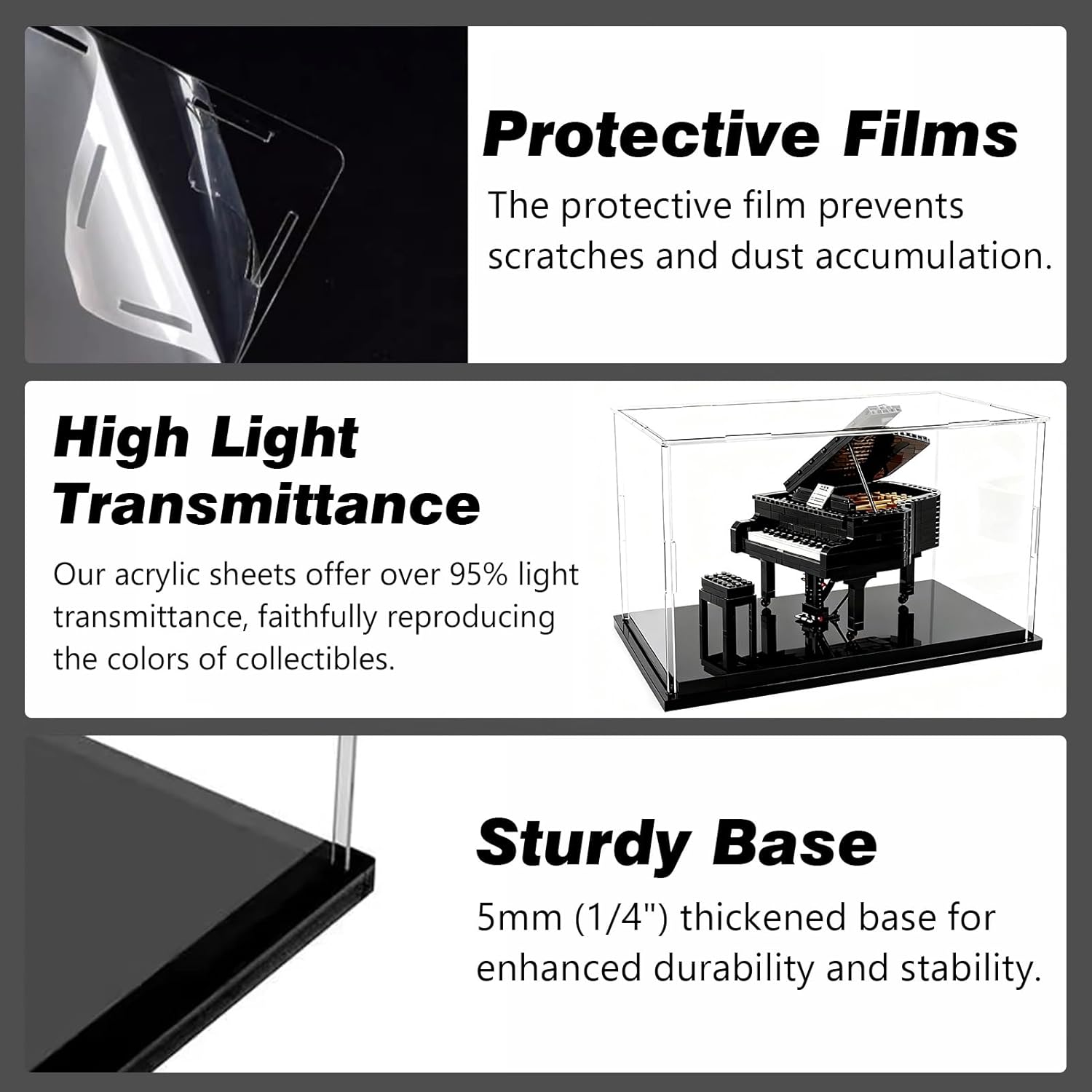 【Elevata trasmissione della luce】Questa teca espositiva utilizza materiale acrilico di alta qualità spesso 2 mm (1/8") con una trasmissione della luce del 95%, creando un guscio protettivo cristallino che riproduce fedelmente i colori reali degli oggetti esposti da qualsiasi angolazione. 【Protezione da polvere e raggi UV】Le proprietà sigillanti superiori dell'acrilico bloccano efficacemente l'intrusione di polvere, riducendo al contempo l'esposizione alla luce solare e ai raggi UV. Una teca espositiva in acrilico previene l'ingiallimento e lo scolorimento, garantendo che i tuoi oggetti da collezione rimangano in perfette condizioni. 【Costruzione robusta】La base è realizzata in materiale composito spesso, che fornisce un solido supporto per la tua collezione. La connessione a scatto garantisce la stabilità complessiva, consentendo un movimento senza sforzo della teca e del suo contenuto. 【Ampiamente applicabile】Le teca espositive in acrilico sono ideali per esporre oggetti da collezione, cimeli sportivi, statuette, gioielli personalizzati, personaggi di anime, souvenir, modellini, statue e altri oggetti da collezione. Sono soluzioni essenziali per riporre gli oggetti in casa e rappresentano regali unici e premurosi per amici e famiglia. 【Fasi di installazione】: 1. Rimuovere la pellicola protettiva dal pannello. 2. Installare il pannello posteriore perforato (Nota: inserire la parte sporgente più lunga della linguetta a scatto nel foro sulla piastra di base). 3. Installare i pannelli laterali sinistro e destro con le clip. 4. Installare i pannelli anteriori. 5. Installare il pannello del soffitto per completare l'installazione.