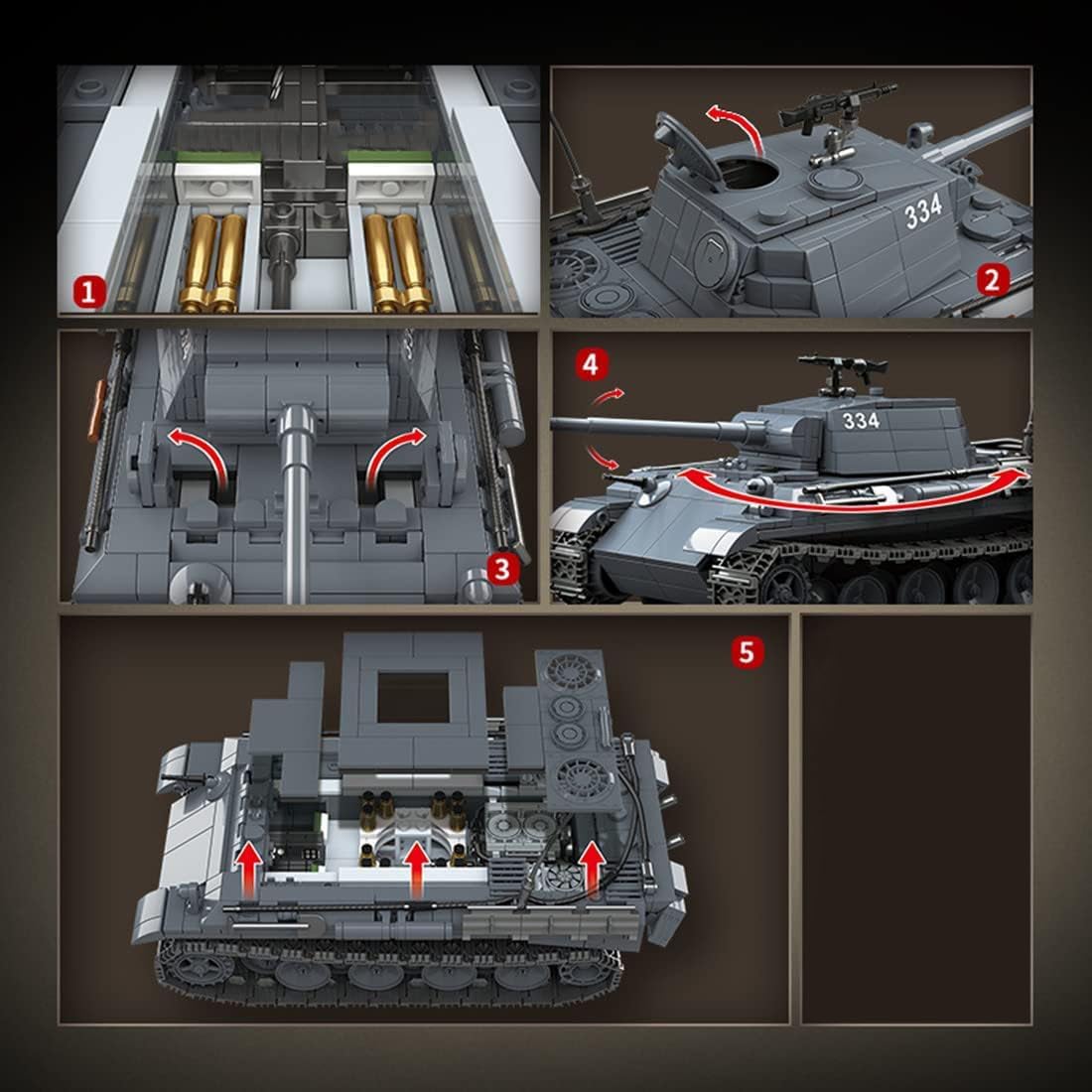 Questo è un modello di carro armato da combattimento con 1180 pezzi. Portelli a torre blindata, portello del serbatoio apribile, torre girevole a 360°, struttura della vasca rimovibile rapidamente. Il serbatoio è lungo 31,3, largo 12,7 cm e alto 14,8 cm Blocchi di costruzione del serbatoio con piccoli accessori, ogni parte dell'accessorio è confezionata singolarmente in un sacchetto di imballaggio separato. Allo stesso tempo, sono allegate istruzioni di montaggio dettagliate, molto dettagliate e di facile comprensione. Realizzato in materiale ABS ecologico e sicuro, è naturalmente sicuro e innocuo. I giocattoli assemblati hanno una struttura robusta e sono realistici, il che garantisce meglio la sicurezza durante il montaggio dei giocattoli. Il modello MOC del camion blindato ha un alto valore di memoria e raccolta. È sicuramente un eccellente oggetto da collezione per le persone che amano costruire progetti di ingegneria e amano i modelli di blocchi militari. Allo stesso tempo, è anche perfettamente compatibile con i mattoncini di marca sul mercato. Il design modulare è facile da costruire, con prodotti tecnici, può migliorare l'agilità/pensiero/concentrazione/memoria/fantasia/creatività. Questo giocattolo con carro armato ben realizzato è sia una ricompensa per voi stessi che un regalo perfetto per collezionisti adulti.