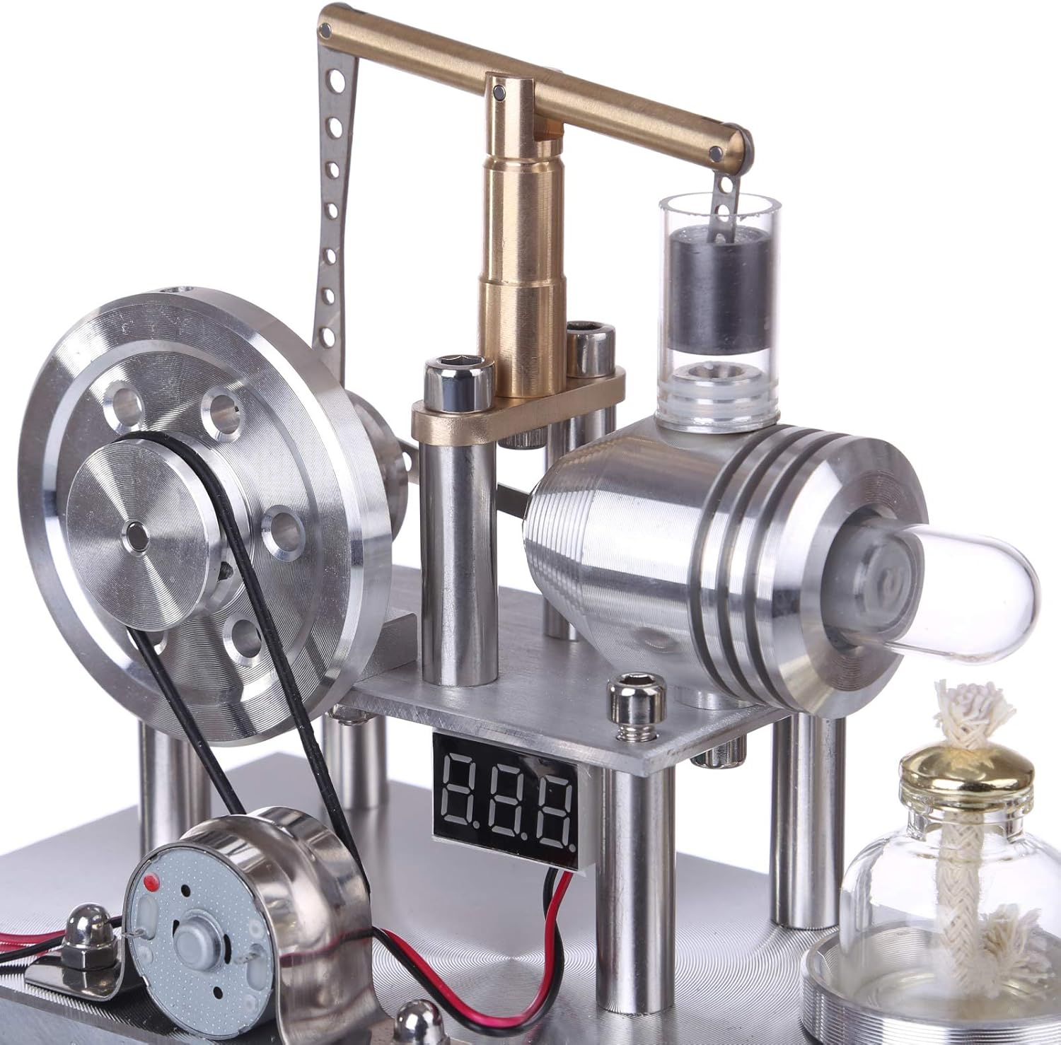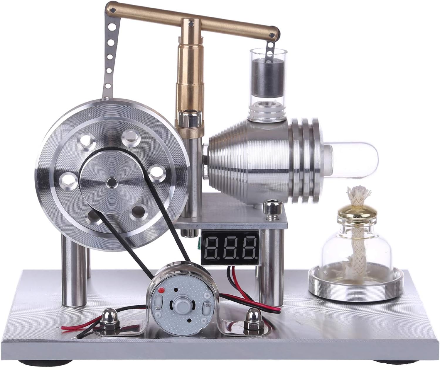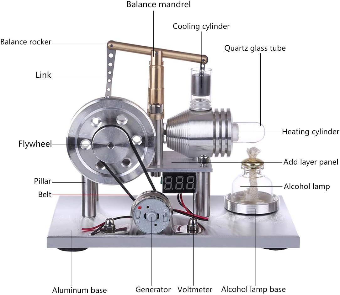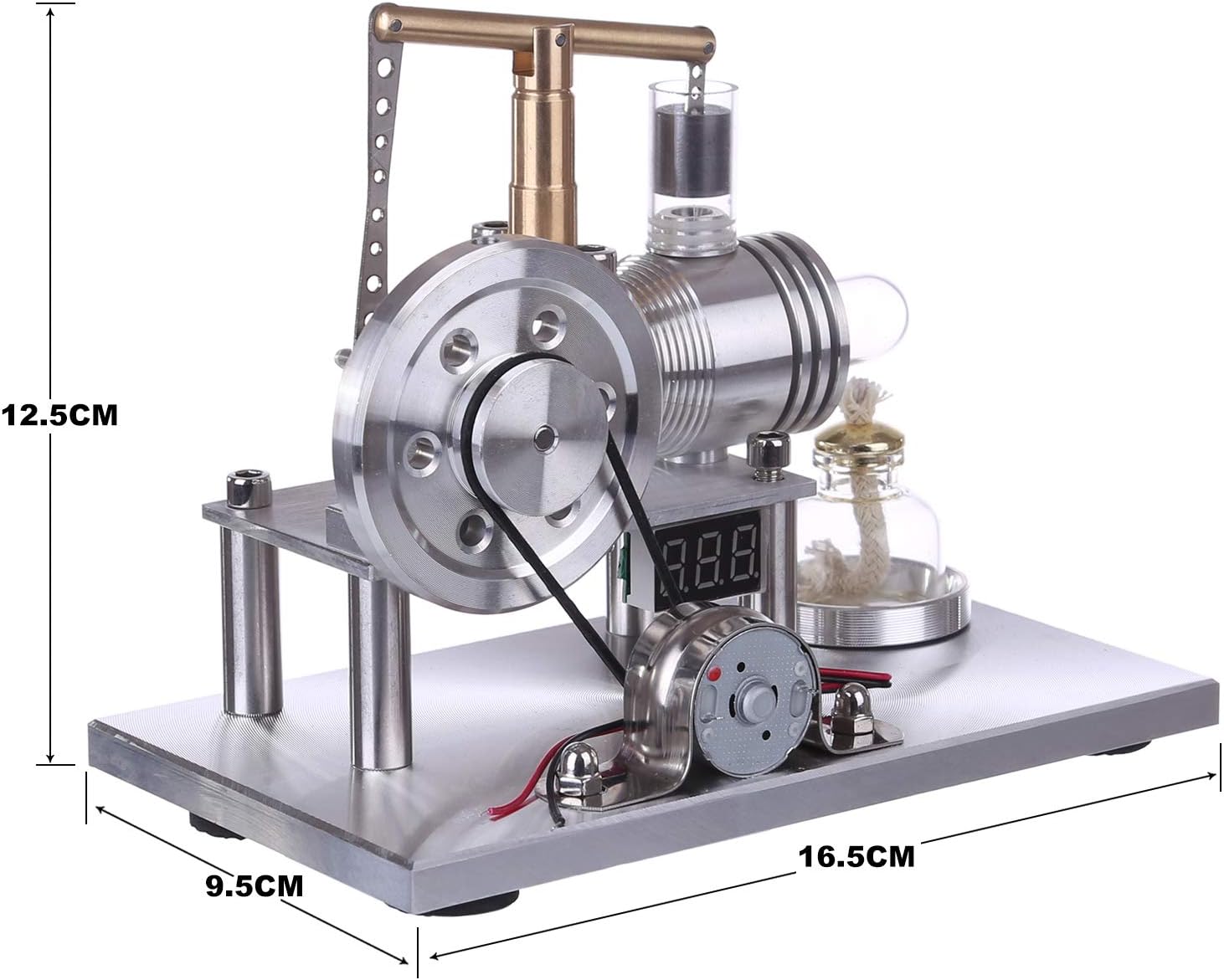 Motore Stirling: a differenza dei normali motori Stirling, ha una struttura equilibrata. È dotato di un piccolo generatore ed è riscaldato dall'alcol. Il motore funziona costantemente ad alta velocità e genera corrente che può fornire un indicatore di tensione digitale luminoso o una lampadina. Giocattolo educativo: questo è un giocattolo divertente e fantasioso con tecnologia desktop che è ancora più attraente quando si tenta di far funzionare il motore al buio. Osserva il lavoro magico e il processo di conversione dell'energia. Pregevole fattura: realizzato in metallo. La superficie è finemente lucidata per prevenire la ruggine e lo sbiadimento. Il tubo di vetro al quarzo ispessito può essere riscaldato a lungo. Il pistone può funzionare per un lungo periodo di tempo, e non è facile da trasportare. Uso: non è solo un giocattolo educativo scientifico che può essere utilizzato per studiare il principio di funzionamento del motore a combustione interna esterno e fornire materiale per progetti scientifici per ispirare la loro curiosità e creatività, ma anche una fantastica opera d'arte da desktop. Regalo: un ottimo regalo per gli appassionati di tecnologia, familiari e amici. Con un tubo di vetro di ricambio e una boccola a pistone. Se avete bisogno di pezzi di ricambio, non esitate a contattarci.
