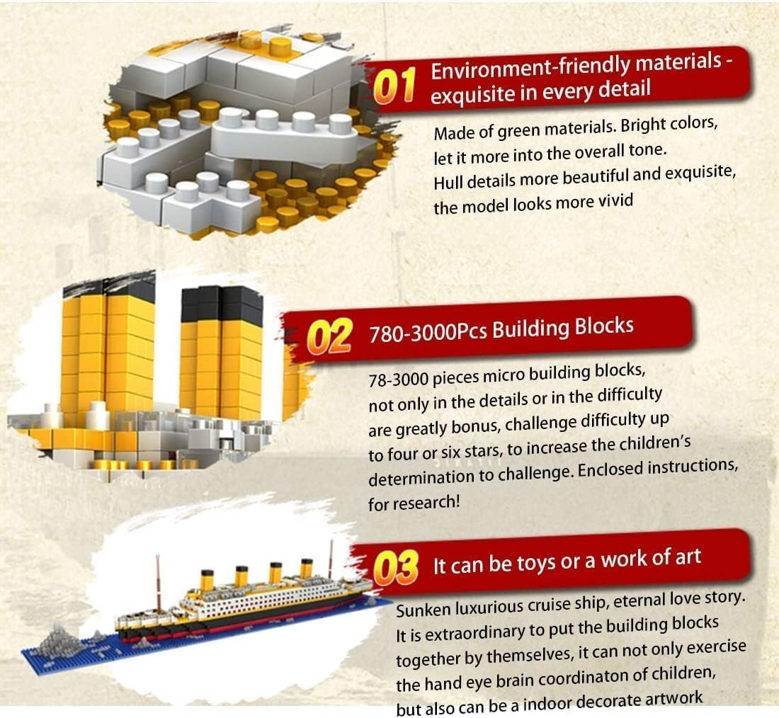 Il model kit del Titanic è un modello architettonico in mini nanoblocchi con 1860 pezzi, che misura 56 x 11 x 8 cm e una scatola che misura 30 x 22 x 5 cm. Ispirazione del design: l'ispirazione viene dalla nave Titanic, uno dei modelli architettonici più famosi al mondo. Il modello architettonico proporzionalmente restaurato della nave Titanic dona un senso di realtà molto reale, e il kit assemblato è molto bello e raffinato e può essere utilizzato come pezzo da esposizione e da collezione. Un progetto di costruzione utile per te: è un fantastico regalo di compleanno, Natale o una sorpresa per i fan della serie "Titanic" e i costruttori di tecnologia dagli 8 anni in su. Questo set di costruzioni per navi da crociera aiuterà il tuo bambino a sviluppare la coordinazione occhio-mano, a migliorare il pensiero logico e a promuovere le capacità di risoluzione dei problemi. Questo prodotto è un mini elemento costitutivo e non è compatibile con i principali marchi. Goditi un'esperienza di costruzione coinvolgente con il kit modello tecnologico. Allora scopri le caratteristiche originali del Titanic.