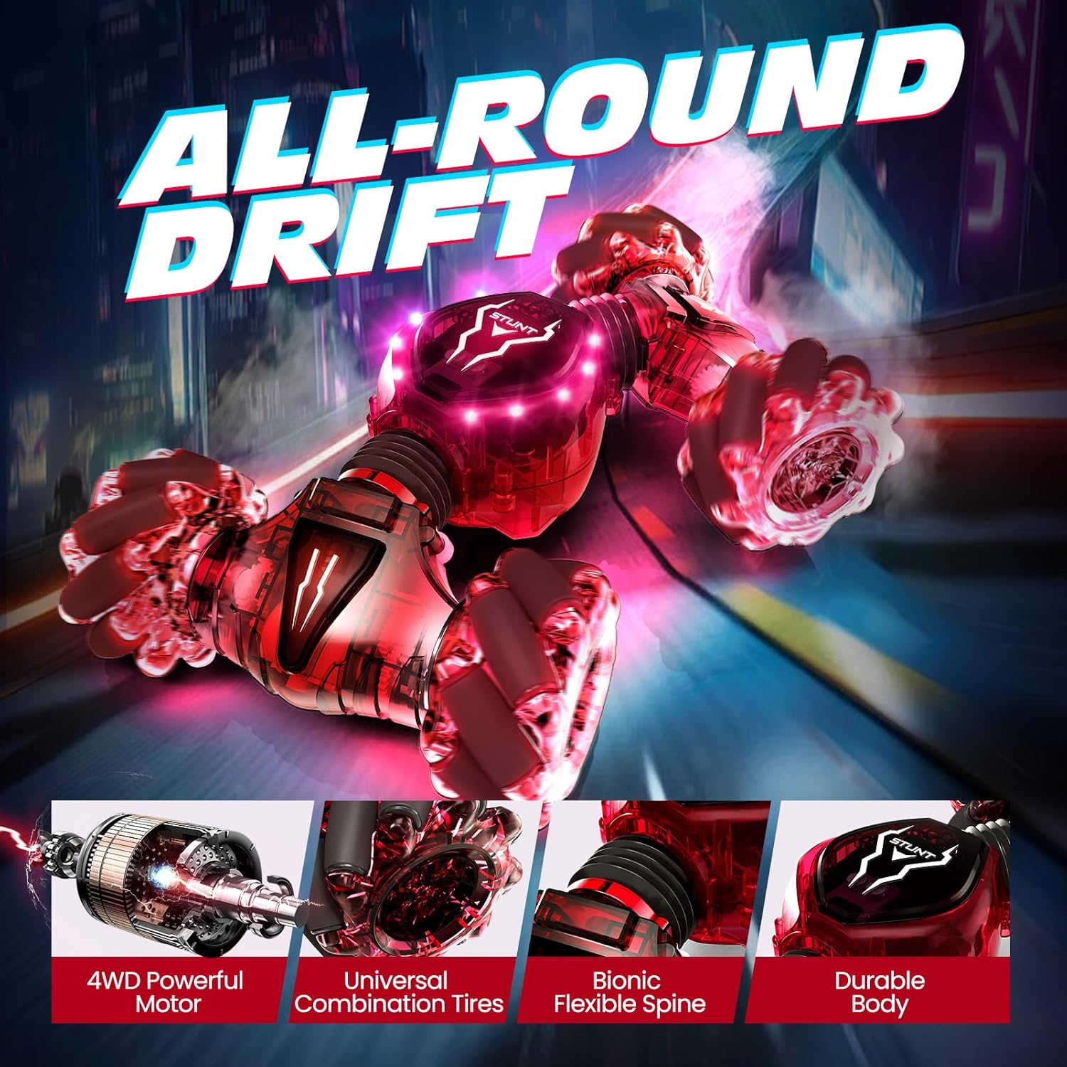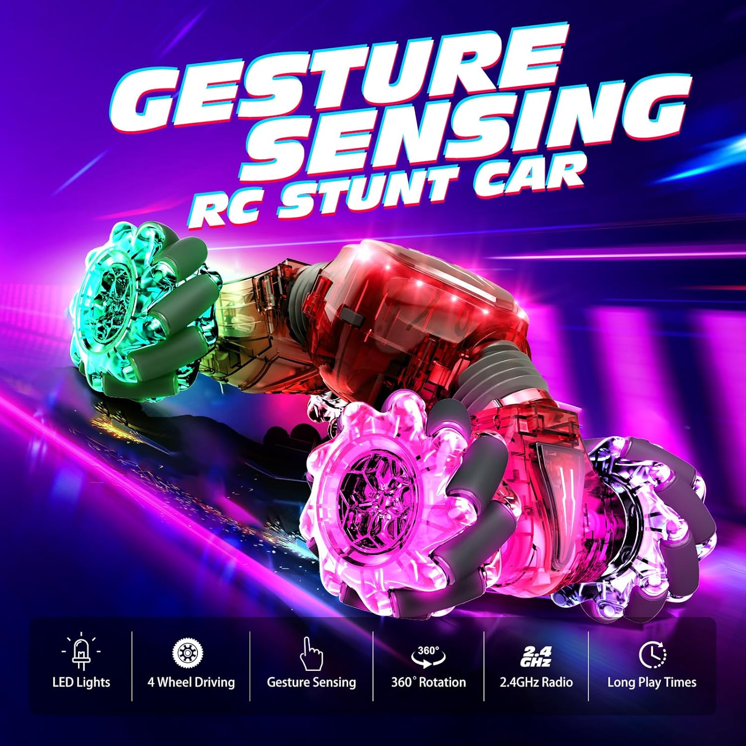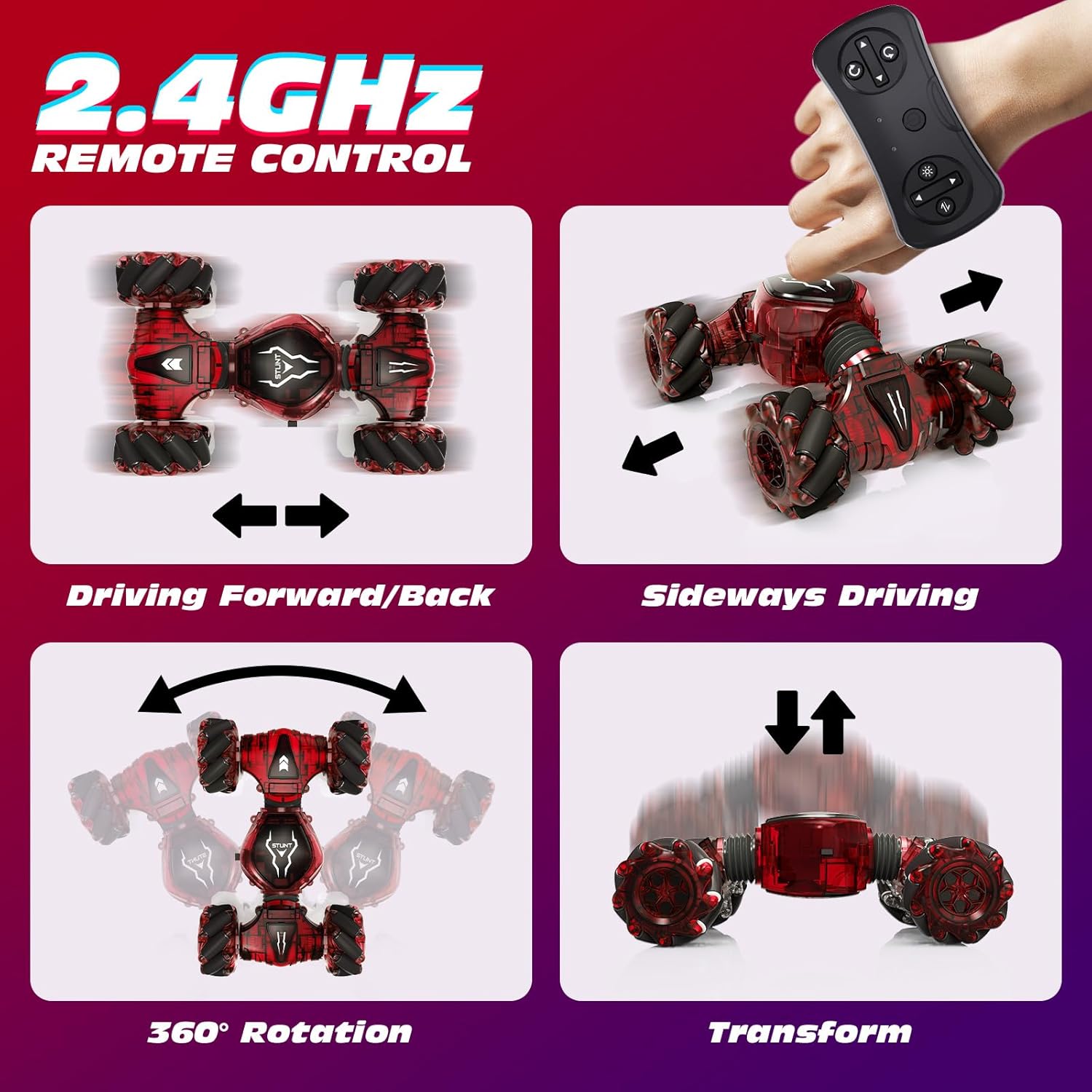 【 Anti collisione e anti caduta RC Car】 L'auto telecomandata non solo può muoversi in tutte le direzioni, ruotare su entrambi i lati, ma anche in tutte le direzioni, ruotare e deformare a 360°, passare liberamente tra modalità autostradale e fuoristrada. Utilizziamo appositamente materiali ABS per soddisfare tutte le superfici come sabbia, prati, terra, rocce, ecc. Sia all'interno che all'aperto, è il compagno divertente del vostro bambino. 【Facile controllo intelligente dei gesti】: l'auto controllata a mano è dotata di telecomando da 2,4 GHz e orologio gestuale. La tecnologia migliorata a 2,4 GHz è a prova di interferenza e stabile, allo stesso tempo supporta il gioco multiplayer. Indossando un orologio gesti, è possibile visualizzare facilmente l'auto RC per muoversi in qualsiasi direzione. Questa funzione aggiunge ulteriore divertimento all'esperienza di gioco e allo stesso tempo migliora in modo completo lo sviluppo coordinato del corpo del bambino. 【3 batterie per 45 minuti】: auto radiocomandata Tecnock viene fornita con 3 batterie ricaricabili da 500 mAh e un caricatore USB che può funzionare per 45 minuti su tre batterie. Estende il tempo di guida a oltre 45 minuti e rende il divertimento ininterrotto. La ricarica della batteria tramite USB è semplice e evita il fastidioso smontaggio della batteria. La funzione di protezione da sovraccarico integrata garantisce completamente la sicurezza della ricarica. Protezione per gli occhi e illuminazione fresca: le ruote della RC Stunt Cars possono emanare affascinanti effetti di luce, attirare l'attenzione dei bambini e offrire una meravigliosa esperienza visiva. Sia di giorno che di notte, queste affascinanti luci sono ben visibili. I bambini possono ora controllare le loro RC Cars e allo stesso tempo godere di affascinanti effetti di luce che offrono loro un'esperienza migliore. 【Il regalo perfetto per i bambini】: questo giocattolo per auto può offrire un divertimento senza fine. Ha sia un aspetto fresco che una ricca funzionalità. Adatto per ragazzi, ragazze e adulti di età compresa tra 4,5, 6, 7, 8, 9, 10, 11 e 12. È il regalo perfetto per auto giocattolo per compleanni, festa dei bambini, vacanze, Natale, Halloween e Capodanno, un regalo che ogni bambino vuole