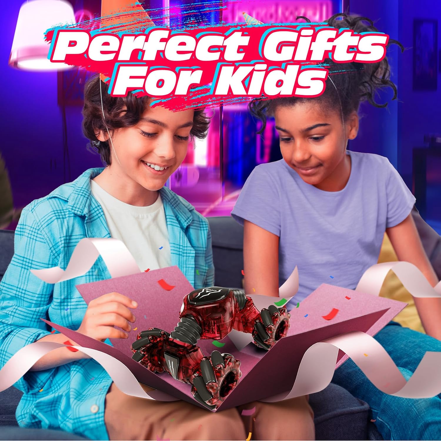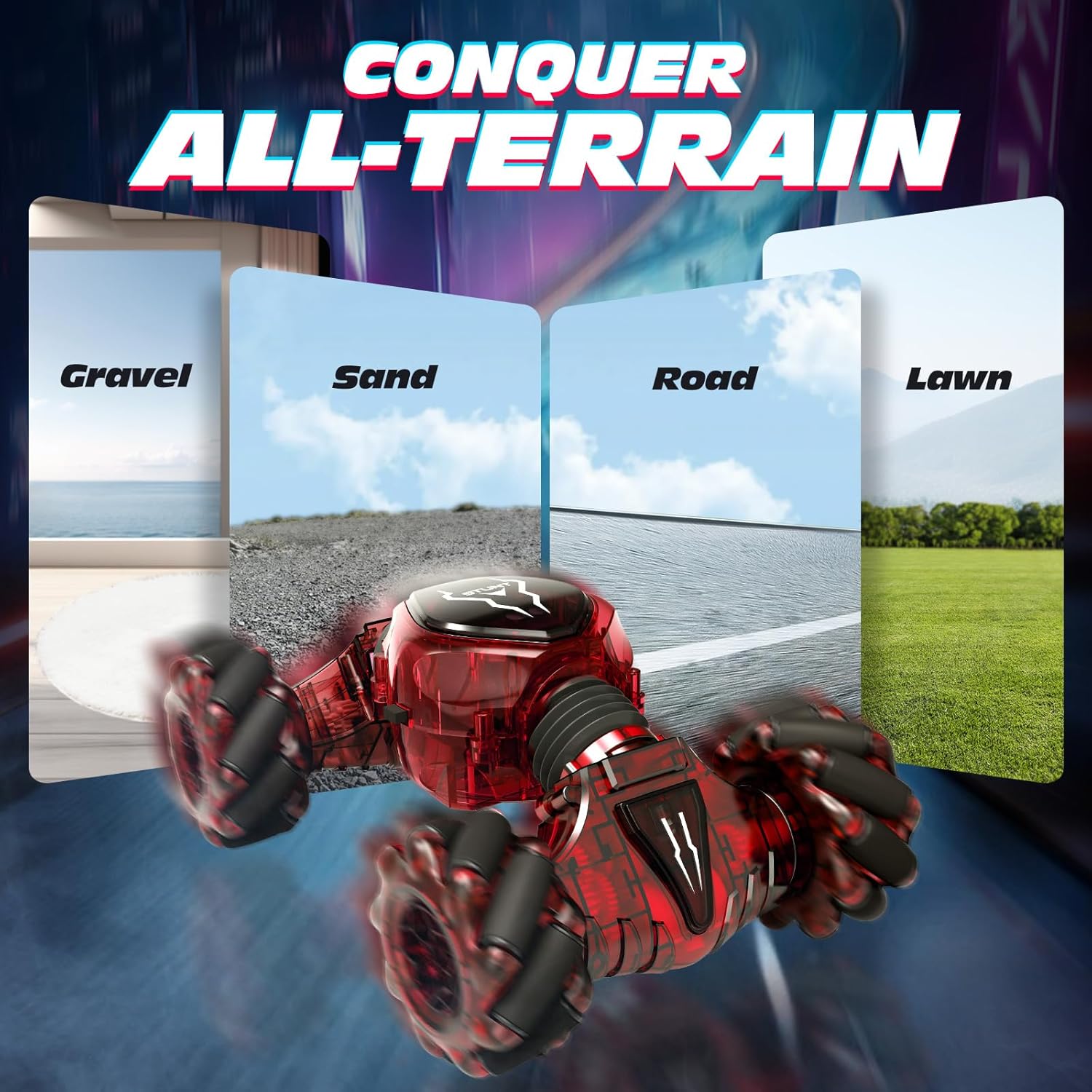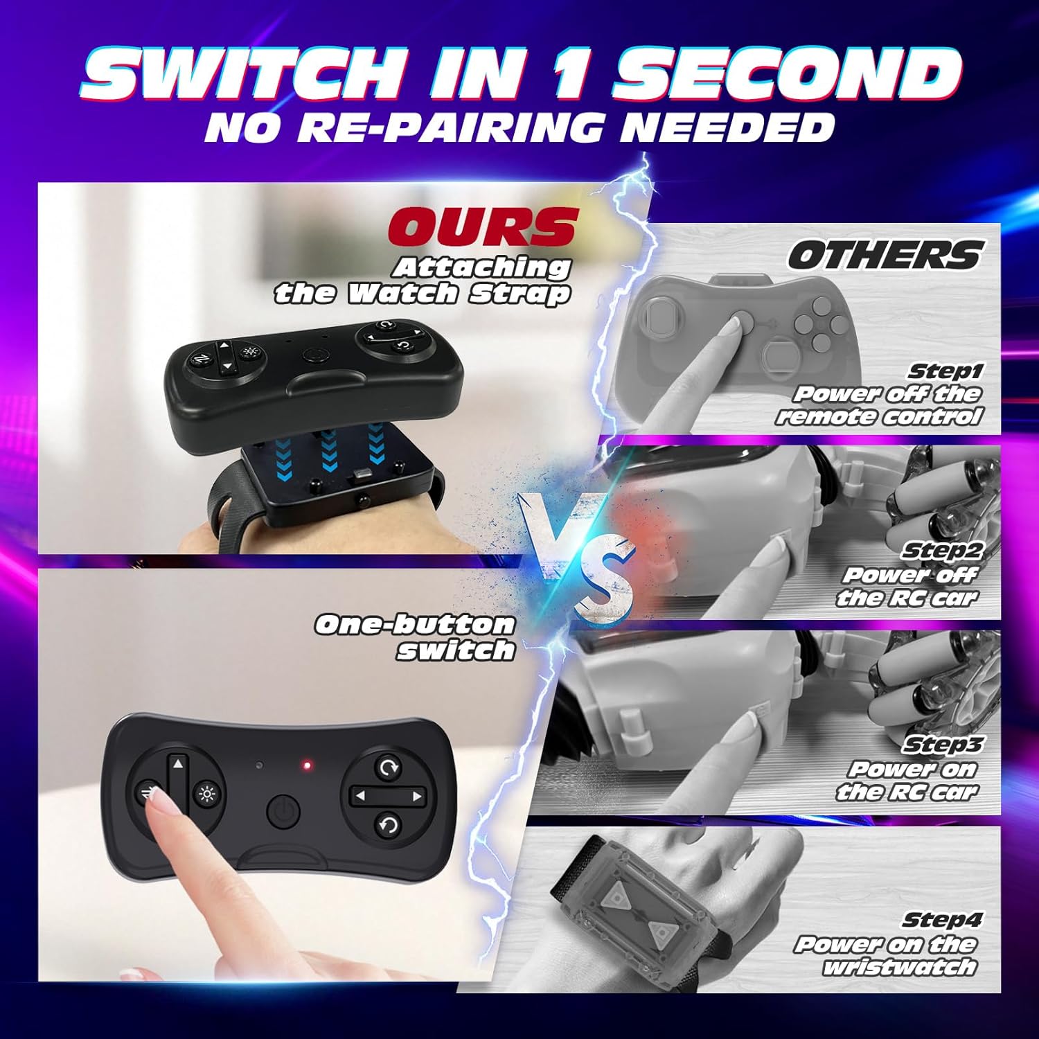 【 Anti collisione e anti caduta RC Car】 L'auto telecomandata non solo può muoversi in tutte le direzioni, ruotare su entrambi i lati, ma anche in tutte le direzioni, ruotare e deformare a 360°, passare liberamente tra modalità autostradale e fuoristrada. Utilizziamo appositamente materiali ABS per soddisfare tutte le superfici come sabbia, prati, terra, rocce, ecc. Sia all'interno che all'aperto, è il compagno divertente del vostro bambino. 【Facile controllo intelligente dei gesti】: l'auto controllata a mano è dotata di telecomando da 2,4 GHz e orologio gestuale. La tecnologia migliorata a 2,4 GHz è a prova di interferenza e stabile, allo stesso tempo supporta il gioco multiplayer. Indossando un orologio gesti, è possibile visualizzare facilmente l'auto RC per muoversi in qualsiasi direzione. Questa funzione aggiunge ulteriore divertimento all'esperienza di gioco e allo stesso tempo migliora in modo completo lo sviluppo coordinato del corpo del bambino. 【3 batterie per 45 minuti】: auto radiocomandata Tecnock viene fornita con 3 batterie ricaricabili da 500 mAh e un caricatore USB che può funzionare per 45 minuti su tre batterie. Estende il tempo di guida a oltre 45 minuti e rende il divertimento ininterrotto. La ricarica della batteria tramite USB è semplice e evita il fastidioso smontaggio della batteria. La funzione di protezione da sovraccarico integrata garantisce completamente la sicurezza della ricarica. Protezione per gli occhi e illuminazione fresca: le ruote della RC Stunt Cars possono emanare affascinanti effetti di luce, attirare l'attenzione dei bambini e offrire una meravigliosa esperienza visiva. Sia di giorno che di notte, queste affascinanti luci sono ben visibili. I bambini possono ora controllare le loro RC Cars e allo stesso tempo godere di affascinanti effetti di luce che offrono loro un'esperienza migliore. 【Il regalo perfetto per i bambini】: questo giocattolo per auto può offrire un divertimento senza fine. Ha sia un aspetto fresco che una ricca funzionalità. Adatto per ragazzi, ragazze e adulti di età compresa tra 4,5, 6, 7, 8, 9, 10, 11 e 12. È il regalo perfetto per auto giocattolo per compleanni, festa dei bambini, vacanze, Natale, Halloween e Capodanno, un regalo che ogni bambino vuole