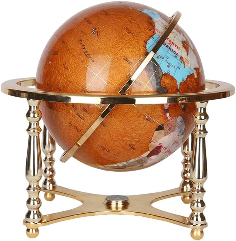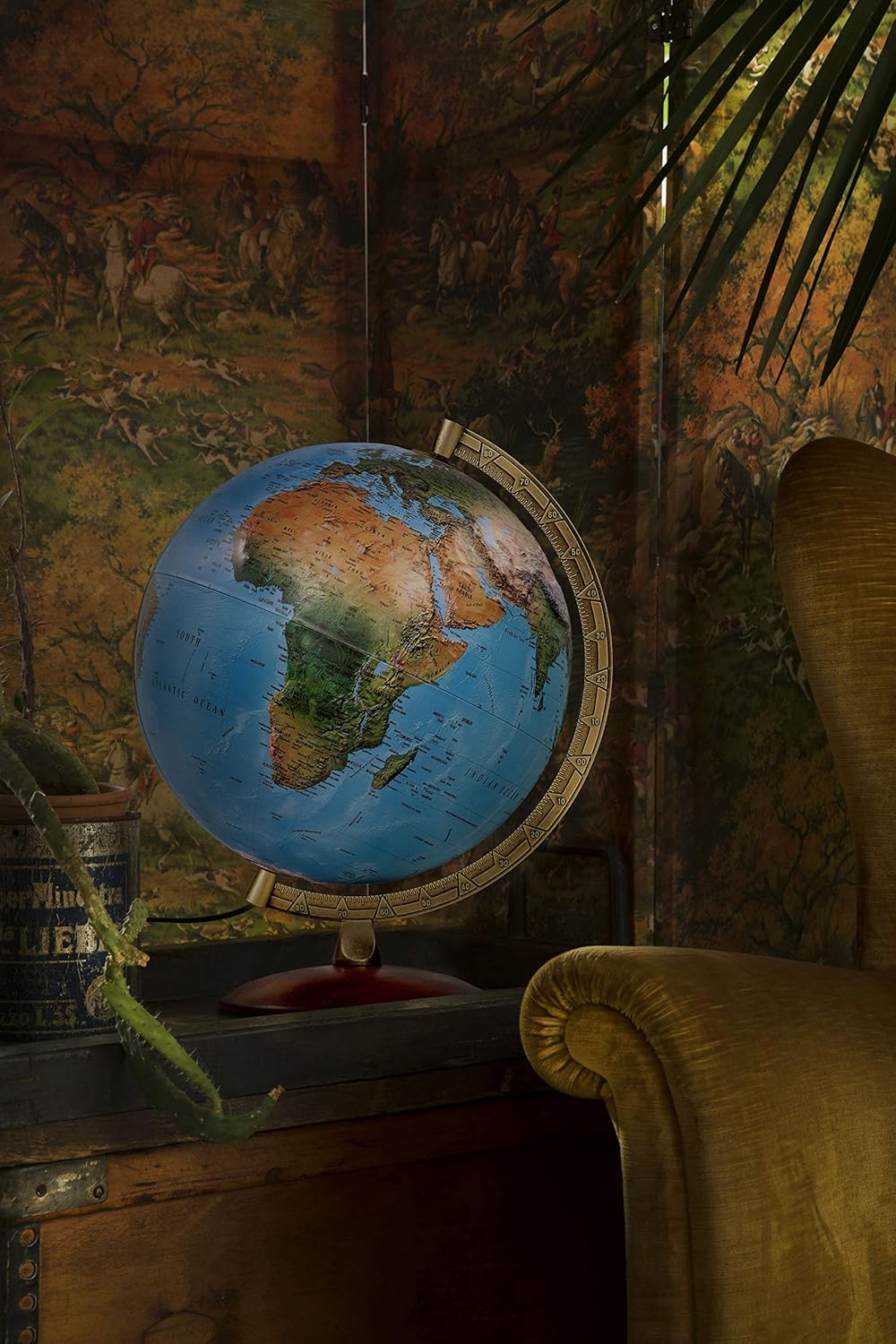 Diametro: 30 cm Altezza: 40 cm Base in legno, meridiano in metallo Spina europea 2 poli Luce: lampadina LED Mappamondo con testi in lingua Italiana