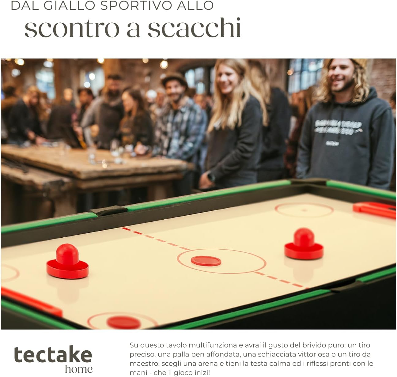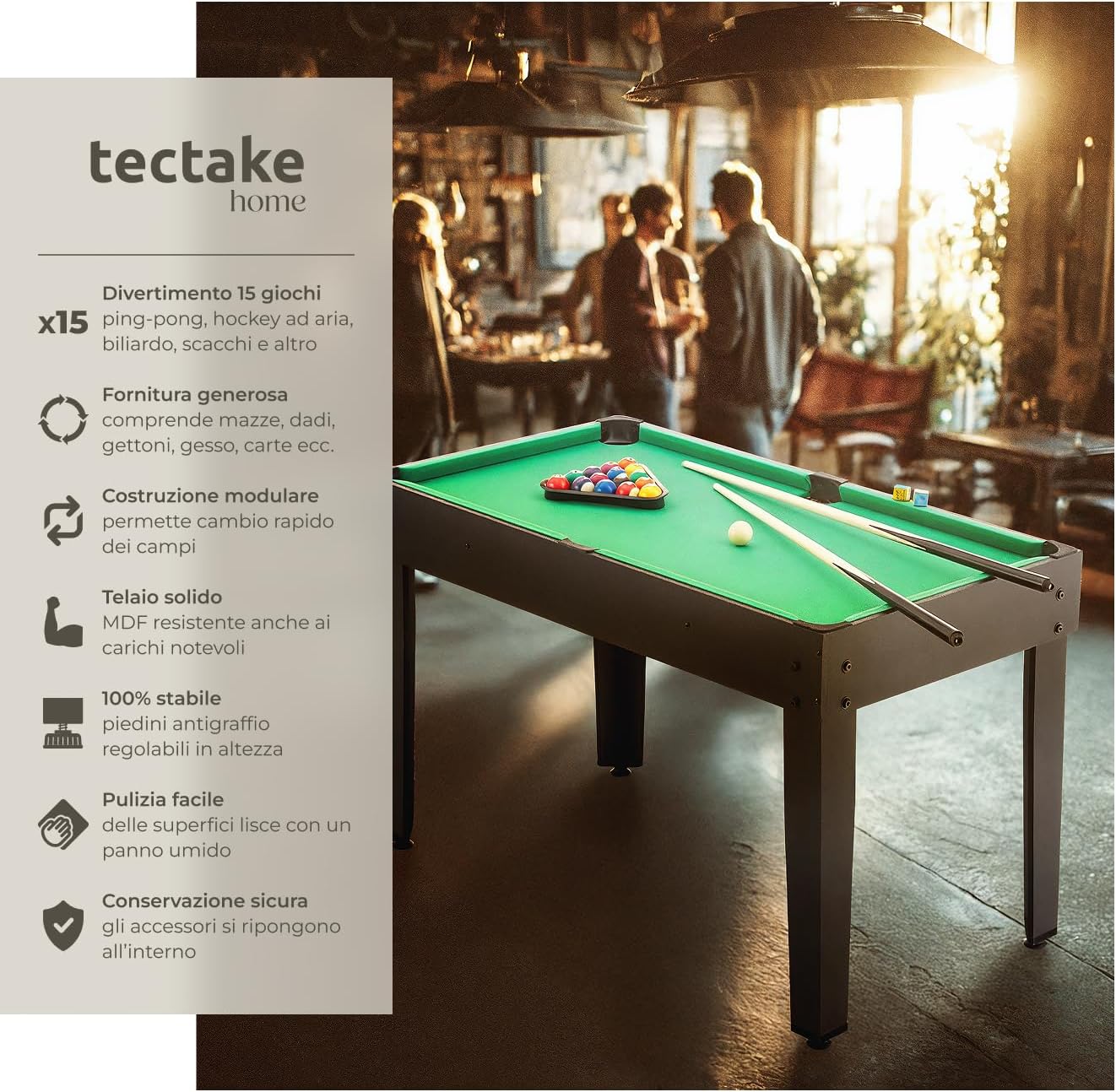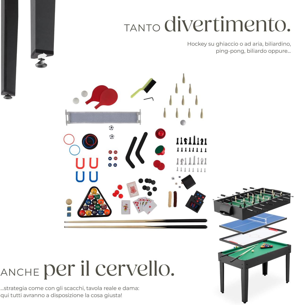 TAVOLO MULTIFUNZIONE 15 IN 1 – Il Tavolo da Gioco SirGameALot offre 15 giochi diversi, tra cui ventuno, gioco biliardo, bowling, dadi, lancio degli anelli, lancio dei ferri di cavallo, dama, scacchi, tavola reale, tavolo ping pong, hockey su ghiaccio, hockey da tavolo, biliardo, calcio balilla, biliardino e tris. Grazie alle 6 superfici d'azione indipendenti e impilabili, avrai ore di divertimento senza fine. STRUTTURA ROBUSTA E DURATURA – Realizzato in MDF di alta qualità, il tavolo è progettato per garantire resistenza e lunga durata. La struttura stabile e resistente assicura un'esperienza di gioco ottimale e sicura per tutta la famiglia. Le superfici sono per calcio balilla, tavolo da biliardo, tavolo ping pong, hockey da tavolo. FACILE DA PULIRE E MANUTENERE – Il tavolo biliardo trasformabile è facile da pulire grazie alla sua superficie liscia e resistente. Basta un panno per mantenere il tavolo in perfette condizioni dopo ogni partita, assicurando una lunga durata nel tempo. PIEDINI REGOLABILI IN ALTEZZA – Grazie ai piedini in plastica regolabili, il gioco da tavola offre una stabilità al 100%, indipendentemente dal pavimento su cui viene posizionato. Potrai adattarlo perfettamente alla tua altezza e spazio. ACCESSORI COMPLETI INCLUSI – Il set include tutti gli accessori necessari per giocare a ciascun dei 15 giochi: palle da biliardo, stecca da biliardo, palline da ping pong, rete ping pong, racchette, palloni da calcetto balilla, palline calcio balilla, anelli e altro ancora, per garantire un'esperienza di gioco completa.