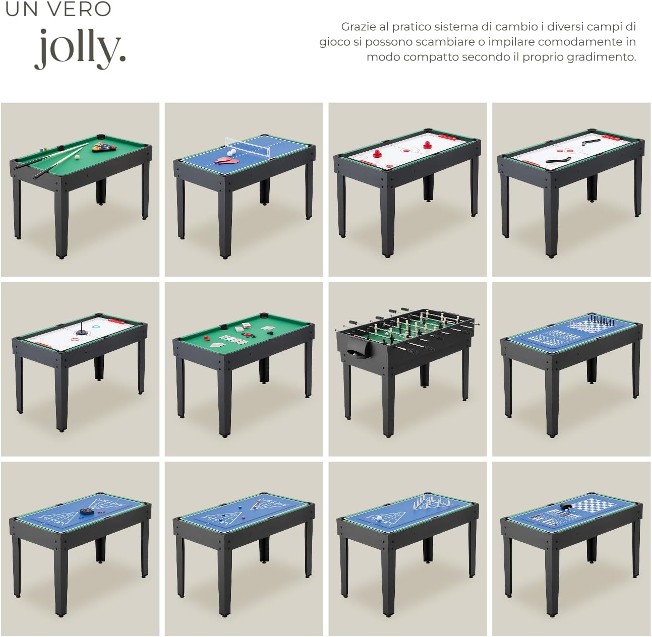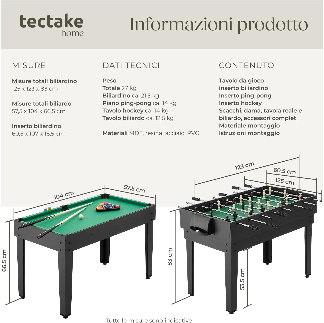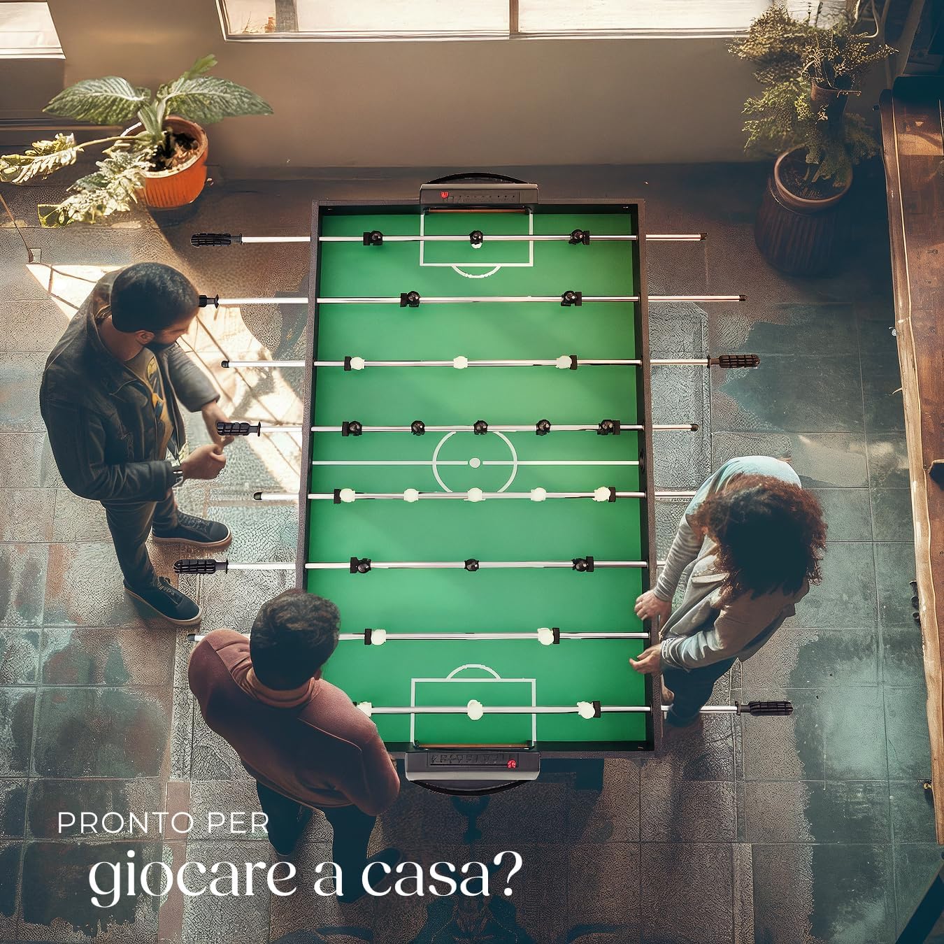 TAVOLO MULTIFUNZIONE 15 IN 1 – Il Tavolo da Gioco SirGameALot offre 15 giochi diversi, tra cui ventuno, gioco biliardo, bowling, dadi, lancio degli anelli, lancio dei ferri di cavallo, dama, scacchi, tavola reale, tavolo ping pong, hockey su ghiaccio, hockey da tavolo, biliardo, calcio balilla, biliardino e tris. Grazie alle 6 superfici d'azione indipendenti e impilabili, avrai ore di divertimento senza fine. STRUTTURA ROBUSTA E DURATURA – Realizzato in MDF di alta qualità, il tavolo è progettato per garantire resistenza e lunga durata. La struttura stabile e resistente assicura un'esperienza di gioco ottimale e sicura per tutta la famiglia. Le superfici sono per calcio balilla, tavolo da biliardo, tavolo ping pong, hockey da tavolo. FACILE DA PULIRE E MANUTENERE – Il tavolo biliardo trasformabile è facile da pulire grazie alla sua superficie liscia e resistente. Basta un panno per mantenere il tavolo in perfette condizioni dopo ogni partita, assicurando una lunga durata nel tempo. PIEDINI REGOLABILI IN ALTEZZA – Grazie ai piedini in plastica regolabili, il gioco da tavola offre una stabilità al 100%, indipendentemente dal pavimento su cui viene posizionato. Potrai adattarlo perfettamente alla tua altezza e spazio. ACCESSORI COMPLETI INCLUSI – Il set include tutti gli accessori necessari per giocare a ciascun dei 15 giochi: palle da biliardo, stecca da biliardo, palline da ping pong, rete ping pong, racchette, palloni da calcetto balilla, palline calcio balilla, anelli e altro ancora, per garantire un'esperienza di gioco completa.