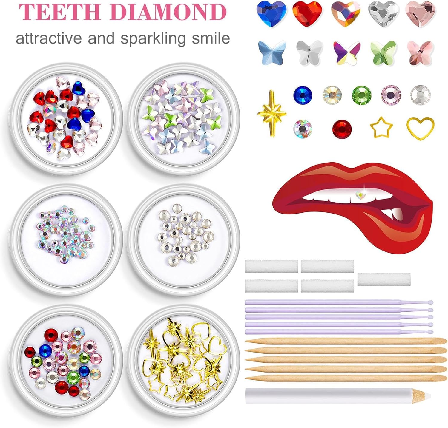 Add to Any Look Instantly: This teeth gems kit includes shimmering crystals that elevate your smile for parties cosplay prom or themed events providing a touch in seconds Easy Application with Adhesive Tools Included: Comes complete with applicator and adhesive tools making it simple to apply crystals to your teeth at home without professional help or experience Safe and Gentle for Temporary Wear: Crafted from materials that are lightweight and gentle on teeth allowing you to enjoy your radiant look comfortably for hours during special occasions Perfect for Photoshoots and Performances: Whether it’s a concert wedding or festival these gems catch light beautifully enhancing your smile and overall aesthetic in photos and live appearances Ideal for Creative Self-Expression and Style: Great for those who love to stand out this kit allows you to personalize your look with sparkling details that suit your vibe from bold to subtle shine
