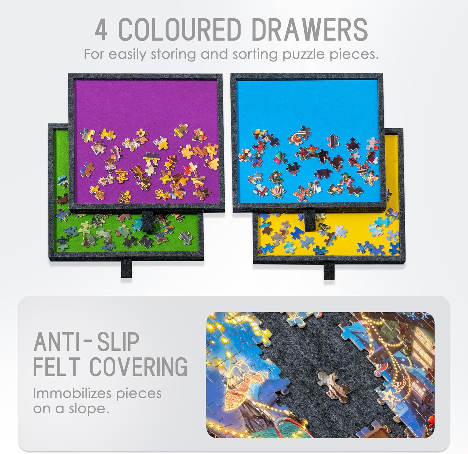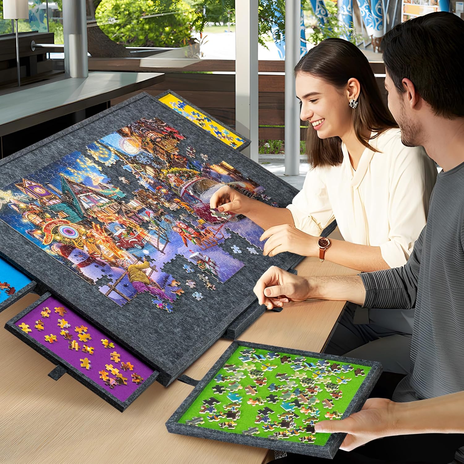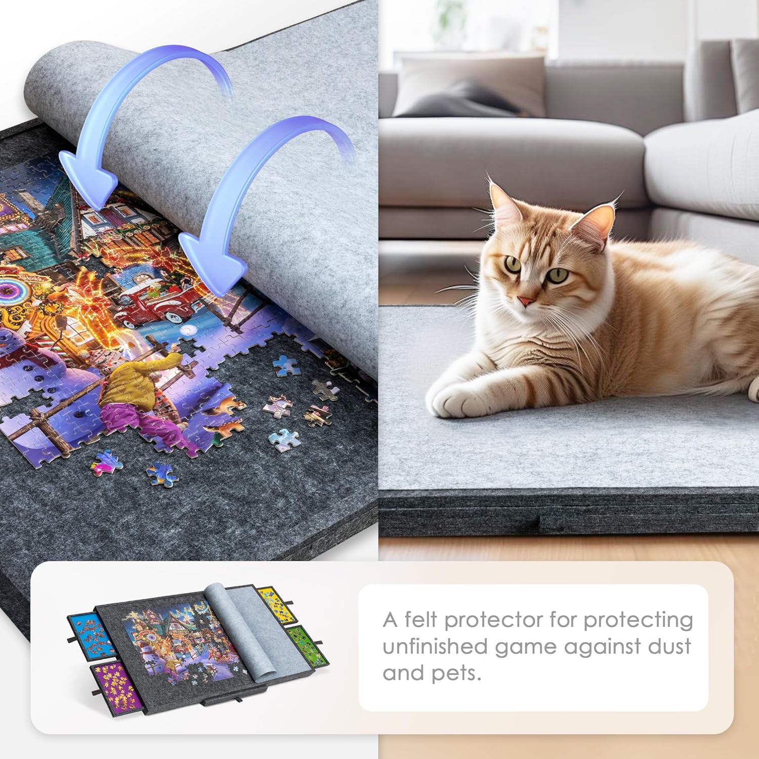 Leggero e portatile: la tavola puzzle Tektalk 1.500 pezzi è lavorata in tessuto di feltro di alta qualità. La superficie dà una buona consistenza per garantire una buona sensazione e immobilizza i pezzi del puzzle. La protezione in feltro è super leggera e pesa solo 2,7 kg, 35% ~ 50% più leggera rispetto alle tradizionali tavole puzzle in legno. Ti permette di spostare il tuo gioco incompiuto e continuare il tuo divertimento puzzle ovunque tu voglia. Design 2 in 1: progettato con un supporto regolabile indipendente. Basta installarlo per supportare la tavola del puzzle e conservarlo all'interno della tavola del puzzle come un cassetto quando non in uso. Le facili regolazioni ti assicurano un divertimento infinito contribuendo a evitare torcicollo o stress sulla schiena. Copertura in feltro – Racchiusa con una protezione in feltro per proteggere il tuo gioco di puzzle incompiuto contro la polvere e impedire agli animali domestici cattivi di scherzare con esso mentre ti stai riposando. 4 cassetti colorati: progettati con 4 cassetti colorati per ordinare i pezzi del puzzle e per preservare il tuo gioco di puzzle incompiuto. Ogni cassetto è progettato con una maniglia per una facile estrazione. Rimani chiuso anche quando non in uso e non ti preoccupi di perdere pezzi. Scelta regalo ideale: la tavola puzzle in feltro Tektalk presenta una tavola puzzle in feltro combinata e un supporto regolabile, leggera e resistente. Misura solo 35,4 × 62 cm e si adatta alla maggior parte dei giochi di puzzle da 1.500 pezzi. È un regalo perfetto per gli amanti dei puzzle di tutte le età per compleanni, anniversari, Natale o altri giorni speciali.
