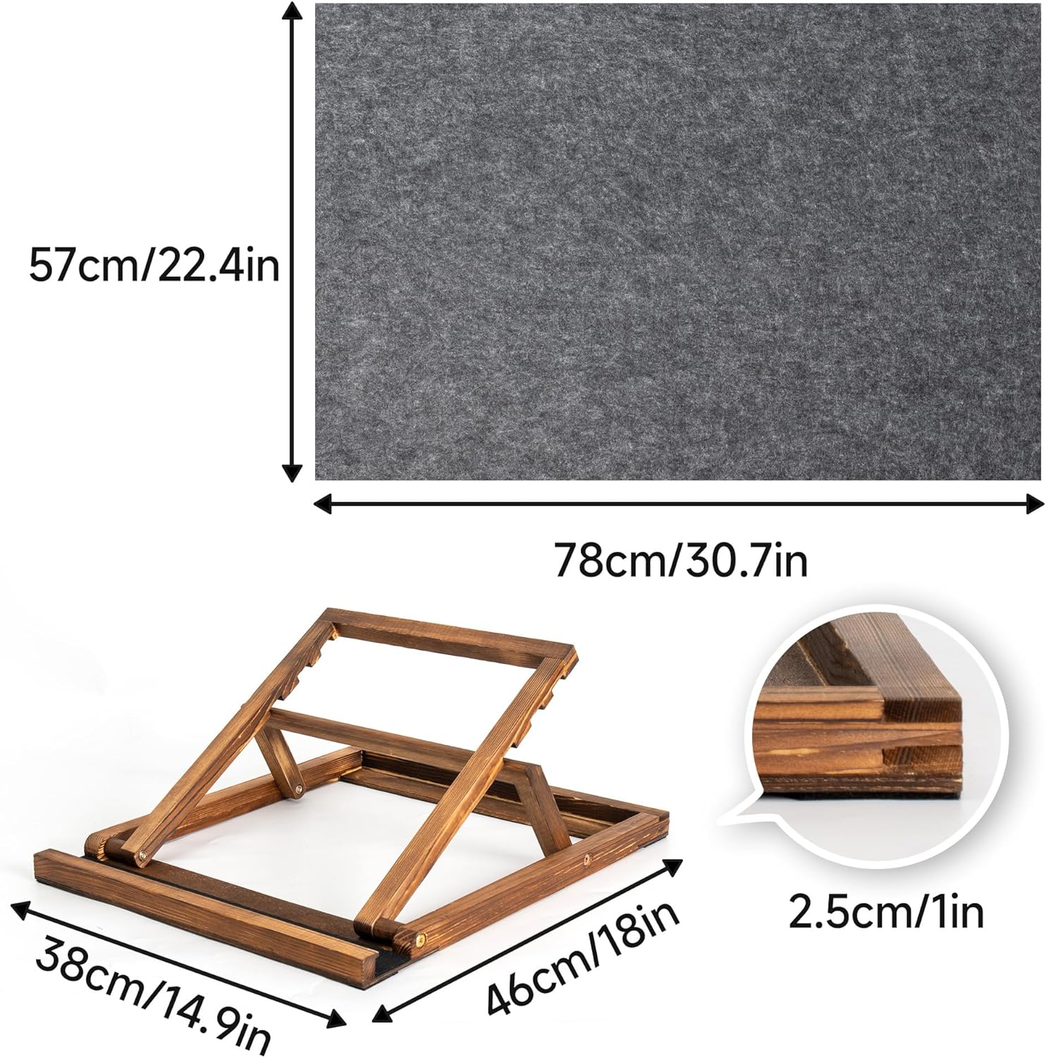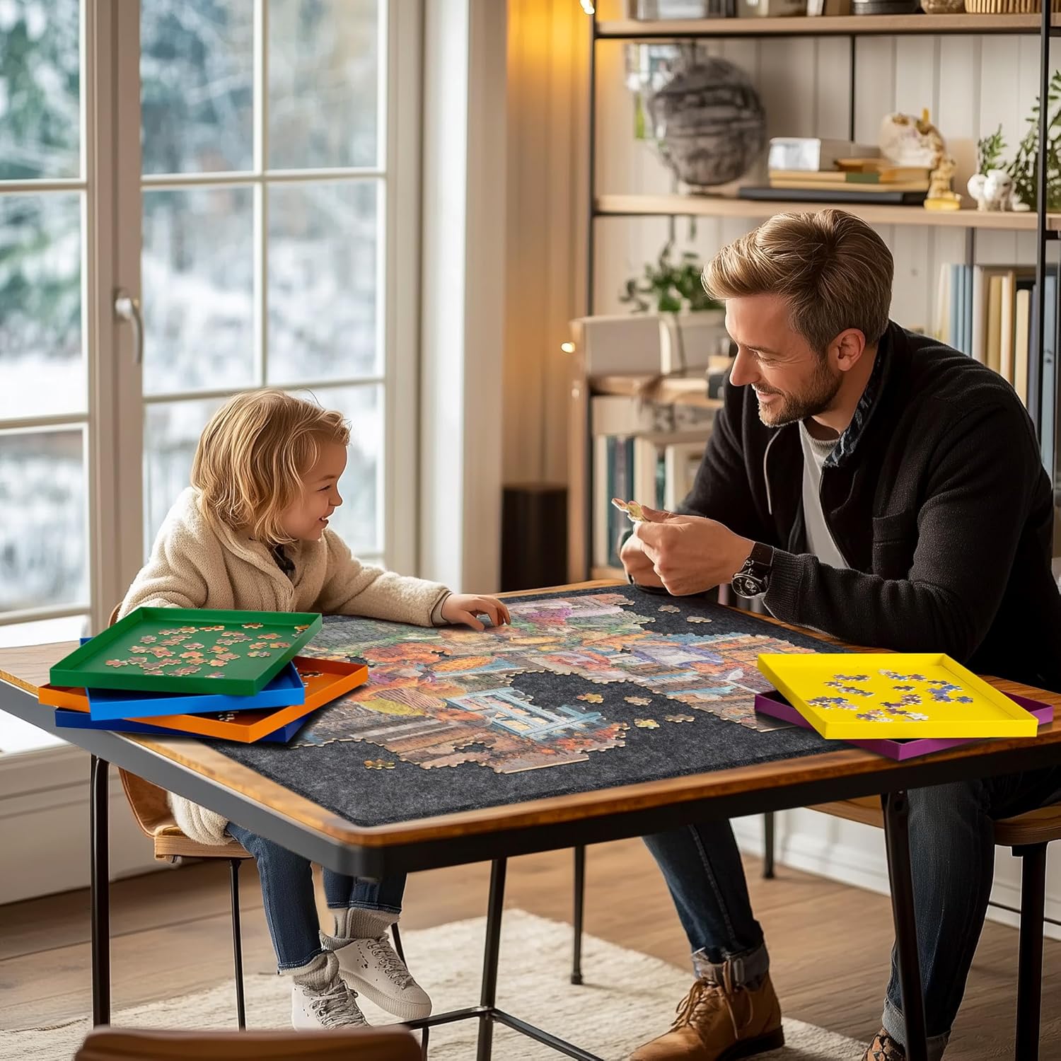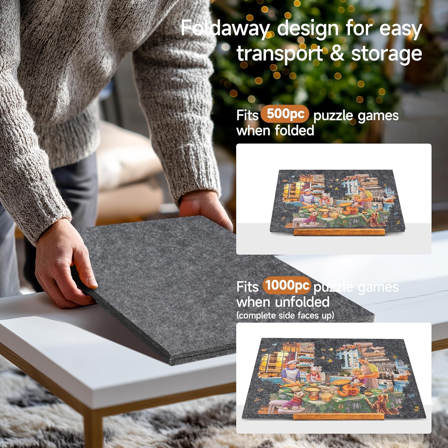 Una combinazione di puzzle board e supporto: la confezione include 1 tavola puzzle pieghevole e 1 supporto regolabile. La tavola del puzzle misura 78 × 57 cm, adatta alla maggior parte dei giochi di puzzle da 1 000 pezzi e offre una buona assistenza agli amanti dei puzzle. Design pieghevole: la nostra tavola puzzle presenta una funzione pieghevole che la rende facile da riporre e trasportare. Adatto a giochi di puzzle da 500 pezzi quando piegato e si adatta a giochi da 1 000 pezzi quando aperto (si prega di aprire e utilizzare il lato completo quando si gioca a 1 000 giochi per pc). Tre regolazioni angolari: il supporto in legno presenta 3 regolazioni dell'angolo per lavorare in più occasioni. Allevia efficacemente l'affaticamento del collo e la pressione sulla colonna vertebrale, permettendoti di giocare e apprezzare il tuo gioco di puzzle in una posizione comoda. Questo supporto regolabile è compatibile con altre tavole puzzle. Oltre alla tavola puzzle nella confezione, si adatta anche ad altre tavole puzzle di diverse dimensioni. Materiale di alta qualità: realizzato in tessuto di feltro indurito e ispessito, impedendo ai pezzi del puzzle di scivolare anche quando si inclina a una piccola angolazione. Il supporto in legno di pino offre ulteriore supporto e garantisce stabilità e durata. Inoltre, un tappetino in feltro antiscivolo per protezione contro graffi e stabilità. Facile da riporre e trasportare: puoi giocare a giochi di puzzle con la tavola puzzle su qualsiasi superficie, piano di lavoro, tavolino, coperta da spiaggia o anche sul pavimento o sul letto Se vuoi salvare il puzzle, basta ritrarre il supporto e posizionarlo sotto il divano o il letto per risparmiare spazio.