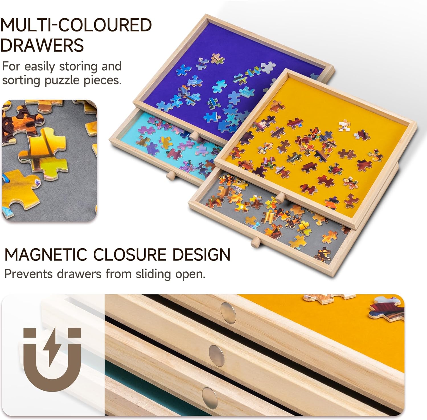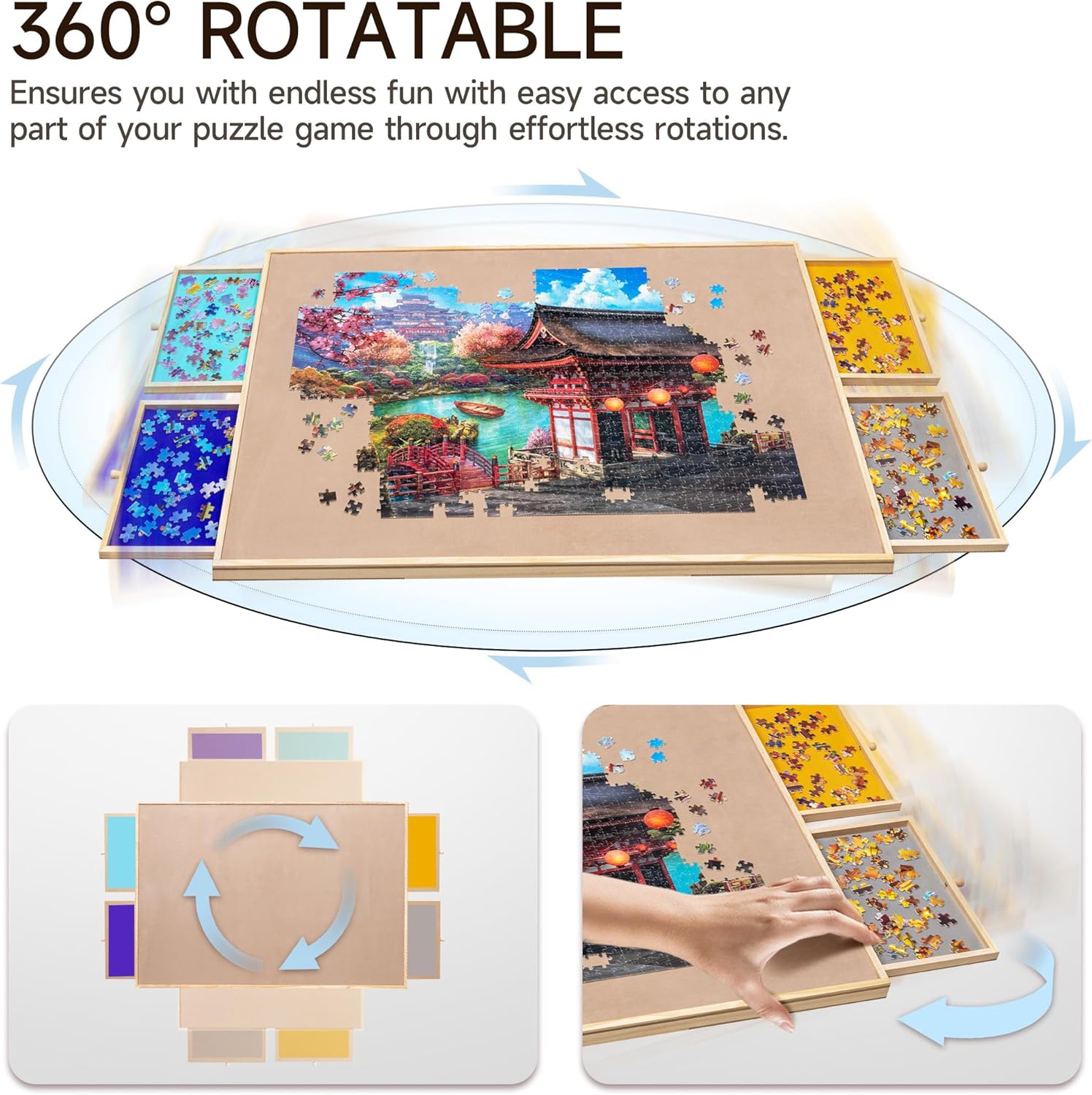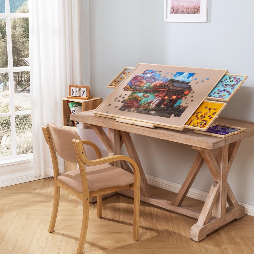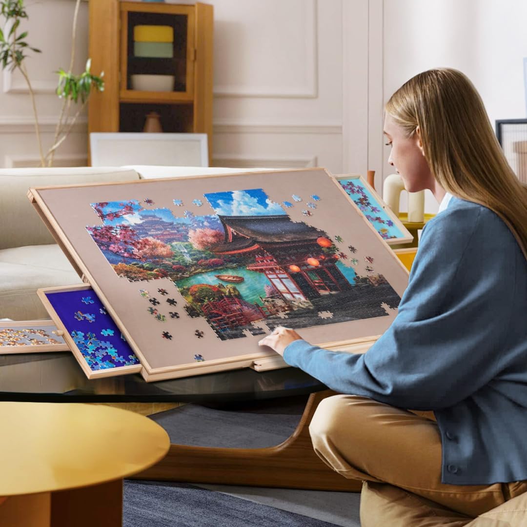 Una combinazione di tavolo puzzle e supporto: il nostro tavolo puzzle è progettato con un supporto che aiuta a impostare il piano del tavolo a 3 angoli di inclinazione (angolo massimo 30 °). È possibile effettuare regolazioni in base alle proprie preferenze e comfort per evitare rigidità al collo e pressione nella schiena. Design rotante a 360°: la nostra tavola puzzle è progettata con un giradischi per garantire una rotazione regolare a 360° e per garantire un facile accesso a qualsiasi angolo del gioco di puzzle. Un'alta efficienza di gioco ti promette un sacco di divertimento puzzle. Protezione in PP: una pellicola protettiva trasparente in PP è inclusa per offrire una migliore protezione al tuo gioco di puzzle incompiuto contro polvere, acqua e animali domestici cattivi. Cassetti in vari colori: progettati con 4 cassetti in diversi colori sia per ordinare pezzi di puzzle che per riporre quelli inutilizzati. Ogni cassetto è dotato di un magnete integrato per tenerli chiusi durante la conservazione ed evitare di perdere pezzi. Materiale di alta qualità e portabilità: costruito con legno di pino e MDF e con un'area utilizzabile di 35,43 × 62 cm, questo tavolo puzzle si adatta alla maggior parte dei giochi di puzzle fino a 1.000 pezzi. La superficie è rivestita in pelle scamosciata per garantire un attrito sufficiente e impedire efficacemente ai pezzi del puzzle di scivolare e cadere. Quando hai bisogno di sedili extra o spazio sul tavolo, basta coprire il tuo gioco incompiuto con la protezione del foglio inclusa, chiudere i cassetti e mettere l'intera tavola del puzzle sotto il divano o il letto per sicurezza.