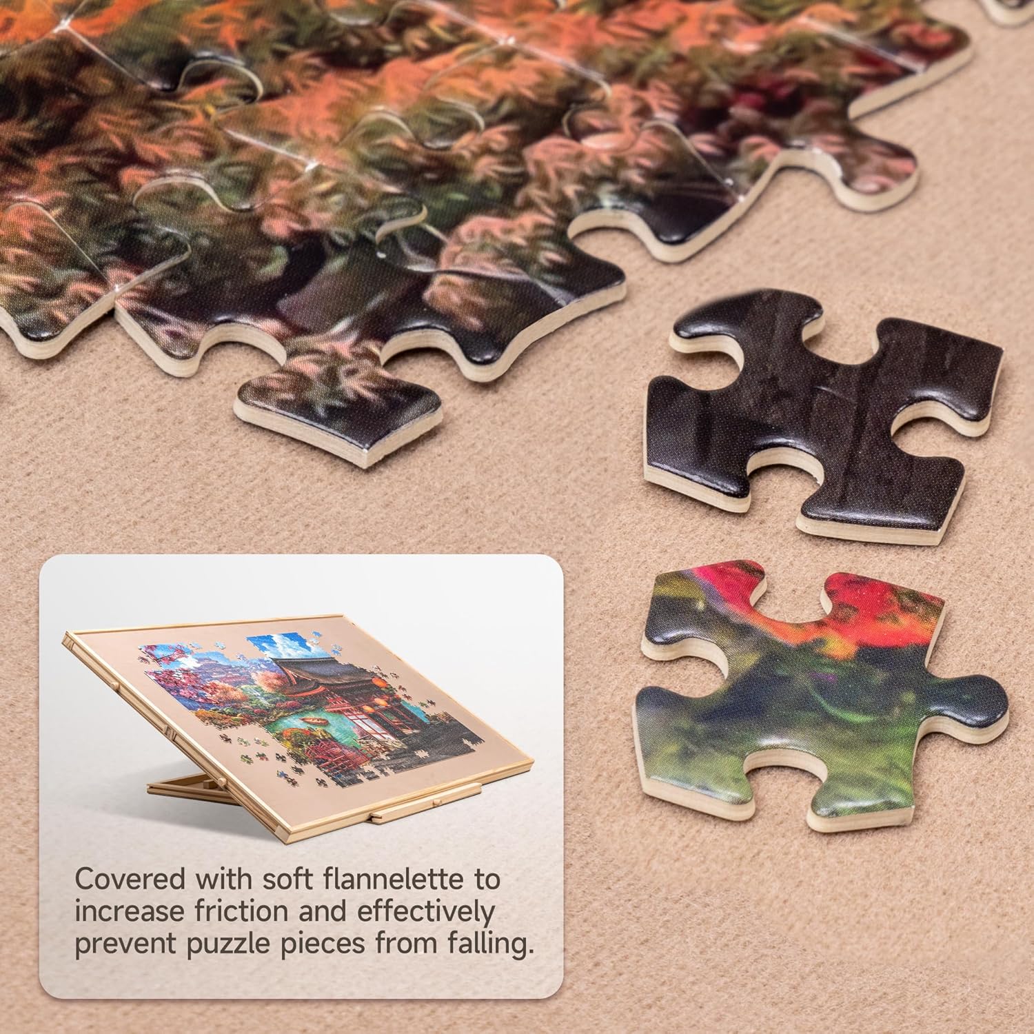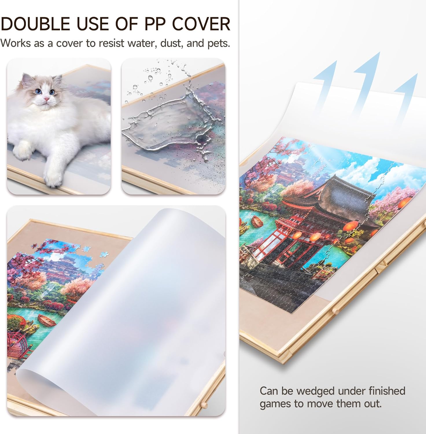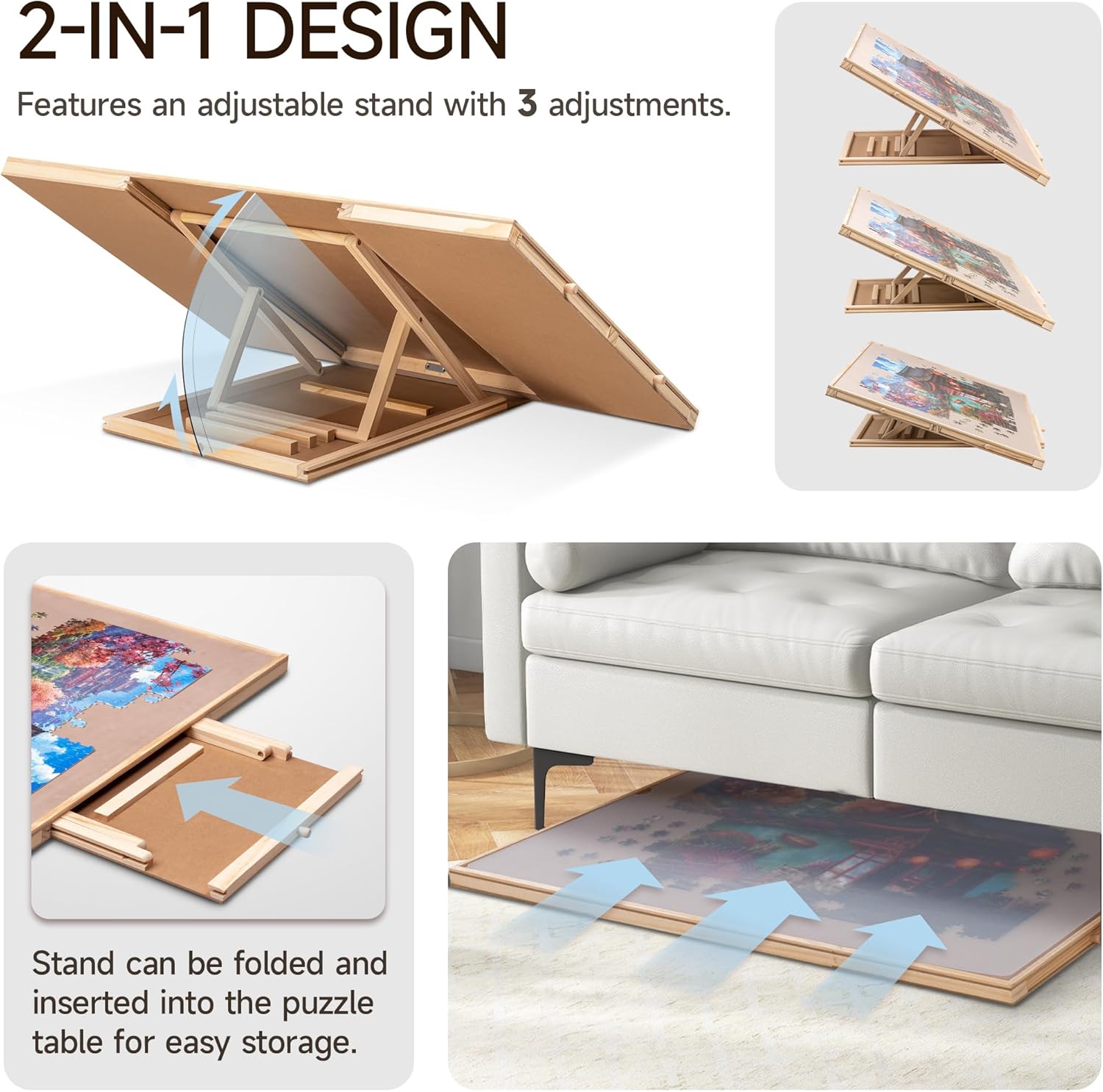 Una combinazione di tavolo puzzle e supporto: il nostro tavolo puzzle è progettato con un supporto che aiuta a impostare il piano del tavolo a 3 angoli di inclinazione (angolo massimo 30 °). È possibile effettuare regolazioni in base alle proprie preferenze e comfort per evitare rigidità al collo e pressione nella schiena. Design rotante a 360°: la nostra tavola puzzle è progettata con un giradischi per garantire una rotazione regolare a 360° e per garantire un facile accesso a qualsiasi angolo del gioco di puzzle. Un'alta efficienza di gioco ti promette un sacco di divertimento puzzle. Protezione in PP: una pellicola protettiva trasparente in PP è inclusa per offrire una migliore protezione al tuo gioco di puzzle incompiuto contro polvere, acqua e animali domestici cattivi. Cassetti in vari colori: progettati con 4 cassetti in diversi colori sia per ordinare pezzi di puzzle che per riporre quelli inutilizzati. Ogni cassetto è dotato di un magnete integrato per tenerli chiusi durante la conservazione ed evitare di perdere pezzi. Materiale di alta qualità e portabilità: costruito con legno di pino e MDF e con un'area utilizzabile di 35,43 × 62 cm, questo tavolo puzzle si adatta alla maggior parte dei giochi di puzzle fino a 1.000 pezzi. La superficie è rivestita in pelle scamosciata per garantire un attrito sufficiente e impedire efficacemente ai pezzi del puzzle di scivolare e cadere. Quando hai bisogno di sedili extra o spazio sul tavolo, basta coprire il tuo gioco incompiuto con la protezione del foglio inclusa, chiudere i cassetti e mettere l'intera tavola del puzzle sotto il divano o il letto per sicurezza.