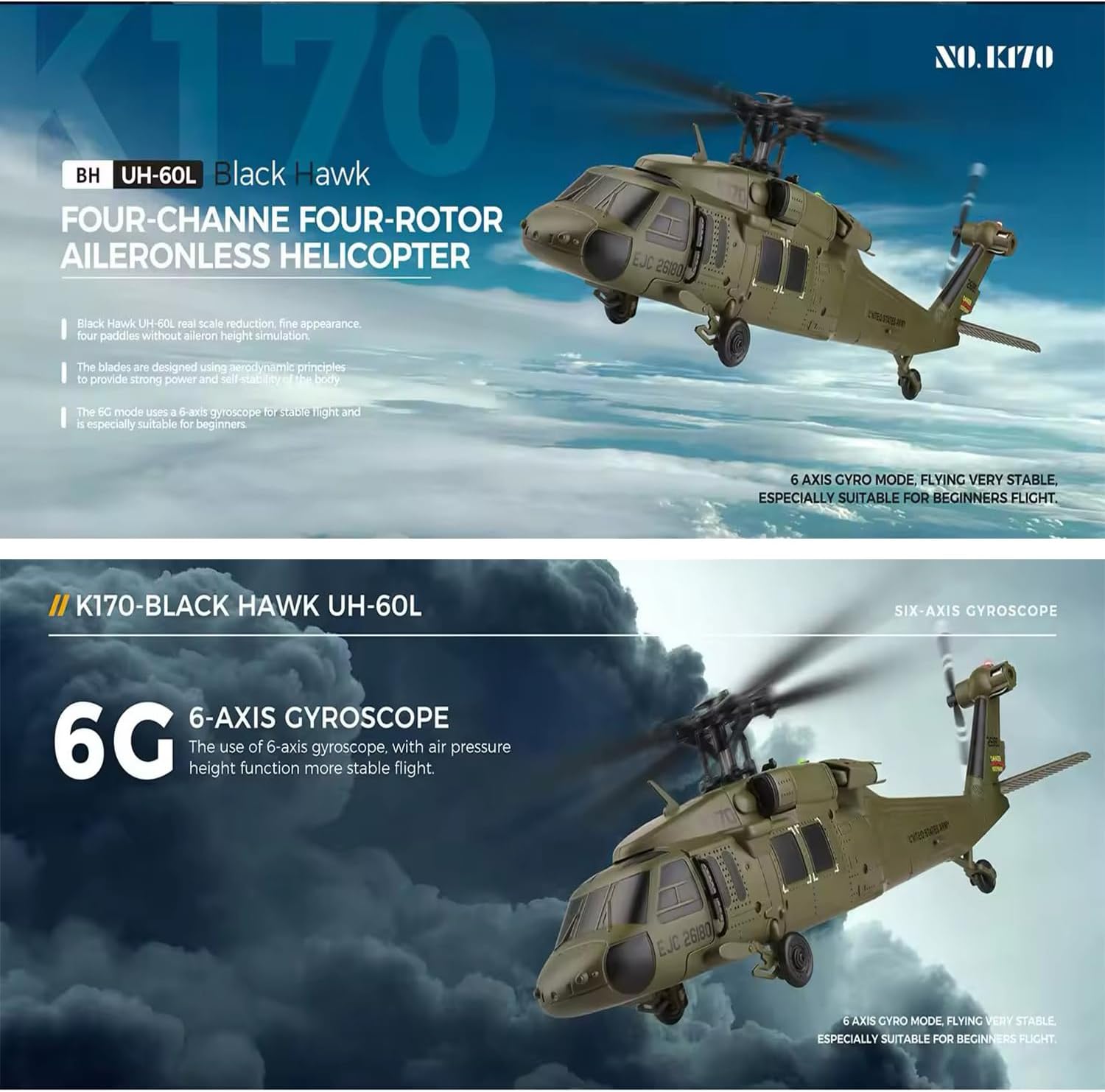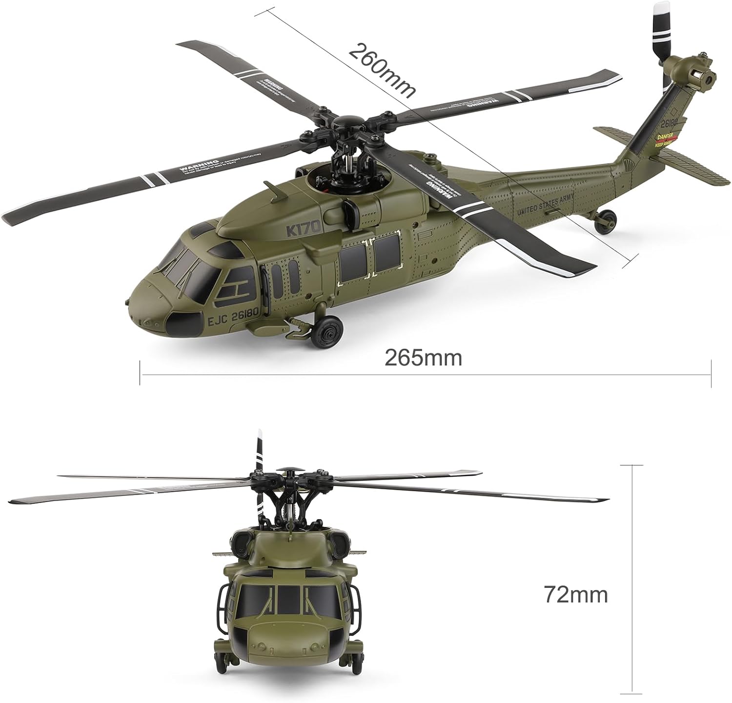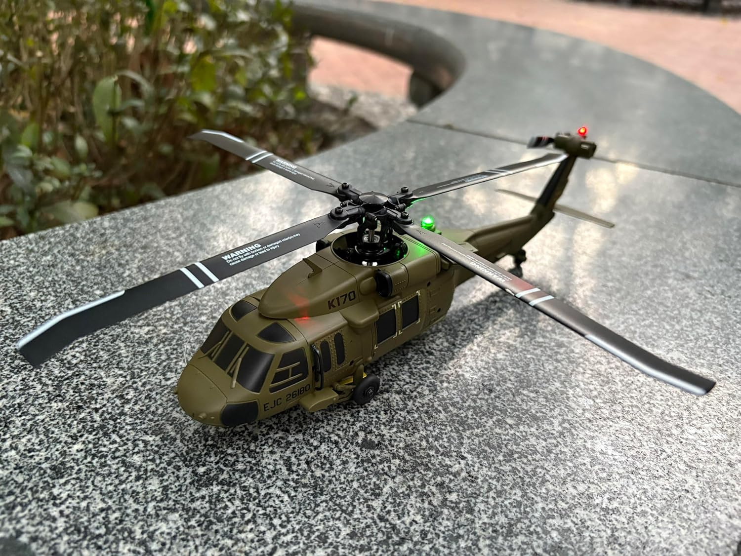 Elicottero telecomandato K170 versione doppia batteria versione standard. Dimensioni K170: diametro rotore 260mm, lunghezza fusoliera 265m, altezza 72mm. Funzione: design semplice a 4 canali, utilizzando giroscopio a 6 assi, con funzione ad alta pressione per un volo più stabile; Funzioni di controllo remoto come un decollo chiave, un atterraggio chiave, salita e discesa, avanti e indietro, sterzo a sinistra e destra, volo laterale sinistro e destro; rendere il prodotto più facile da usare e più adatto per i principianti. Tecnica stabile in bilico, adatta per principianti, intermedi ed esperti. La modalità 6G utilizza un giroscopio a 6 assi per un volo stabile, rendendolo particolarmente adatto per i principianti a volare. La durata della batteria di K170 può raggiungere circa 8 minuti Il velivolo ha aggiunto una funzione di prevenzione della perdita di segnale e degli incidenti: se la distanza del segnale del telecomando all'interno o all'esterno è anormale e non può essere controllata, l'aereo manterrà la sua altitudine attuale per 2 secondi e poi atterrerà lentamente. La portata controllabile del telecomando deve essere riavviata in modo tempestivo prima che l'aeromobile atterri, quindi la leva dell'acceleratore può essere spinta su e giù per connettersi all'aeromobile per un ulteriore controllo Sono forniti cuscinetti aggiuntivi per sollevamento elicottero, adatti per sollevamento interni ed esterni. Allo stesso tempo, è dotato di un espositore per elicottero, che può essere un bellissimo ornamento modello di elicottero militare quando l'elicottero non è in uso.