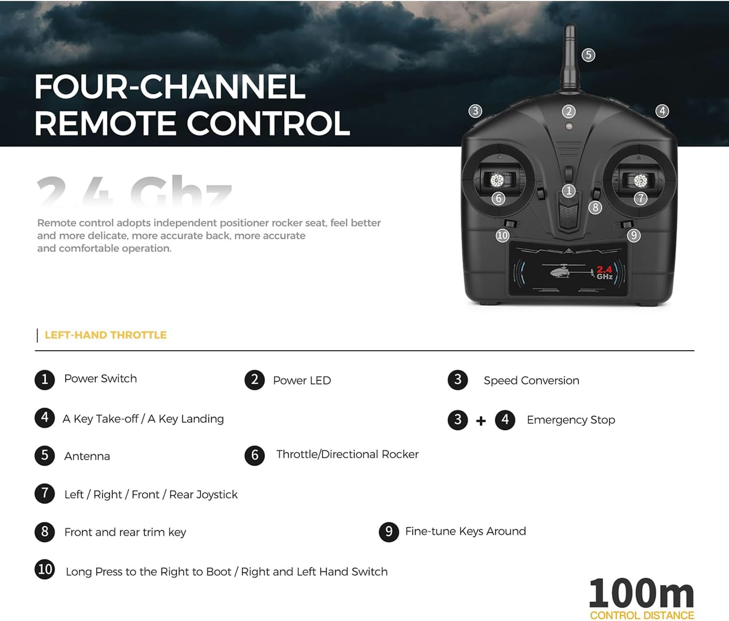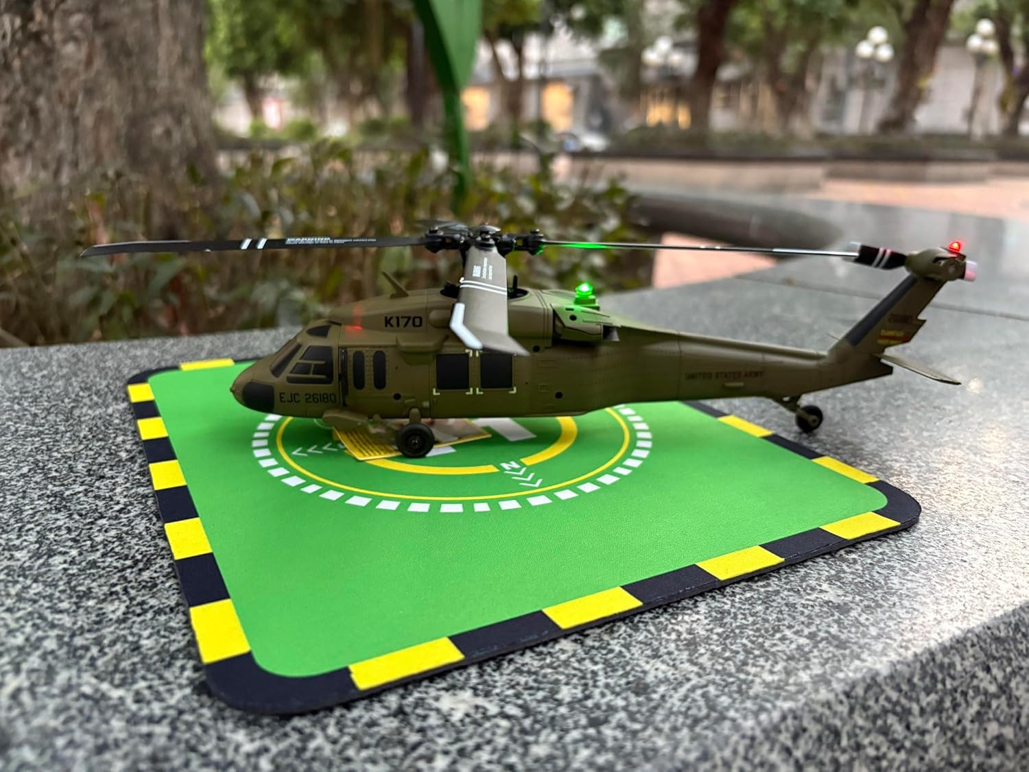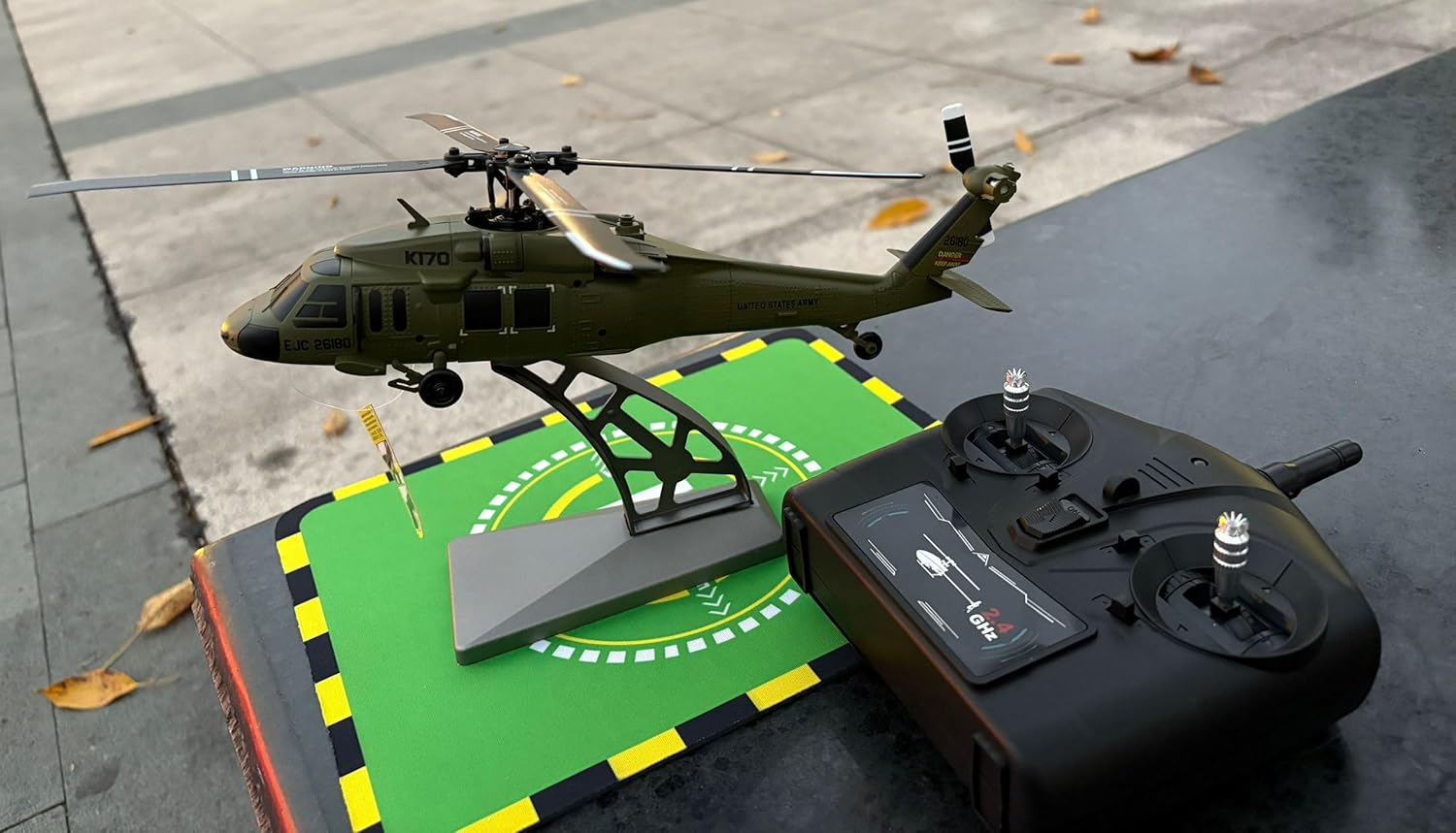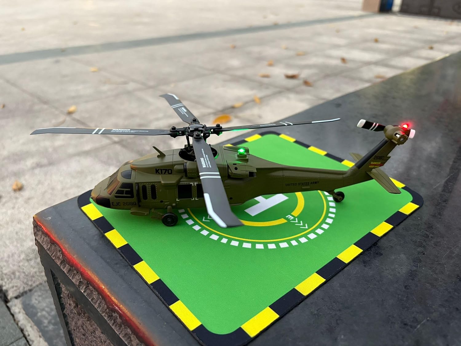 Elicottero telecomandato K170 versione doppia batteria versione standard. Dimensioni K170: diametro rotore 260mm, lunghezza fusoliera 265m, altezza 72mm. Funzione: design semplice a 4 canali, utilizzando giroscopio a 6 assi, con funzione ad alta pressione per un volo più stabile; Funzioni di controllo remoto come un decollo chiave, un atterraggio chiave, salita e discesa, avanti e indietro, sterzo a sinistra e destra, volo laterale sinistro e destro; rendere il prodotto più facile da usare e più adatto per i principianti. Tecnica stabile in bilico, adatta per principianti, intermedi ed esperti. La modalità 6G utilizza un giroscopio a 6 assi per un volo stabile, rendendolo particolarmente adatto per i principianti a volare. La durata della batteria di K170 può raggiungere circa 8 minuti Il velivolo ha aggiunto una funzione di prevenzione della perdita di segnale e degli incidenti: se la distanza del segnale del telecomando all'interno o all'esterno è anormale e non può essere controllata, l'aereo manterrà la sua altitudine attuale per 2 secondi e poi atterrerà lentamente. La portata controllabile del telecomando deve essere riavviata in modo tempestivo prima che l'aeromobile atterri, quindi la leva dell'acceleratore può essere spinta su e giù per connettersi all'aeromobile per un ulteriore controllo Sono forniti cuscinetti aggiuntivi per sollevamento elicottero, adatti per sollevamento interni ed esterni. Allo stesso tempo, è dotato di un espositore per elicottero, che può essere un bellissimo ornamento modello di elicottero militare quando l'elicottero non è in uso.