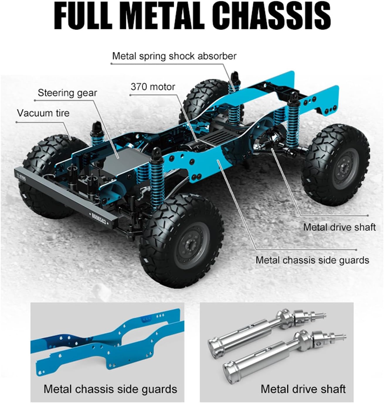Telaio a scala in lega con piastre di protezione laterali del telaio in metallo, dissipatori di calore e cuscinetti interamente in metallo. 4WD con sospensioni indipendenti, ammortizzatori in lega e pneumatici in gomma resistente all'usura simulati per arrampicata e guida fuoristrada. Le luci di direzione a LED anteriori e posteriori si sincronizzano con il telecomando dello sterzo, oltre a lampeggiatori Il telecomando a 2,4 GHz offre un segnale forte fino a 100 m, consentendo corse multigiocatore senza interferenze.