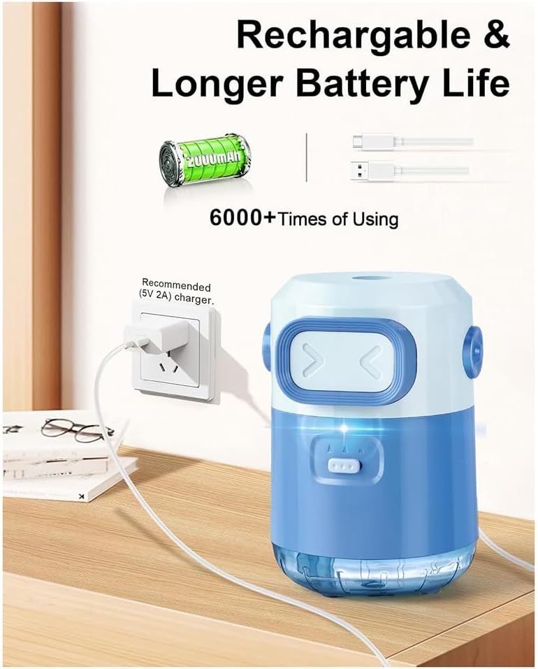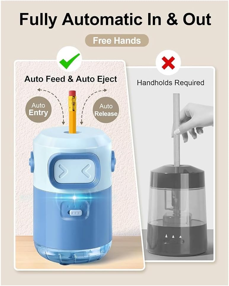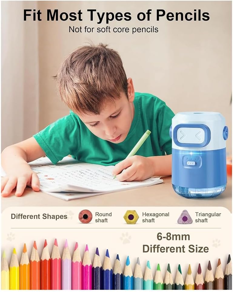 [Adatto a matite di dimensioni e forme] Questo temperamatite elettrico di grande diametro per casa/scuola funziona con il 99% delle matite (6-8 mm), maneggiando facilmente matite triangolari, esagonali e rotonde! Inserire la matita in verticale per garantire un'affilatura uniforme (non adatto a matite con anima morbida). [Temperamatite ricaricabile] Con una potente batteria da 2000 mAh, questo temperamatite può temperare fino a 650 matite con una singola carica. Che tu stia disegnando, scrivendo a casa o facendo schizzi all'aperto, non dovrai preoccuparti della durata della batteria. Per una durata ottimale della batteria, si consiglia di utilizzare un caricabatterie standard (5 V 2 A). [3 impostazioni di affilatura: Affilata, Media e Smussata] Con 3 impostazioni, questo temperamatite per bambini soddisfa tutte le esigenze quotidiane. I bambini possono usare la punta media per i compiti, la punta fine per disegnare e la punta smussata per colorare. Insegnanti e genitori non dovranno più temperare le matite per i loro figli! [Temperamatite completamente automatico - libere] Temperamatite elettrico che i bambini possono usare da soli! Basta inserire la matita e attendere 3-5 secondi, dopodiché si affilerà alla perfezione e verrà espulsa automaticamente. Il design touchless previene gli infortuni, offrendo ai genitori la massima tranquillità. Crediamo che nessun bambino possa resistere a un piccolo regalo così carino e facile da usare! [Sicuro e facile da usare] Non ci sono lame affilate esposte ai bambini, offrendo ai genitori tranquillità e consentendo ai bambini di usarle in sicurezza. Questo affilatore è dotato di un ampio contenitore per i trucioli, che ne facilita la pulizia e la manutenzione dopo l'uso.