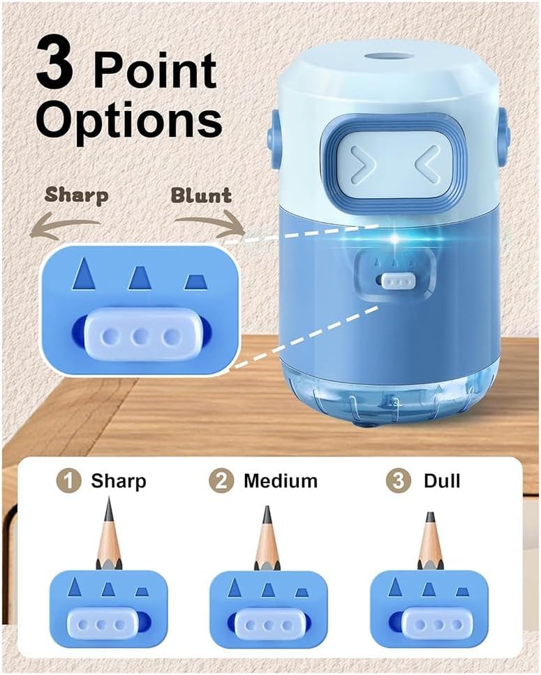 [Temperamatite completamente automatico - libere] Temperamatite elettrico che i bambini possono usare da soli! Basta inserire la matita e attendere 3-5 secondi, dopodiché si affilerà alla perfezione e verrà espulsa automaticamente. Il design touchless previene gli infortuni, offrendo ai genitori la massima tranquillità. Crediamo che nessun bambino possa resistere a un piccolo regalo così carino e facile da usare! [3 impostazioni di affilatura: Affilata, Media e Smussata] Con 3 impostazioni, questo temperamatite per bambini soddisfa tutte le esigenze quotidiane. I bambini possono usare la punta media per i compiti, la punta fine per disegnare e la punta smussata per colorare. Insegnanti e genitori non dovranno più temperare le matite per i loro figli! [Temperamatite ricaricabile] Con una potente batteria da 2000 mAh, questo temperamatite può temperare fino a 650 matite con una singola carica. Che tu stia disegnando, scrivendo a casa o facendo schizzi all'aperto, non dovrai preoccuparti della durata della batteria. Per una durata ottimale della batteria, si consiglia di utilizzare un caricabatterie standard (5 V 2 A). [Adatto a matite di dimensioni e forme] Questo temperamatite elettrico di grande diametro per casa/scuola funziona con il 99% delle matite (6-8 mm), maneggiando facilmente matite triangolari, esagonali e rotonde! Inserire la matita in verticale per garantire un'affilatura uniforme (non adatto a matite con anima morbida). [Sicuro e facile da usare] Non ci sono lame affilate esposte ai bambini, offrendo ai genitori tranquillità e consentendo ai bambini di usarle in sicurezza. Questo affilatore è dotato di un ampio contenitore per i trucioli, che ne facilita la pulizia e la manutenzione dopo l'uso.