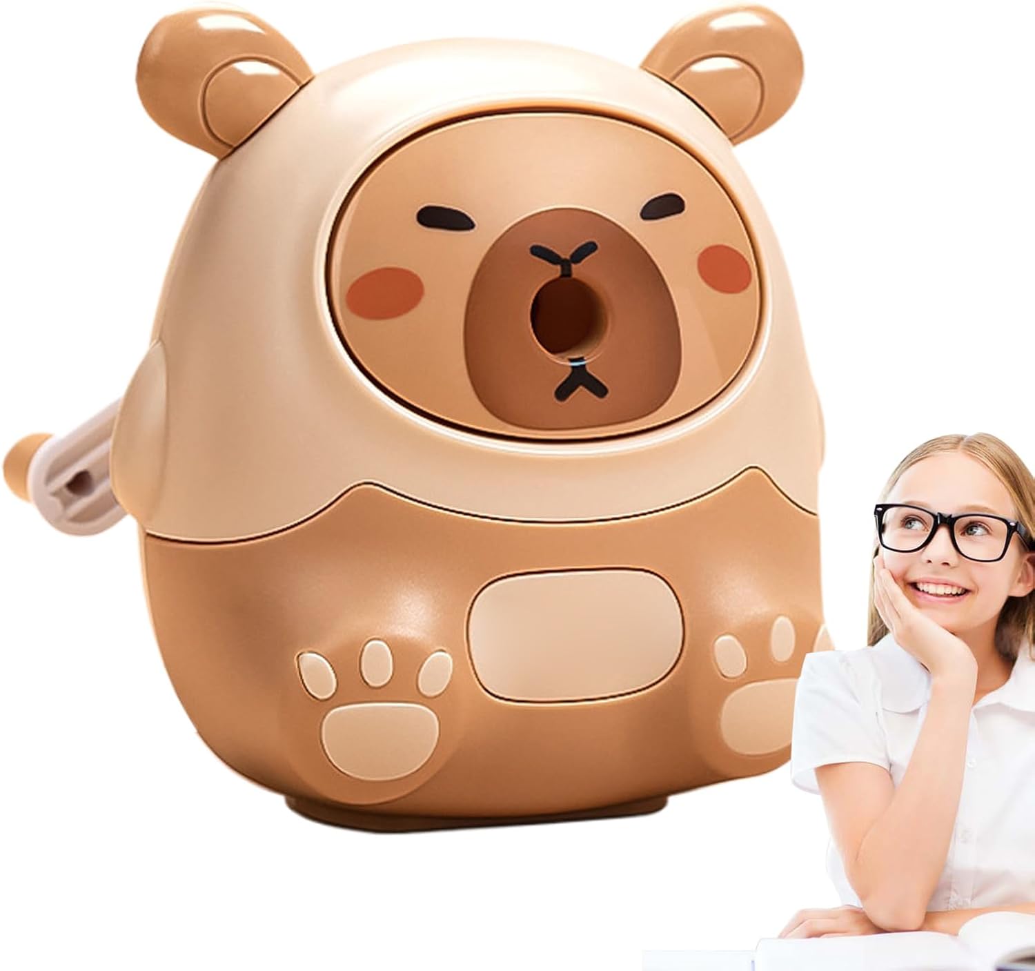 4. Caricamento Automatico: La funzione auto-feed gestisce con facilità matite da 6-8mm, minimizzando lo sforzo durante l'uso. Il tagliente in lega rimovibile garantisce un'affilatura efficace per una lunga durata del temperamatite, ideale per un utilizzo quotidiano. Sicurezza e Stabilità: Base con gommini morbidi antiscivolo garantisce ottimale su qualsiasi superficie, permettendo ai bambini di affilare matite in totale sicurezza senza spostamenti accidentali durante l'uso Manutenzione semplice: Il design antiversamento sicuro e il cassetto capiente per i trucioli rendono la pulizia di questo temperamatite veloce e pratica, permettendo ai bambini di mantenere l'area ordinata senza Costruzione duratura: Prodotto in ABS, il temperamatite offre durabilità a lungo termine grazie al design antiurto e alla struttura robusta, assicurando prestazioni costanti per le attività quotidiane dei bambini Strumento divertente e pratico: Con il suo adorabile design a carpincho, questo affilamatite rende lo studio e il lavoro più allegri e creativi, per gli studenti che amano un tocco di originalità