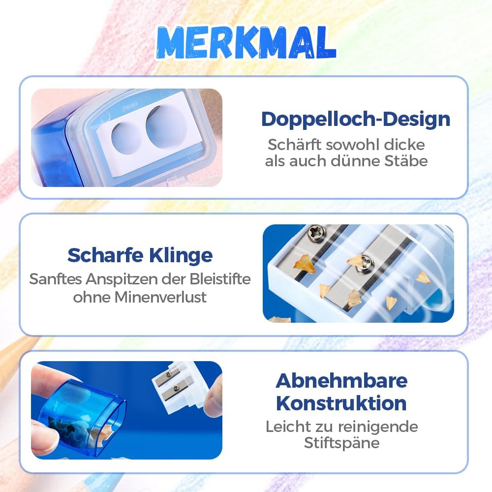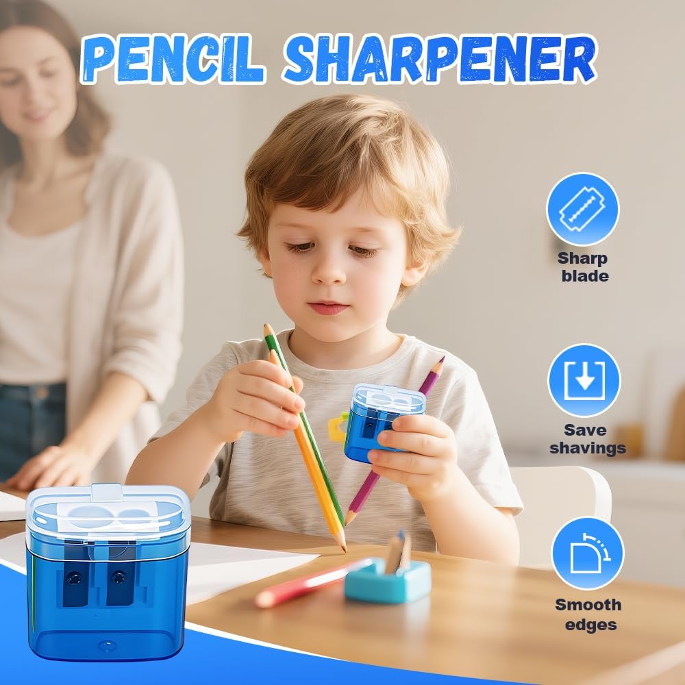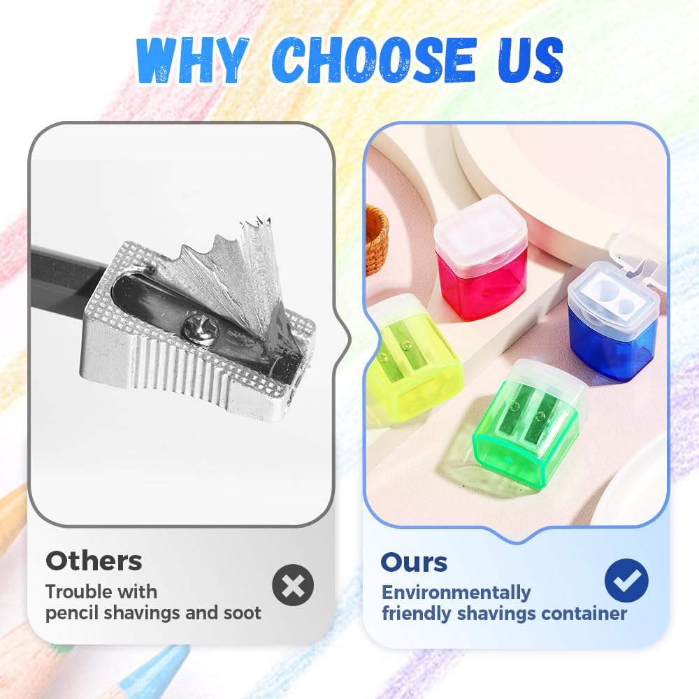 Comodo design a 2 fori: questo temperamatite a 2 fori si adatta sia alle matite standard che alle matite colorate più grandi, rendendolo il temperamatite perfetto per scuola, casa o ufficio. Perfetto per bambini e aule: progettato come temperamatite manuale per bambini, questo temperamatite in classe è sicuro, facile da usare e ideale per forniture scolastiche o progetti artistici. Coperto per meno disordine: il temperamatite con coperchio mantiene i trucioli ordinatamente contenuti, in modo che la scrivania, lo zaino o l'astuccio rimangano puliti, perfetto come sacapuntas con tapa per l'uso quotidiano. Portatile e compatto: questo temperamatite portatile è abbastanza piccolo da essere portato ovunque, ma abbastanza resistente per l'affilatura quotidiana, ideale come mini temperamatite per viaggi o studio. Colori vivaci e divertenti: ogni set di 2/4 temperamatite è disponibile in tonalità vivaci assortite per rendere la scrittura e il disegno più piacevoli: ottimo temperamatite per bambini o adulti creativi.