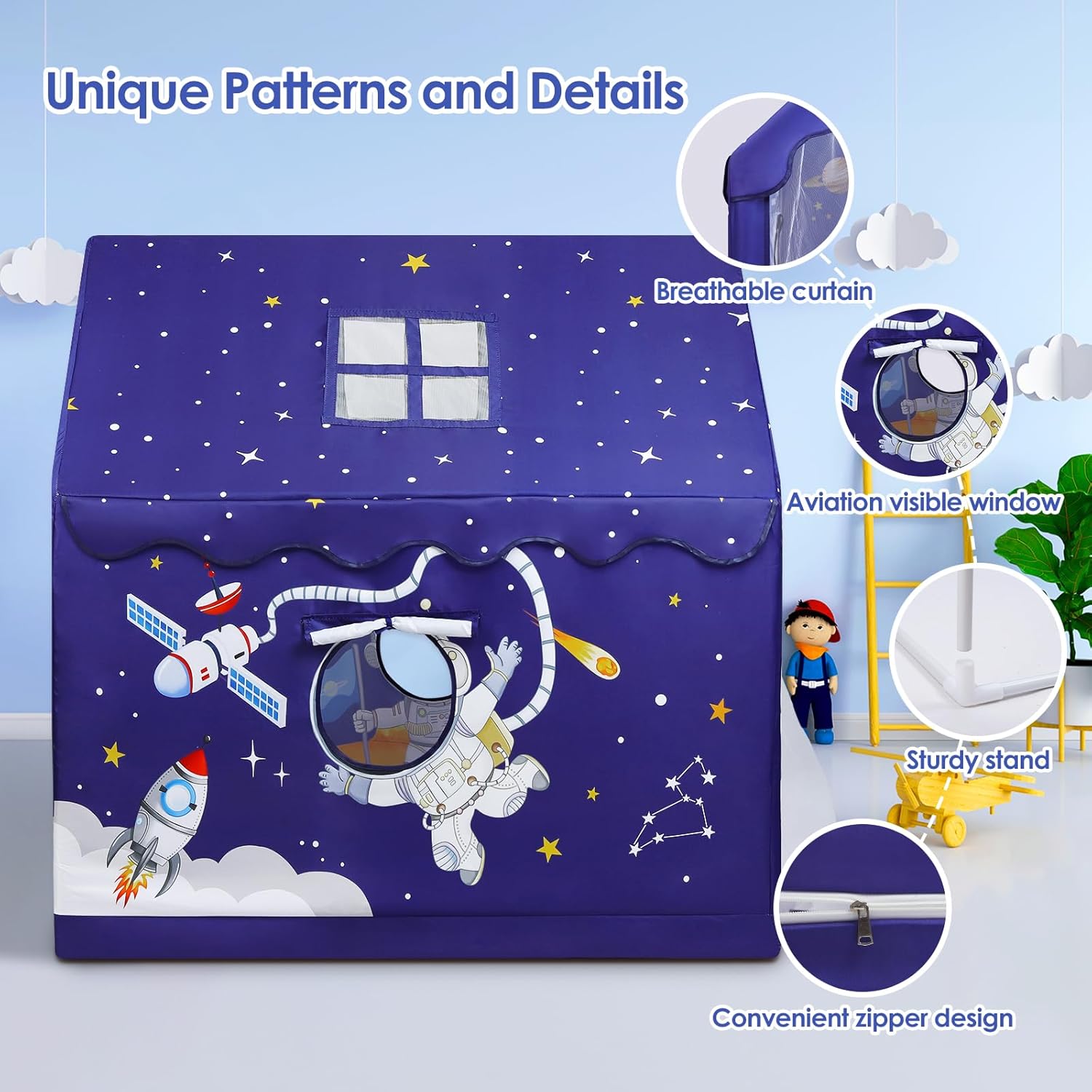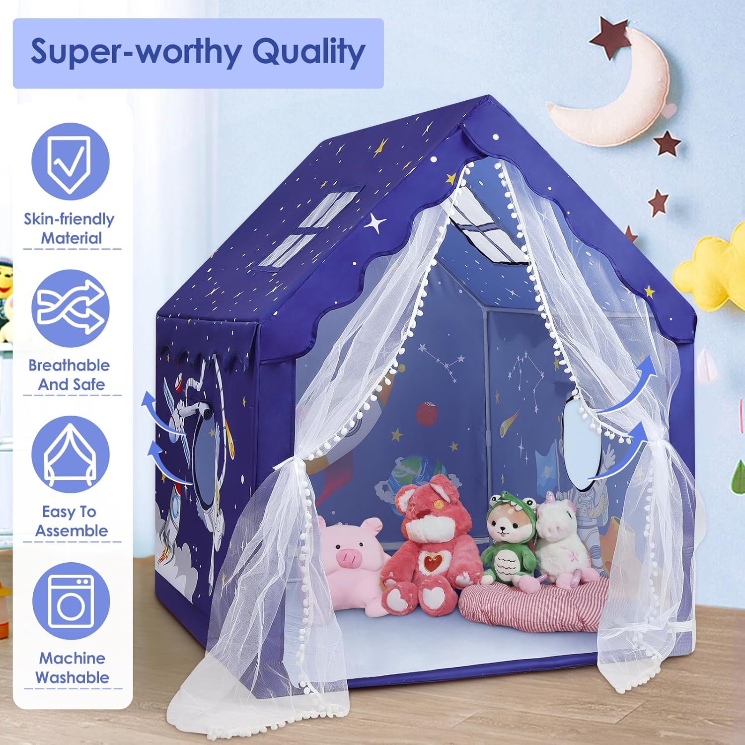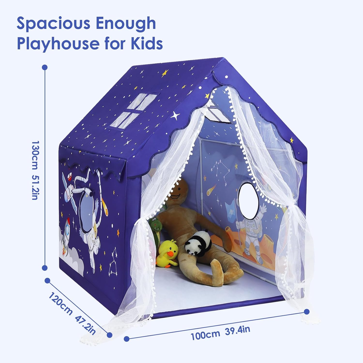 【Grande Dimensione】La tenda da gioco è 100 × 120 × 130 cm, che fornisce un ampio spazio per i bambini a giocare, leggere o dormire e può ospitare due o tre bambini allo stesso tempo, anche gli adulti possono entrare nella casa dei bambini facilmente. 【Materiale di Alta Qualità】Sia la scelta dei materiali che la maestria del cucito sono al di sopra dello standard normale.Il materiale non ha odore, è sicuro per i bambini e molto morbido al tatto.Il supporto robusto rende la tenda molto più robusta e i bambini possono giocare in essa liberamente. 【Veloce da Montare】Questa casetta per bambini viene fornita con un'istruzione dettagliata passo-passo.Non sono necessari strumenti, è possibile assemblare la tenda della casetta con facilità e rapidità. 【Design Creativo】A differenza delle normali casette a due finestre, ci sono totalmente 4 finestre (su e giù) incorporate, mantenendo la tenda interna per bambini più ventilata per giocare o dormire. 【Miglior Regalo per Bambini】La tenda da gioco per bambini stampata con astronauti e razzi e altri elementi stellari, carini e misteriosi, non solo può attirare l'attenzione dei bambini, ma anche fornire loro un luogo privato per intrattenere, leggere, giocare e giocare, è il perfetto regalo di compleanno e regalo di Natale per i bambini!