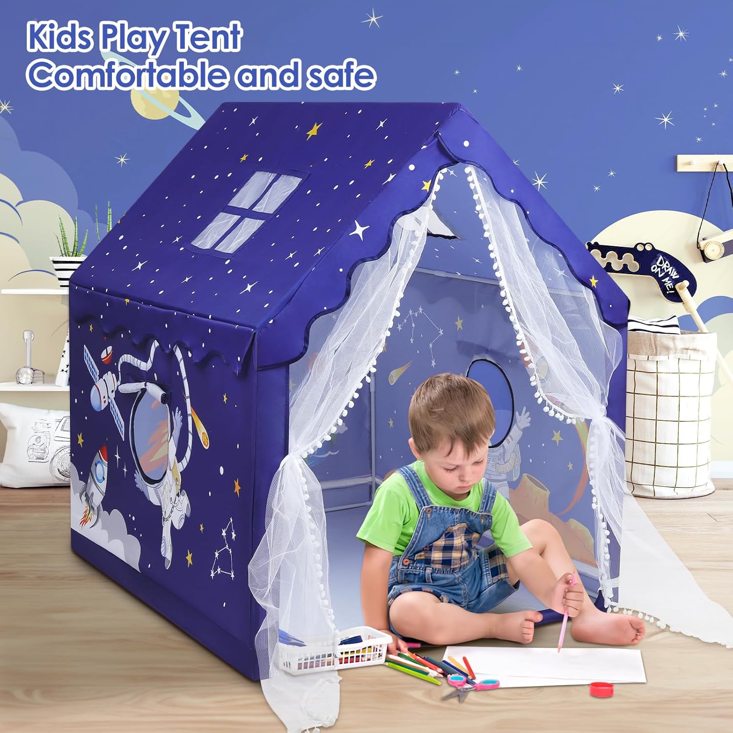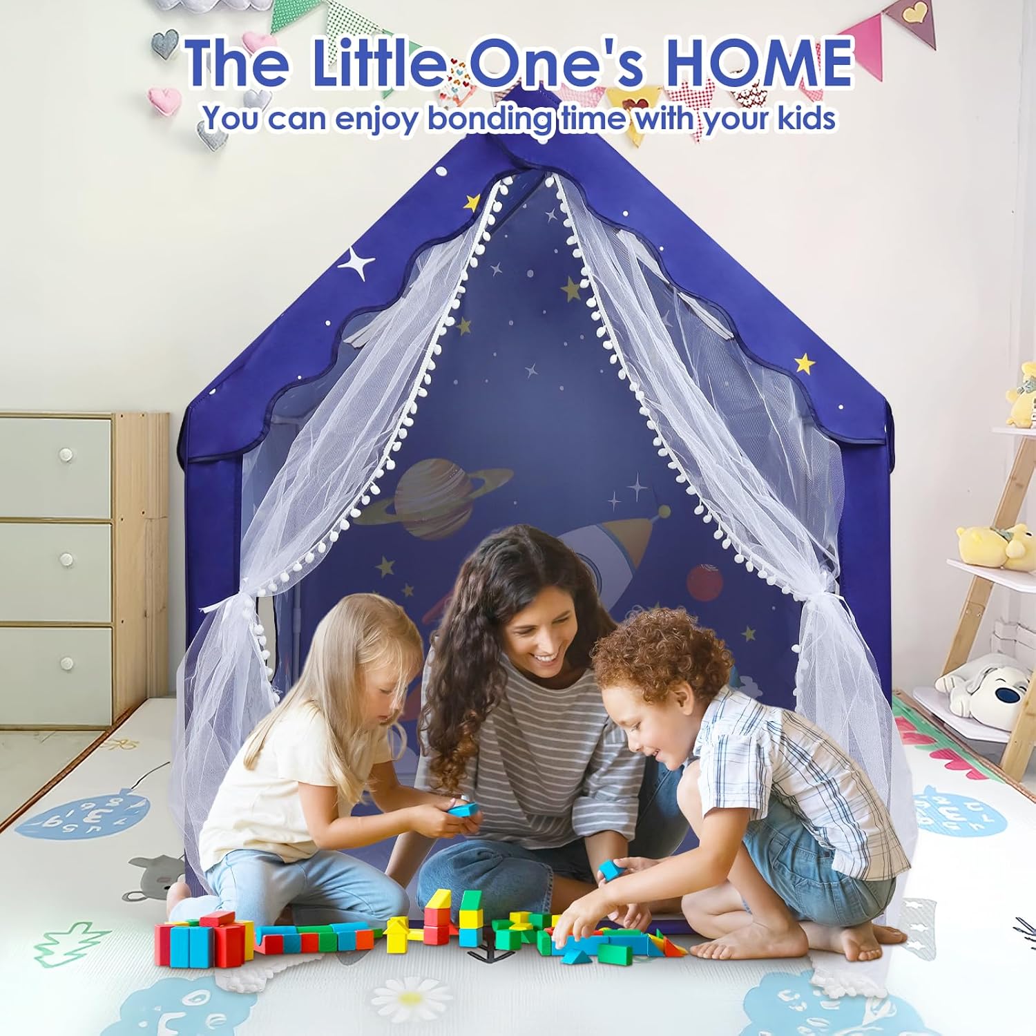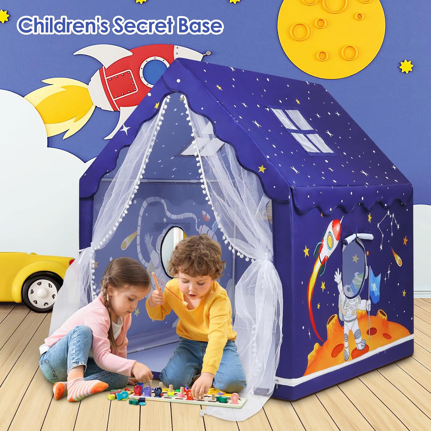【Grande Dimensione】La tenda da gioco è 100 × 120 × 130 cm, che fornisce un ampio spazio per i bambini a giocare, leggere o dormire e può ospitare due o tre bambini allo stesso tempo, anche gli adulti possono entrare nella casa dei bambini facilmente. 【Materiale di Alta Qualità】Sia la scelta dei materiali che la maestria del cucito sono al di sopra dello standard normale.Il materiale non ha odore, è sicuro per i bambini e molto morbido al tatto.Il supporto robusto rende la tenda molto più robusta e i bambini possono giocare in essa liberamente. 【Veloce da Montare】Questa casetta per bambini viene fornita con un'istruzione dettagliata passo-passo.Non sono necessari strumenti, è possibile assemblare la tenda della casetta con facilità e rapidità. 【Design Creativo】A differenza delle normali casette a due finestre, ci sono totalmente 4 finestre (su e giù) incorporate, mantenendo la tenda interna per bambini più ventilata per giocare o dormire. 【Miglior Regalo per Bambini】La tenda da gioco per bambini stampata con astronauti e razzi e altri elementi stellari, carini e misteriosi, non solo può attirare l'attenzione dei bambini, ma anche fornire loro un luogo privato per intrattenere, leggere, giocare e giocare, è il perfetto regalo di compleanno e regalo di Natale per i bambini!