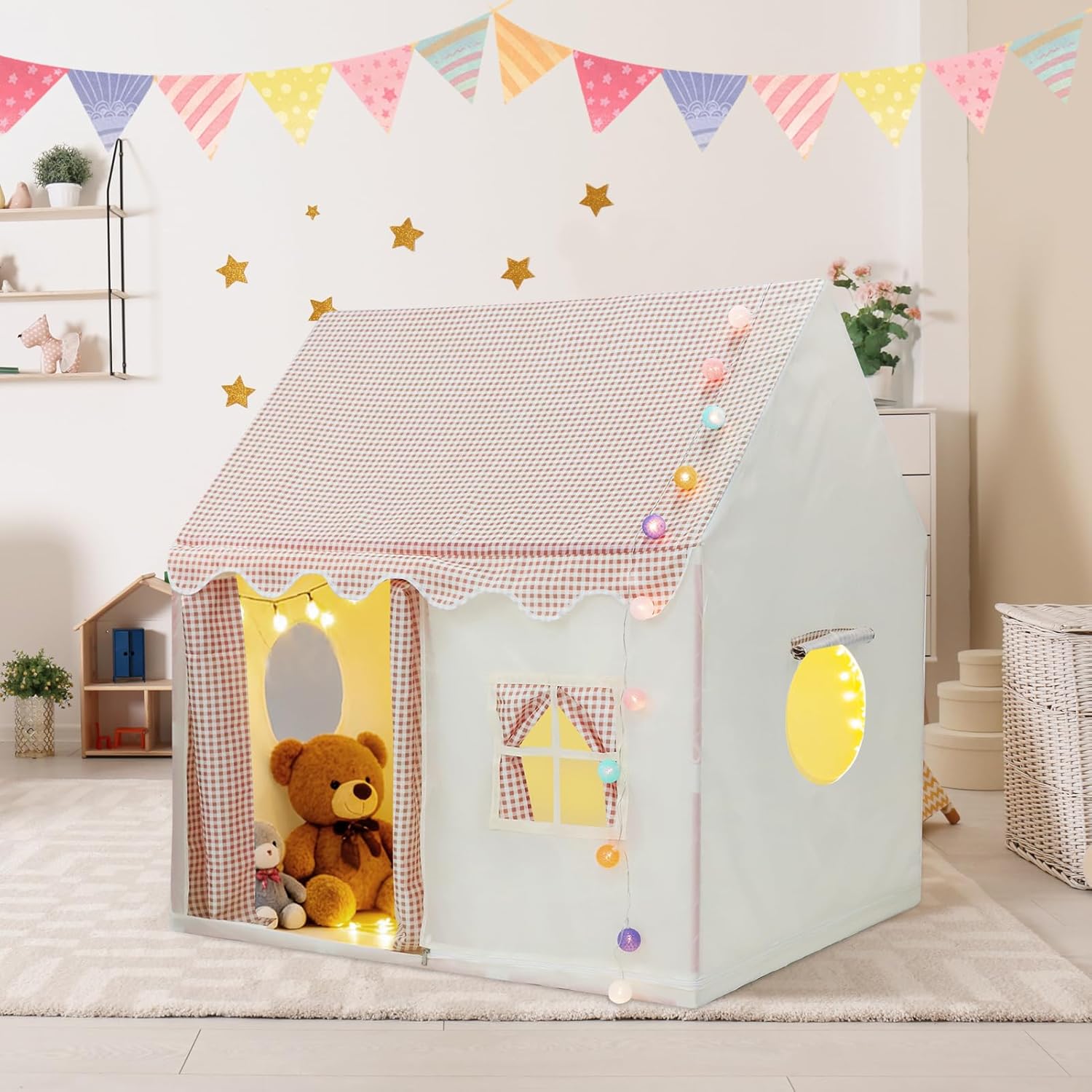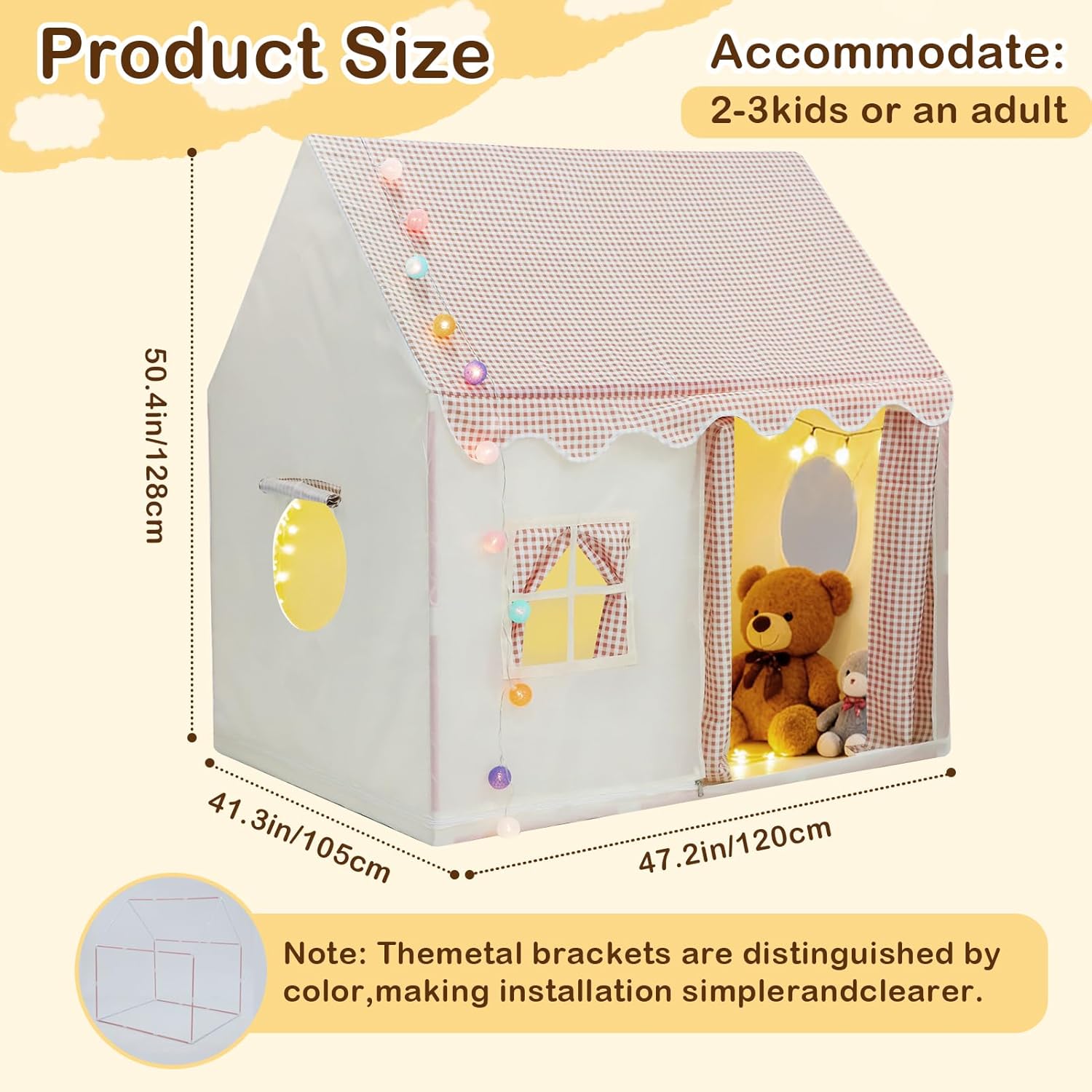 Design spazioso: lasciate che i vostri bambini si divertano in questa spaziosa tenda con dimensioni di 105 x 128 x 120 cm. È abbastanza grande per diverse bambole o 2 bambini che possono sdraiarsi comodamente insieme. Ideale per giocare in segreto con gli amici! MATERIALE IN TESSUTO SICURO: questa tenda di intrattenimento per bambini realizzata in tessuto di poliestere di alta qualità, durevole, resistente all'usura, inodore e sicuro per i bambini. Facile da montare: non sono necessari attrezzi speciali per un montaggio facile e veloce. Quando non in uso, si ripiega nella custodia senza occupare spazio. Leggero e portatile per uso interno ed esterno, che consente di utilizzare lo spazio in modo efficiente. Uso versatile: sicuro per feste di compleanno, parchi, picnic, cortili, parchi giochi, campeggio, gite e adatto per scuola, carnevale, giocare al chiuso e all'aperto. ZONA COMODITALE: i bellissimi colori attirano l'attenzione dei bambini e li motivano a costruire le tende e offrono loro spazio confortevole per giocare e rilassarsi.